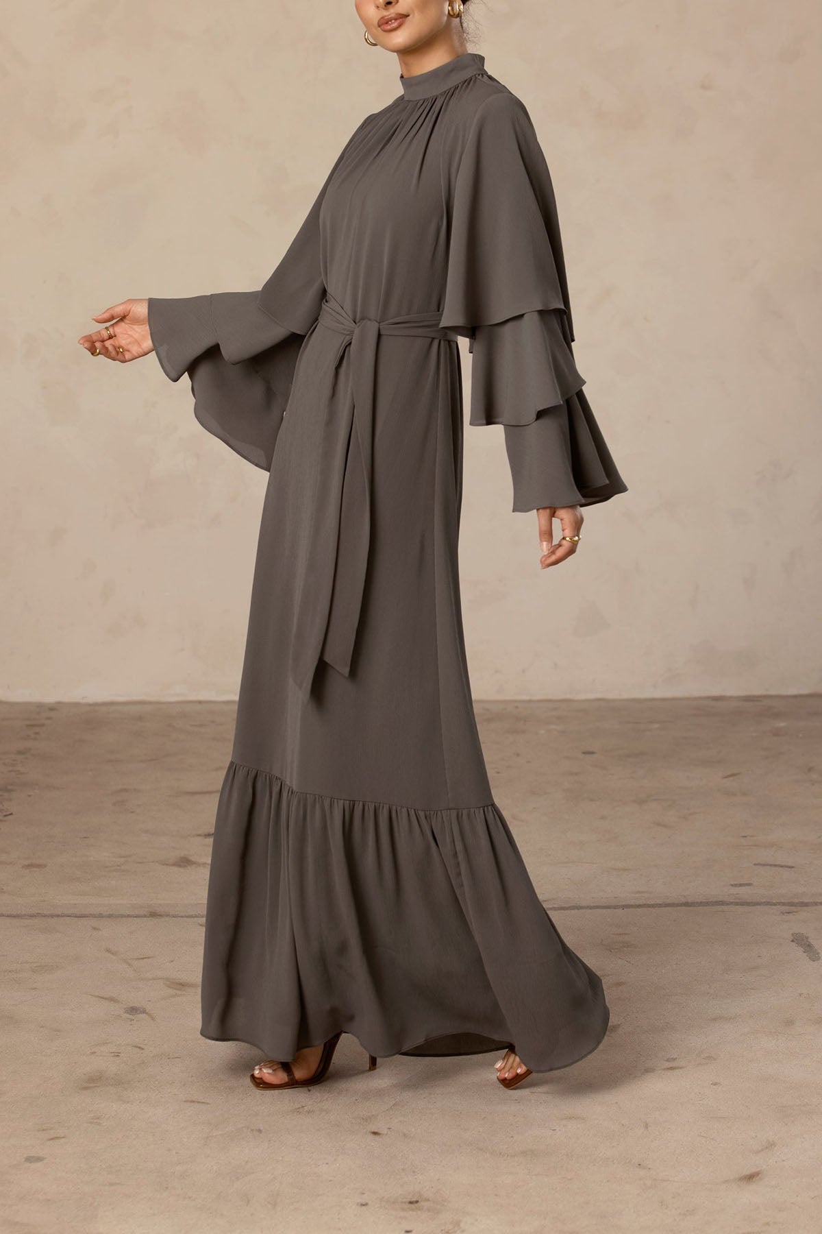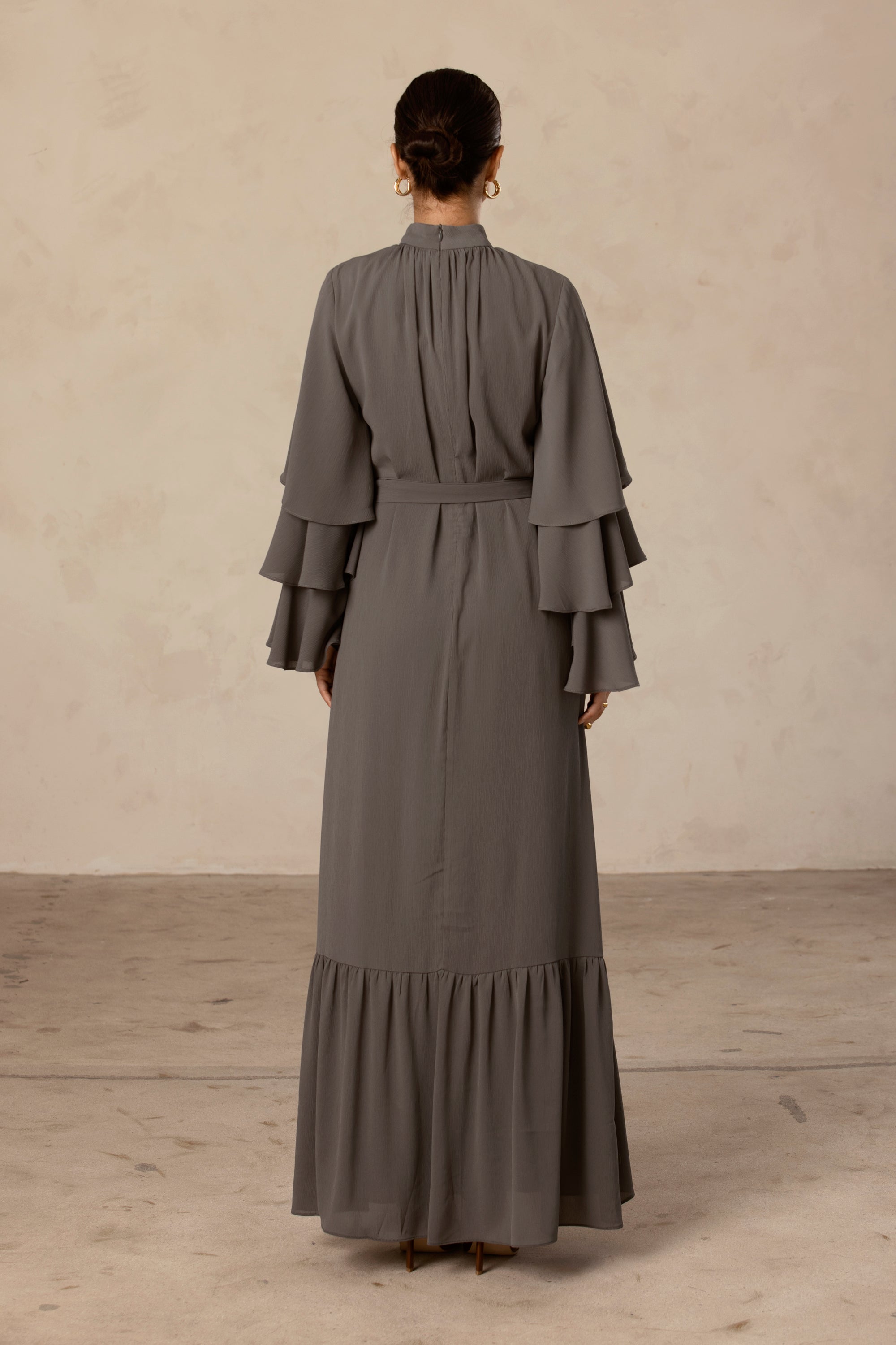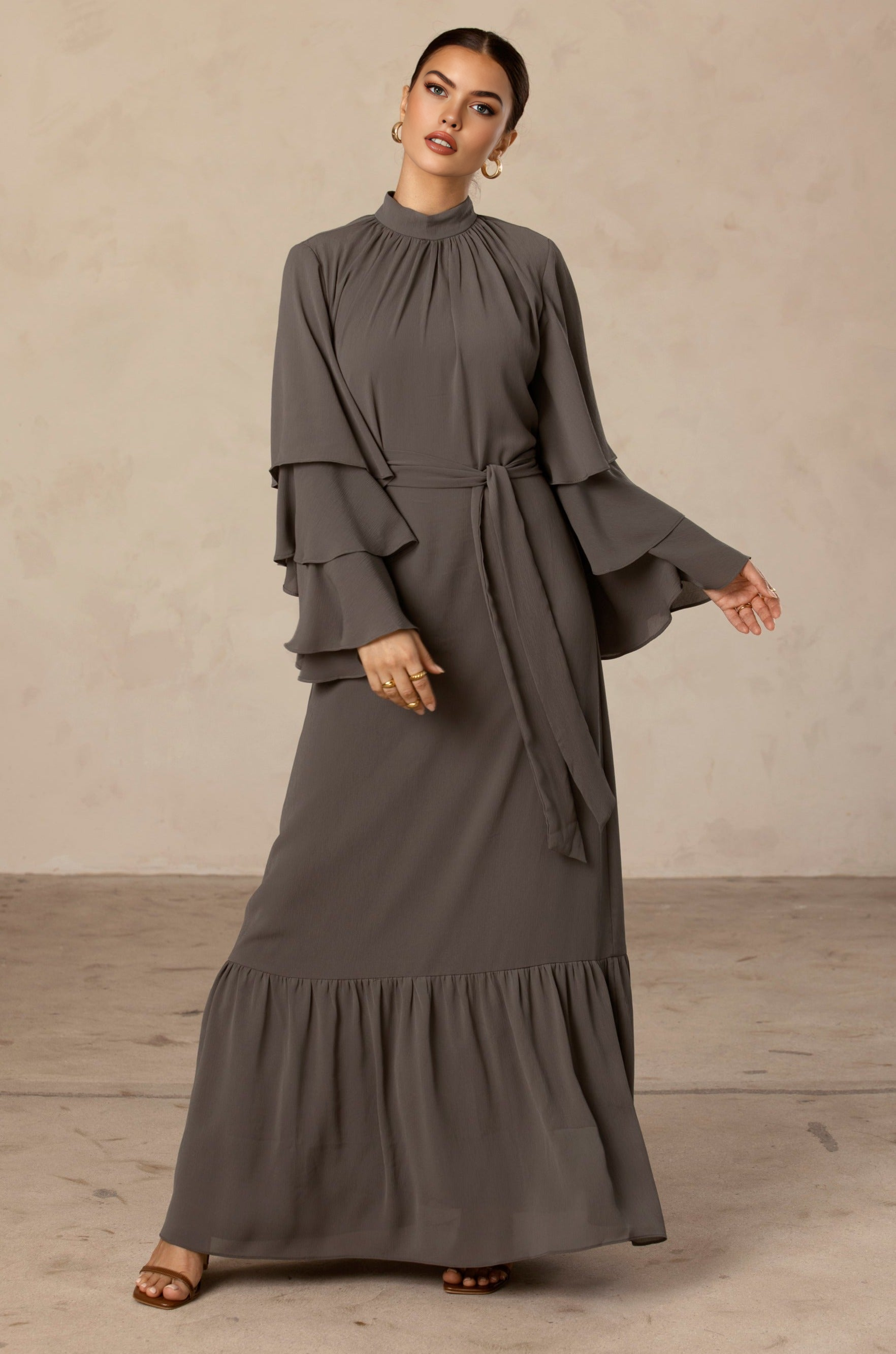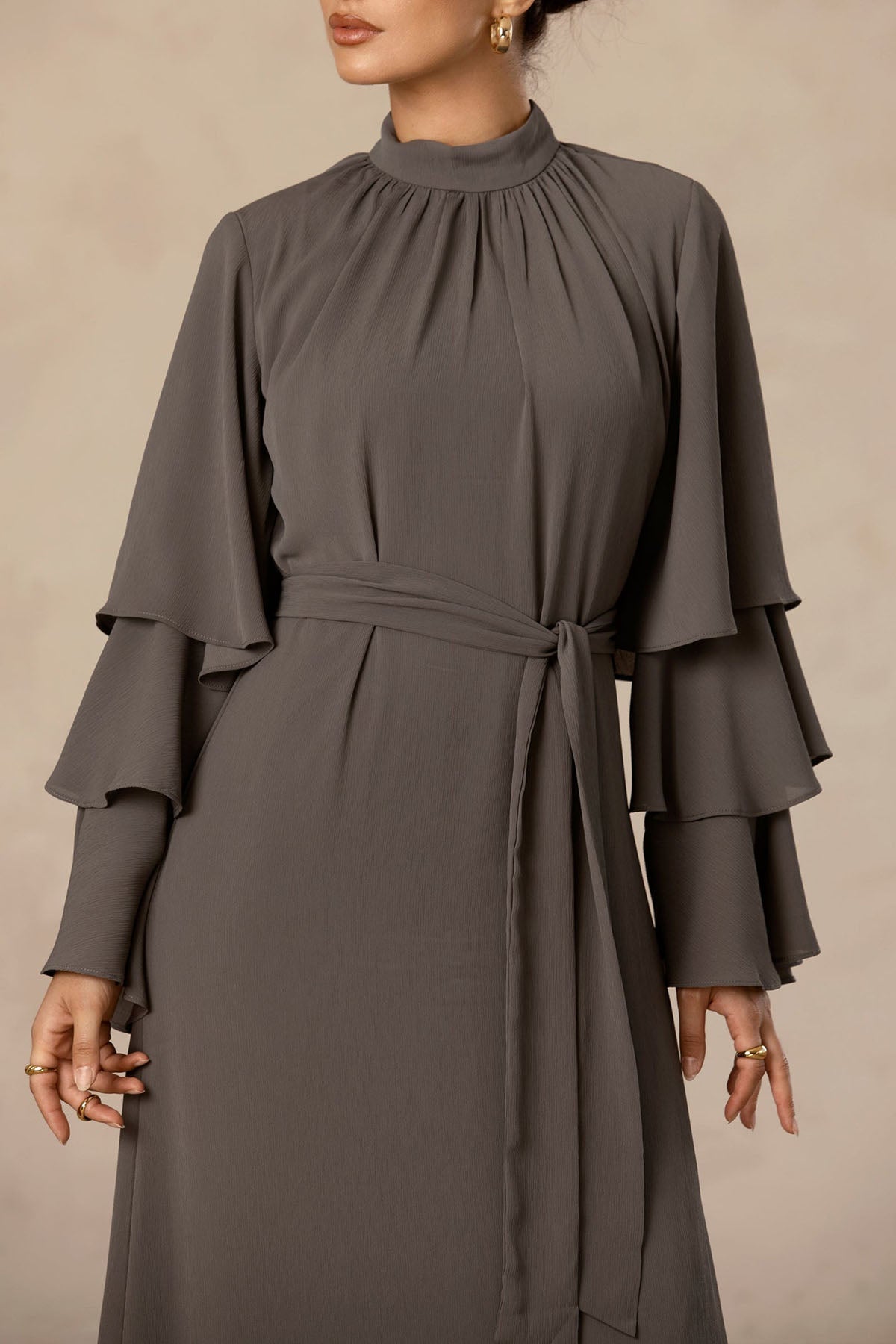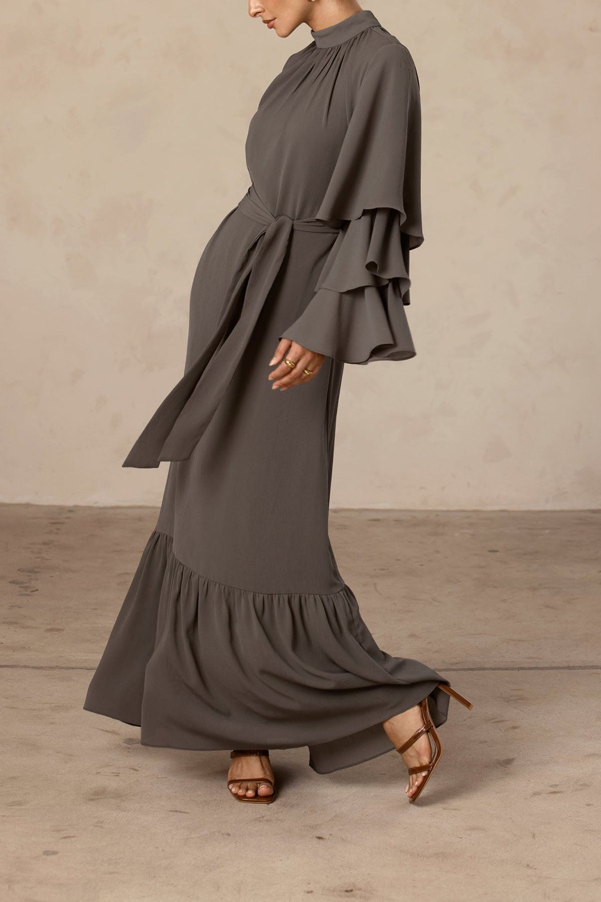 Chiara Ruffle Sleeve Textured Maxi Dress - Dark Olive
