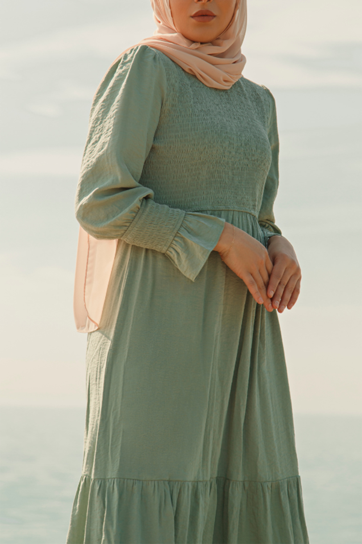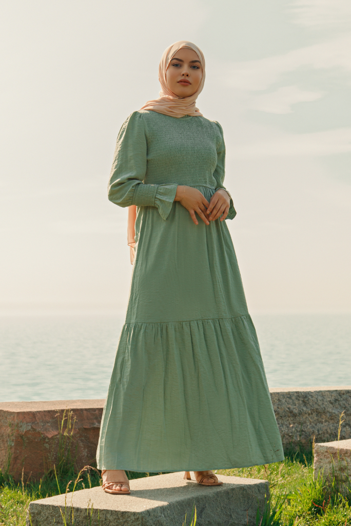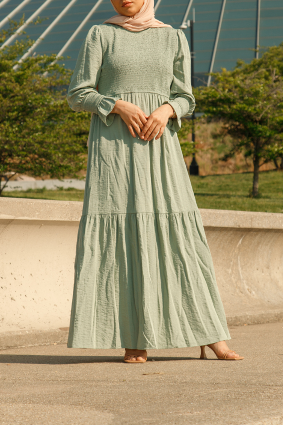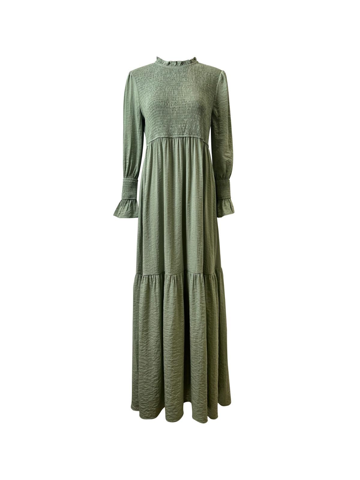 The perfect addition to your wardrobe this season. This dress is the perfect combination of fashion and comfort, ensuring you feel amazing and stay comfortable all day long. The stunning smocked detailing adds texture and dimension to the dress, while the twirl-worthy skirt will have you feeling like a queen. The high ruffle neckline and ruffled sleeves cuffs add an elegant touch to the overall look, making this dress perfect for any occasion.