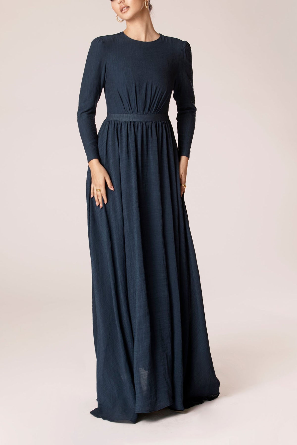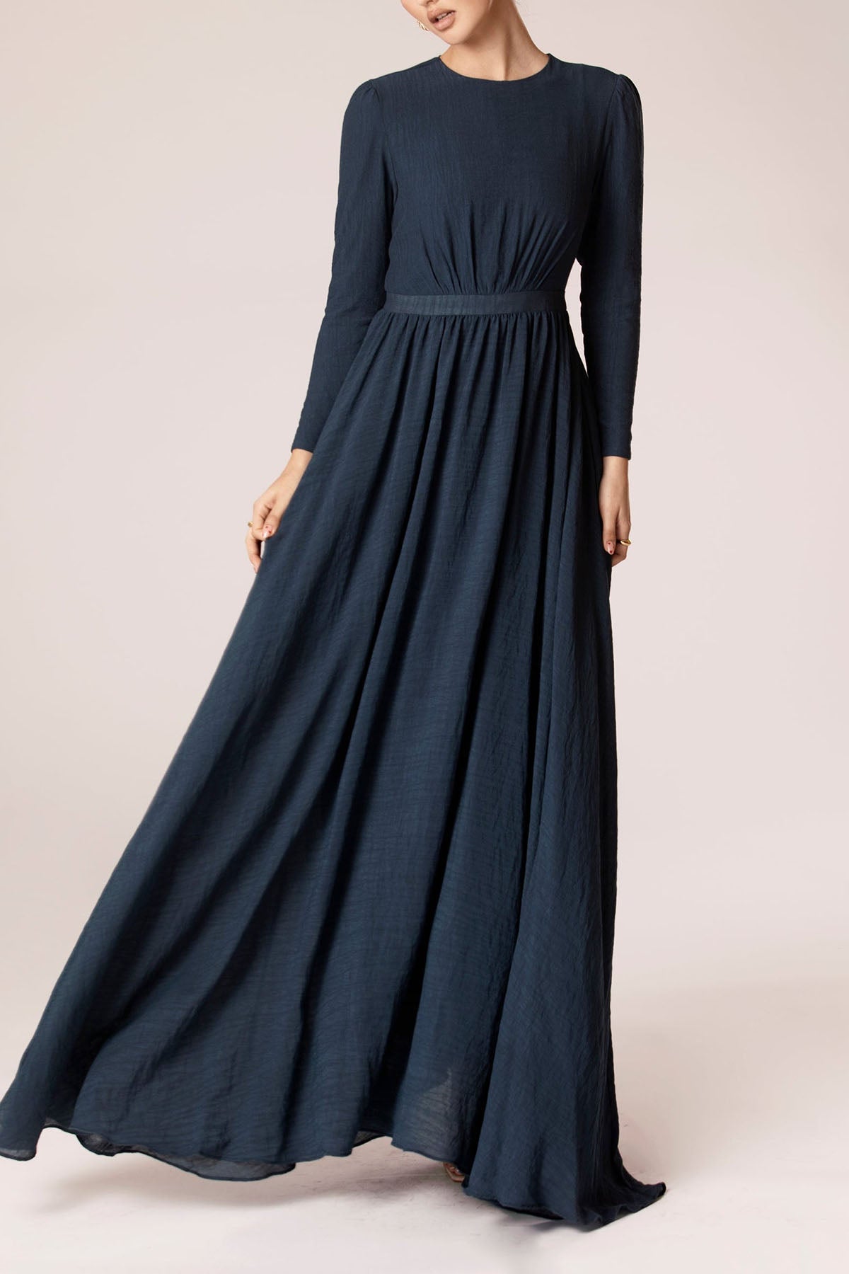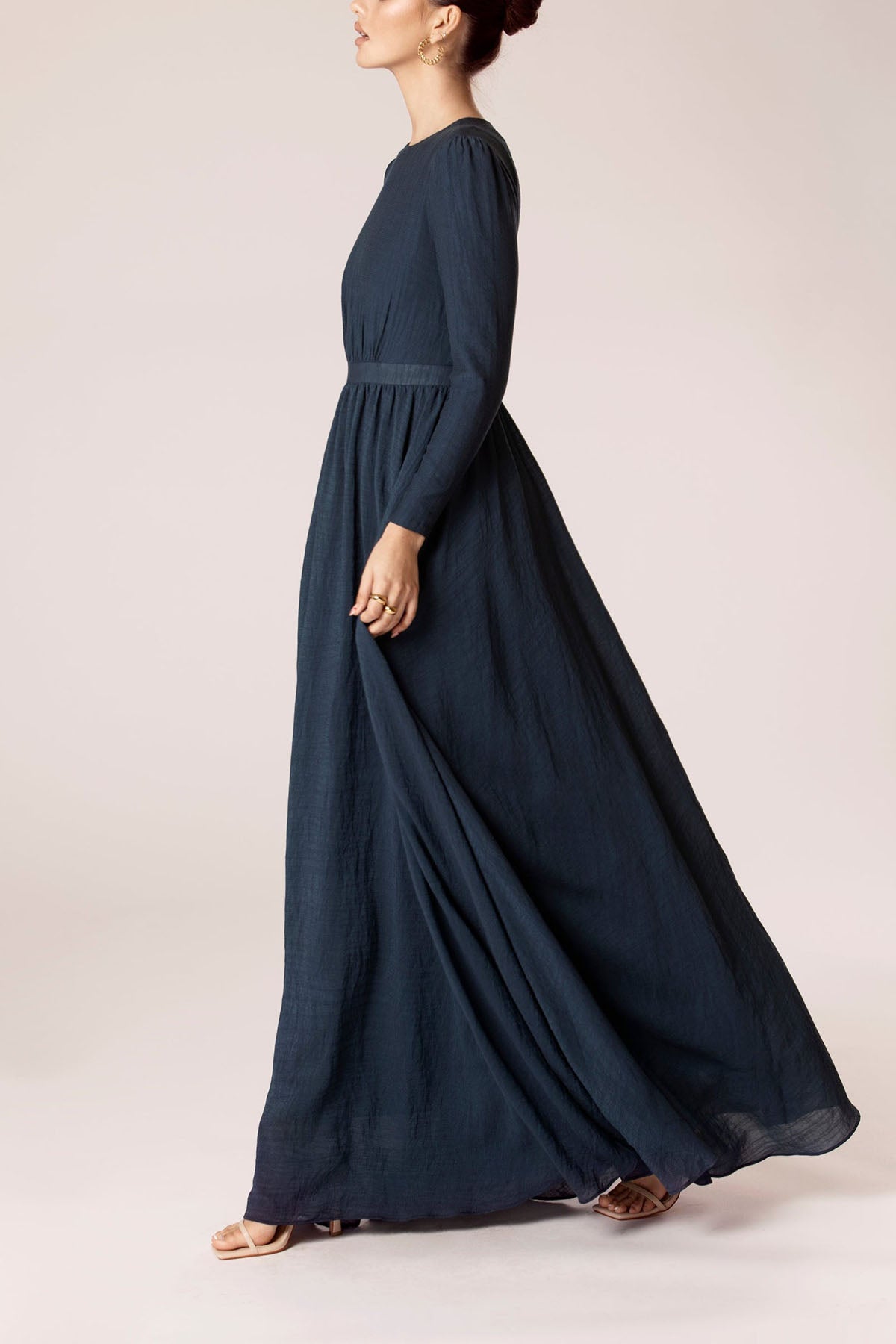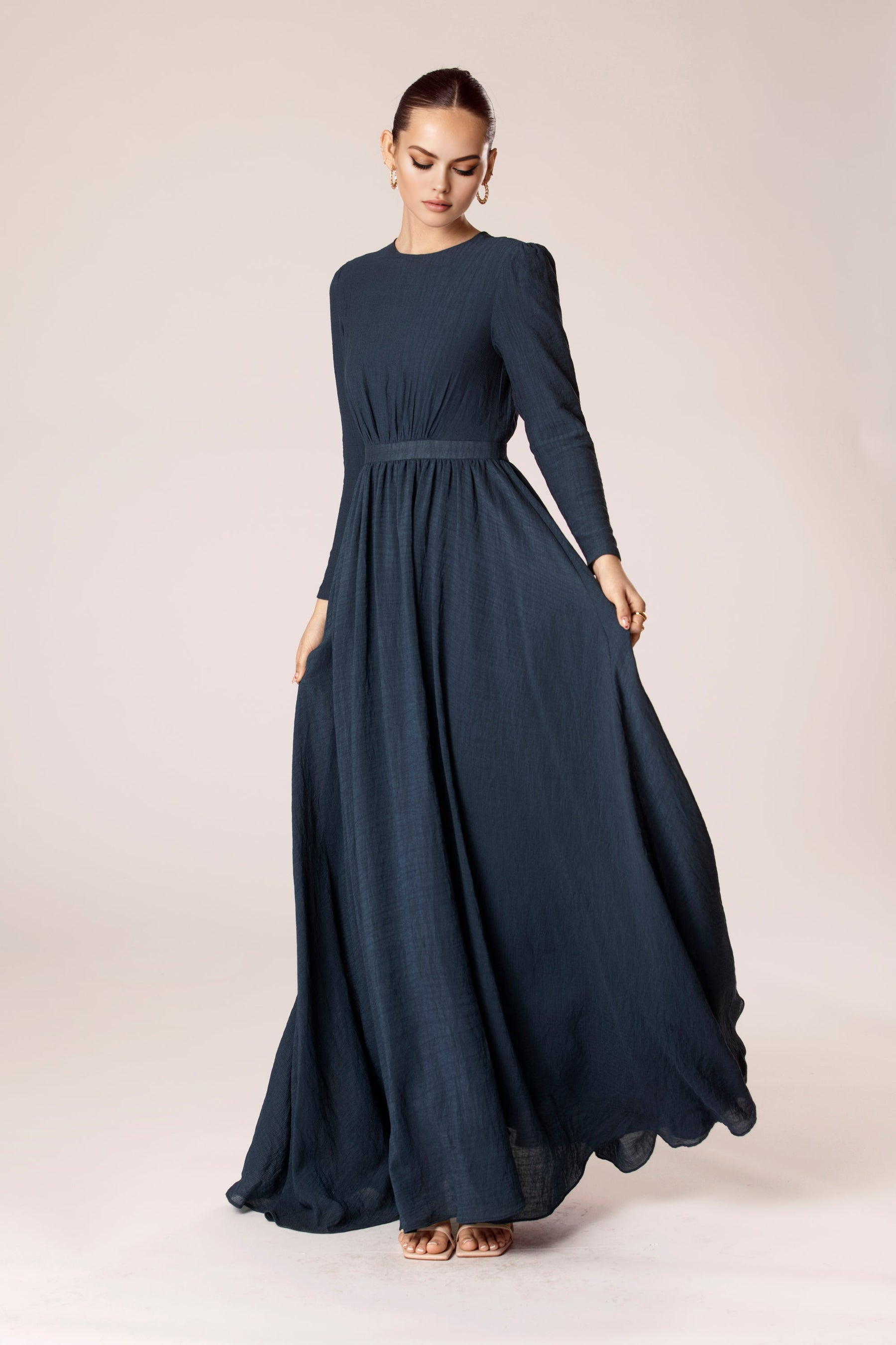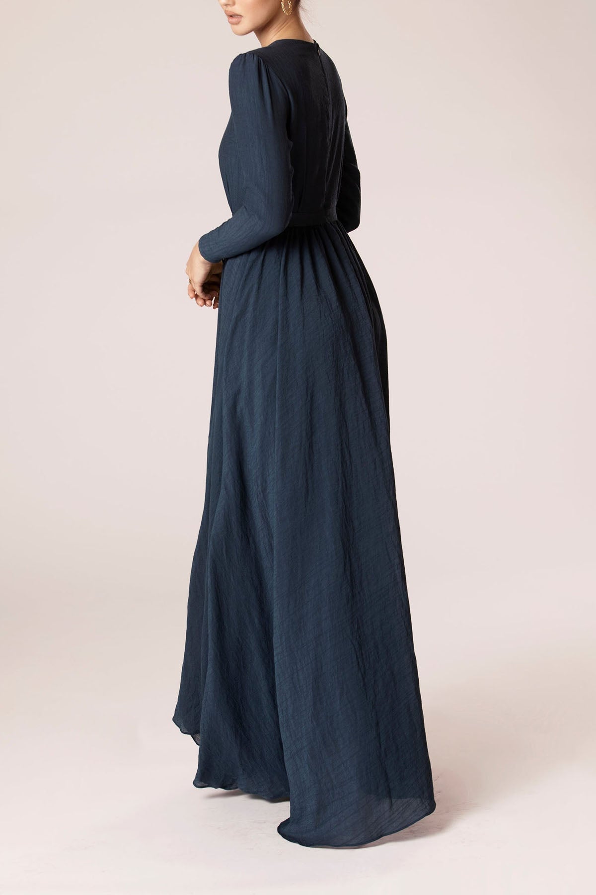 This textured gown features a modest a-line silhouette, asymmetrical hem, banded waist and hidden zipper sleeves.