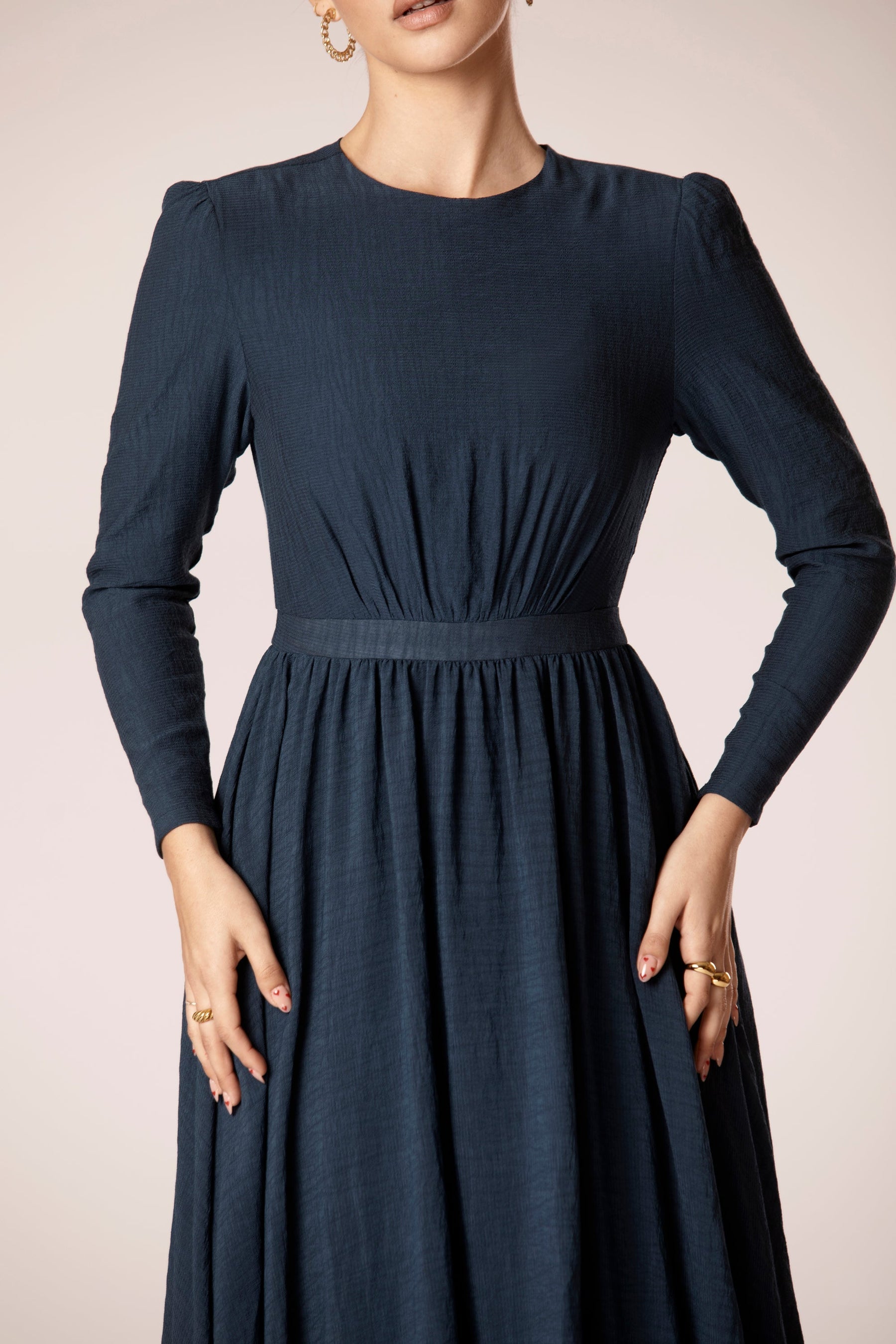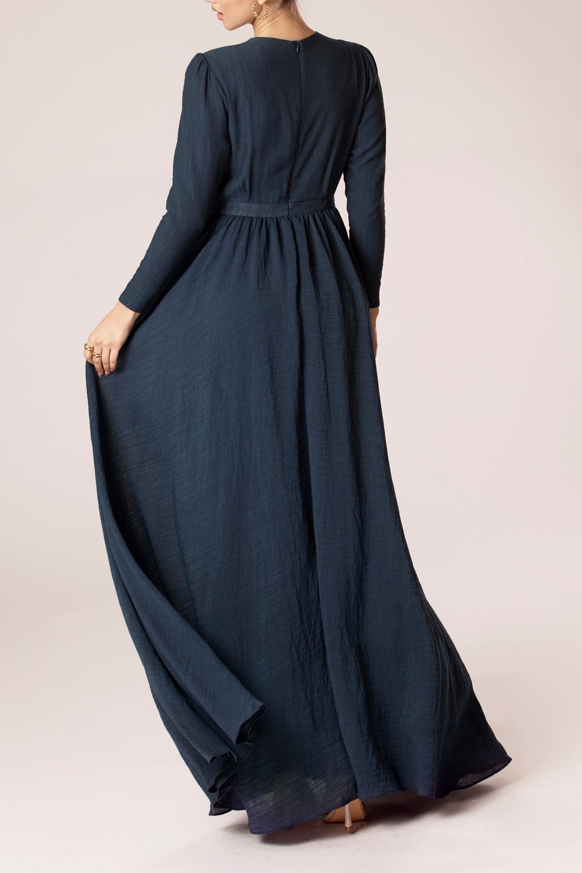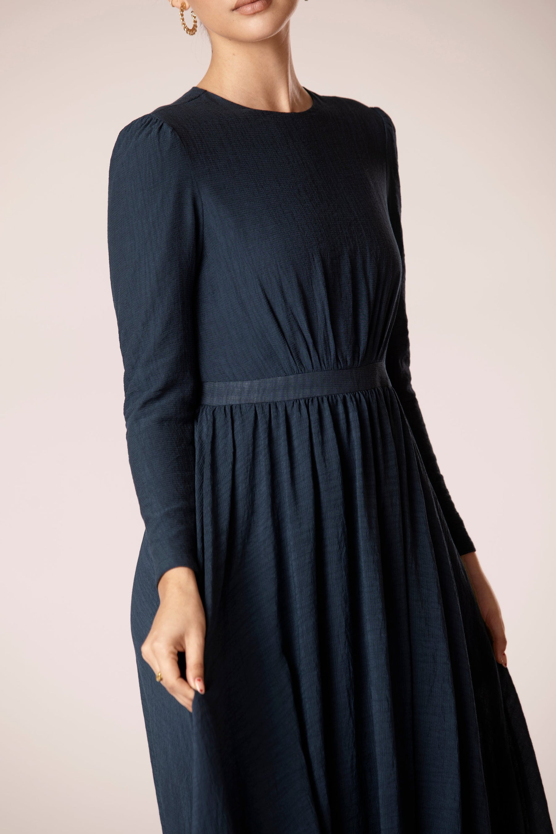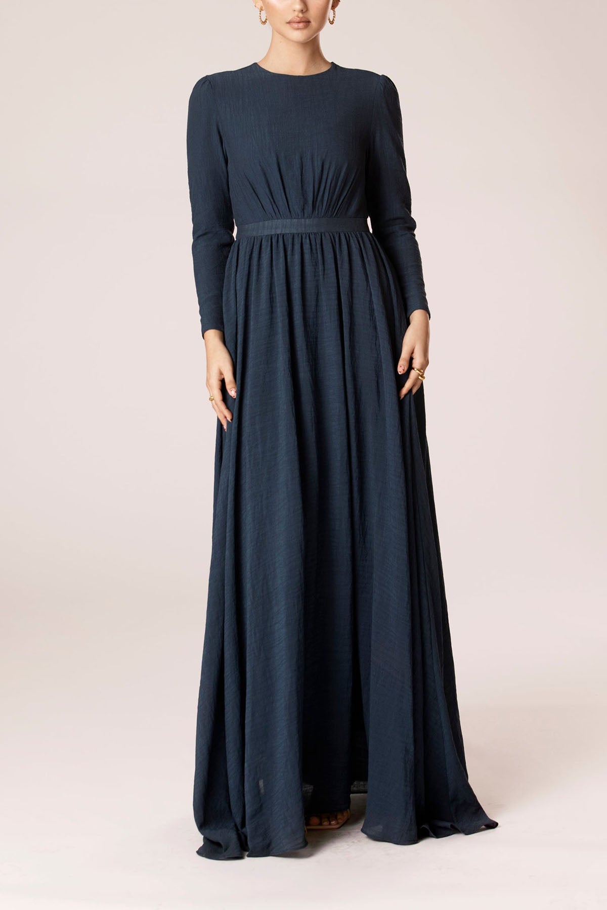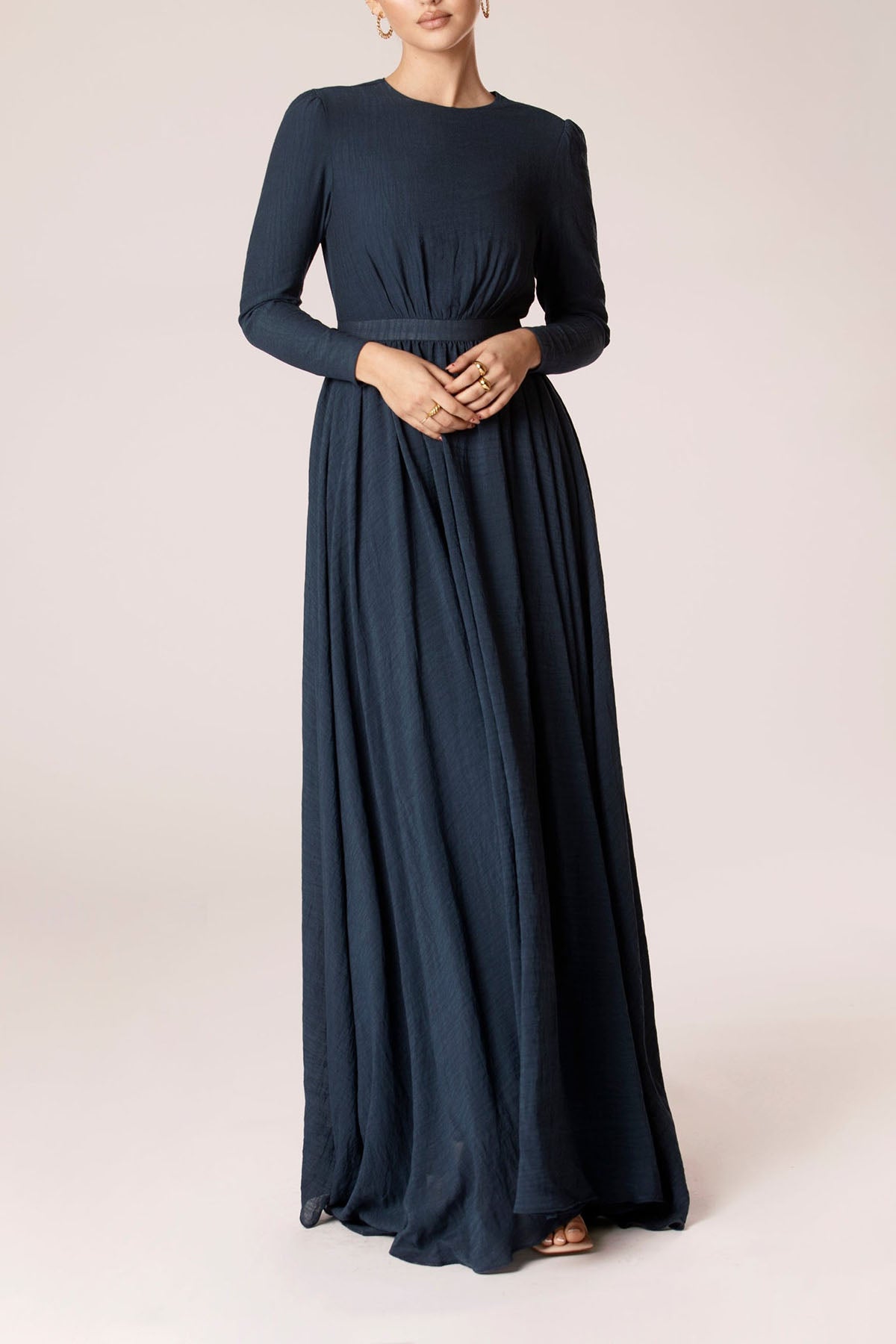 This textured gown features a modest a-line silhouette, asymmetrical hem, banded waist and hidden zipper sleeves.