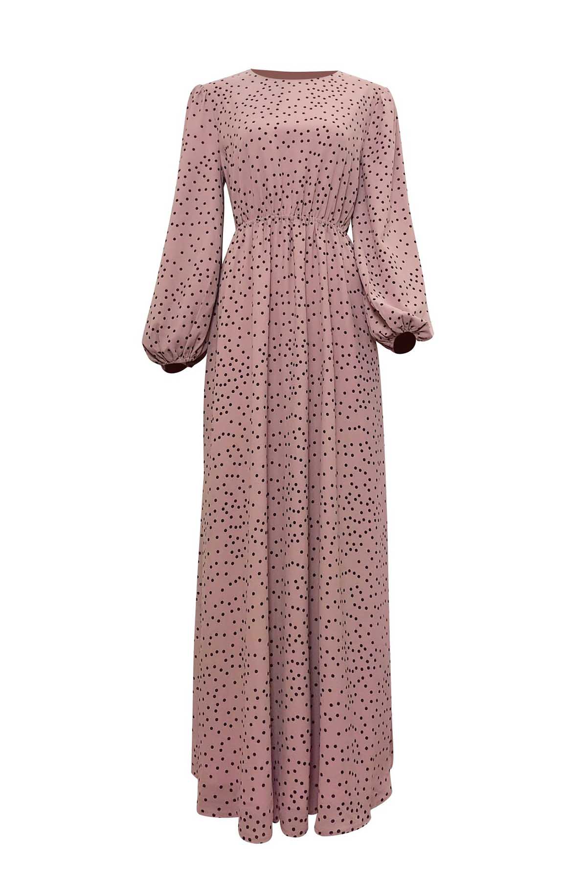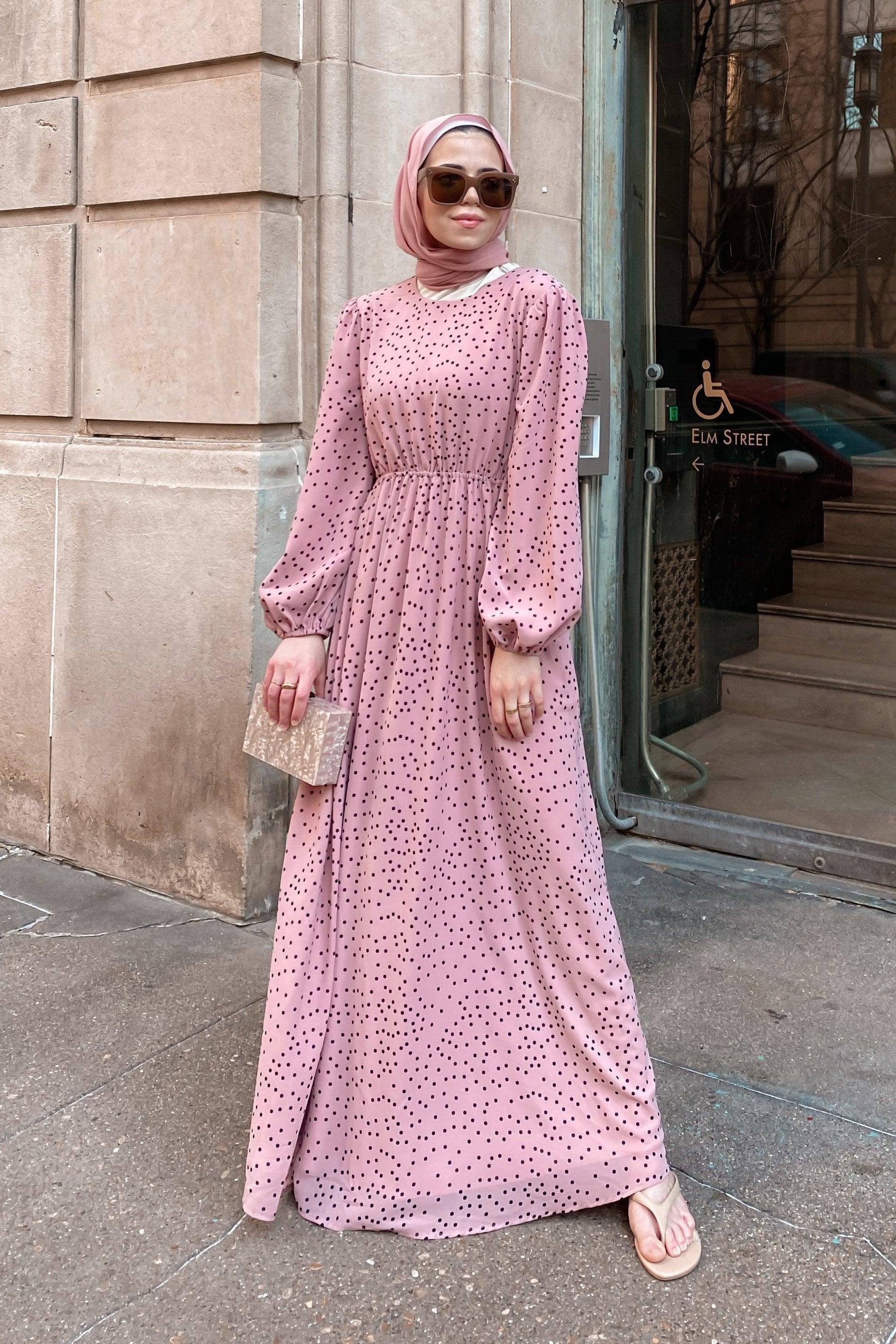 Elegantly polka dotted! This super soft and elegant speckled polka dress comes with cinched slightly ballooning peasant sleeves making pulling them up effortless. Rounded boat collar keeps you feeling open yet covered.
