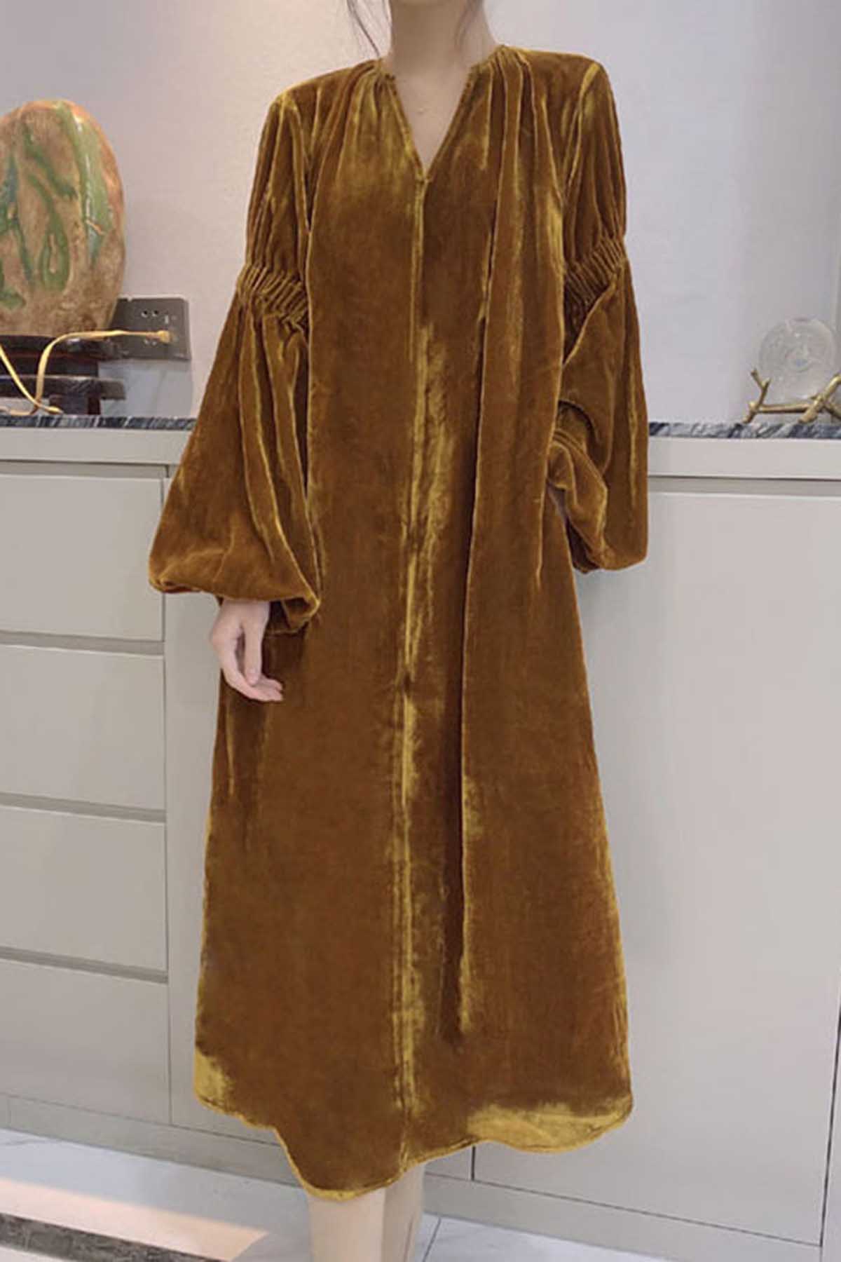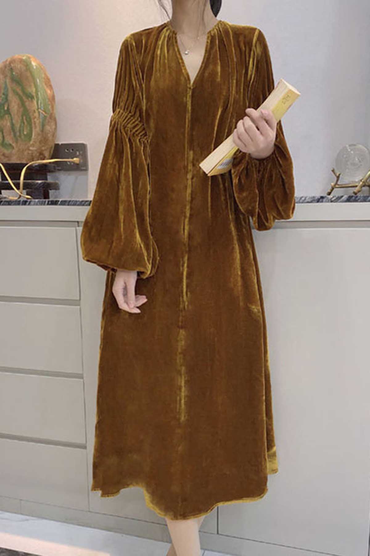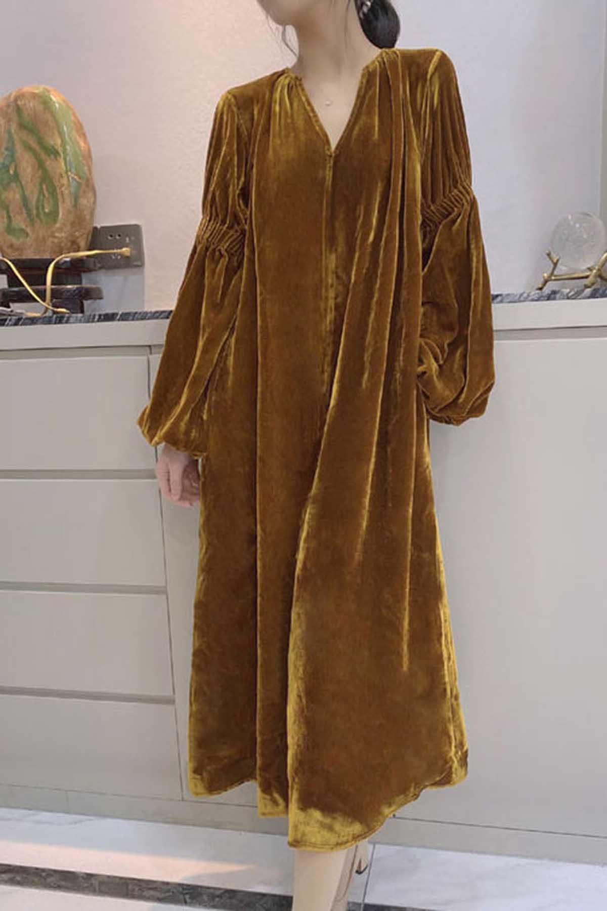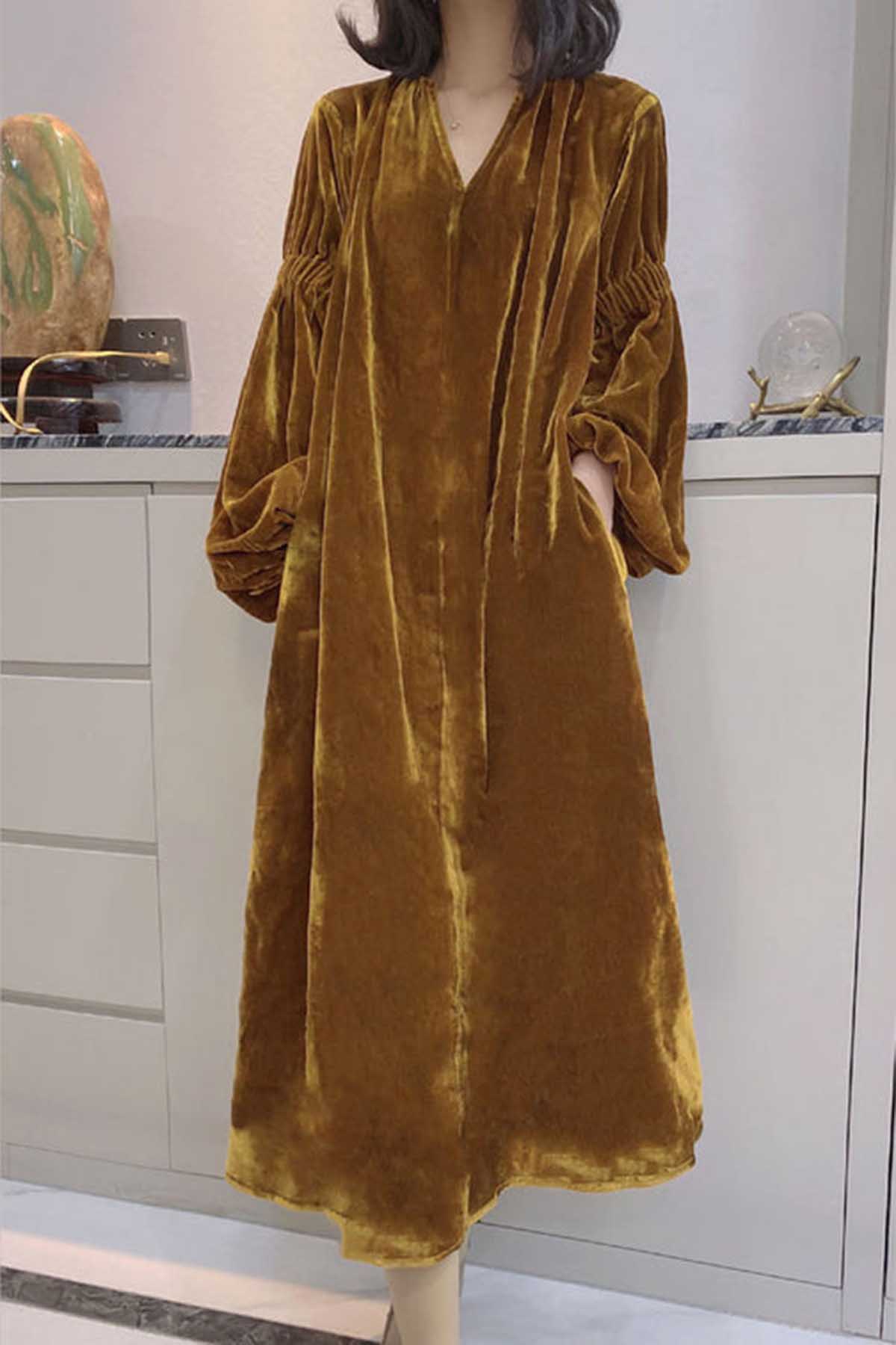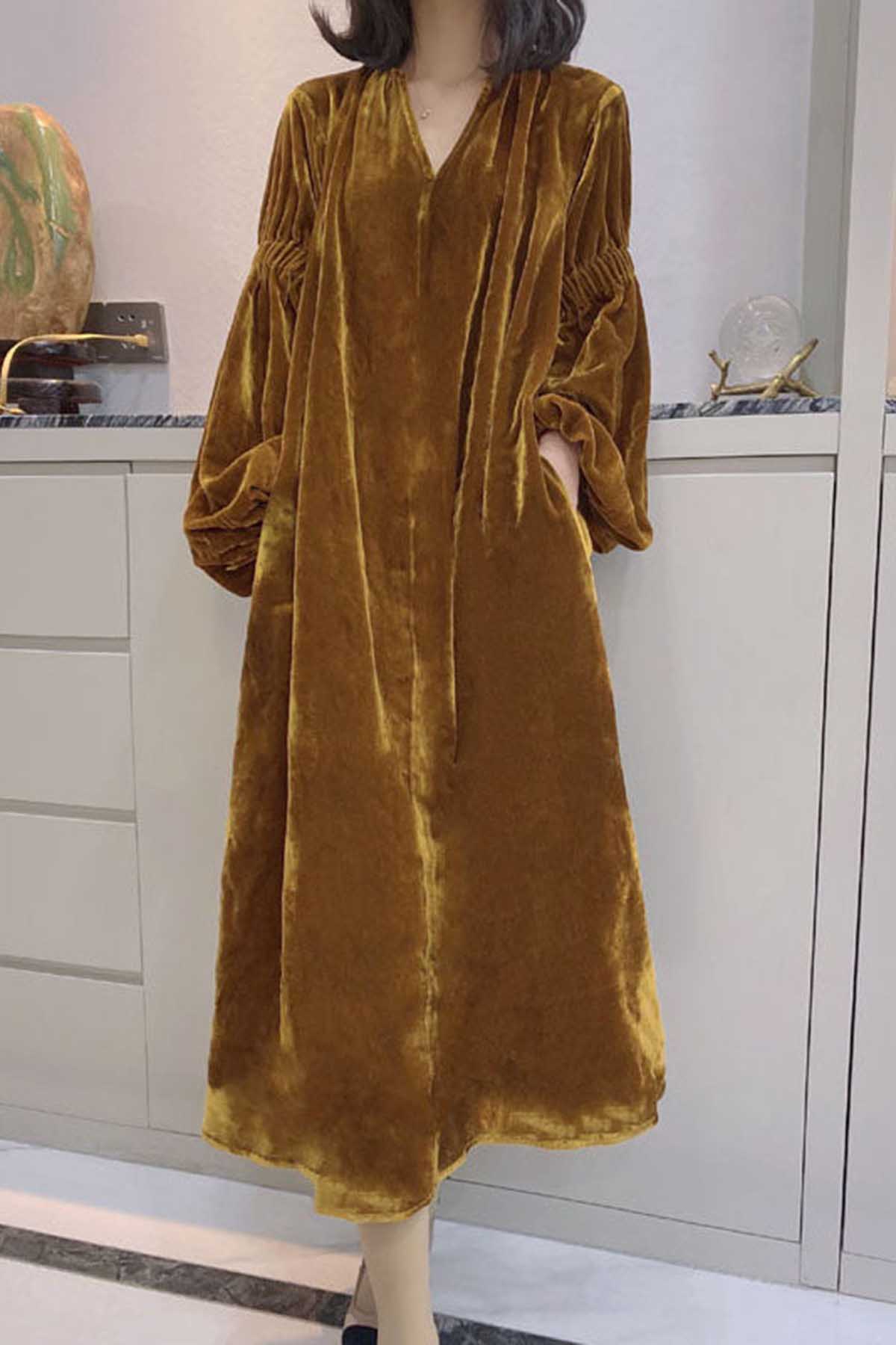Women Yellow Puff Sleeve Pockets Velour Dress