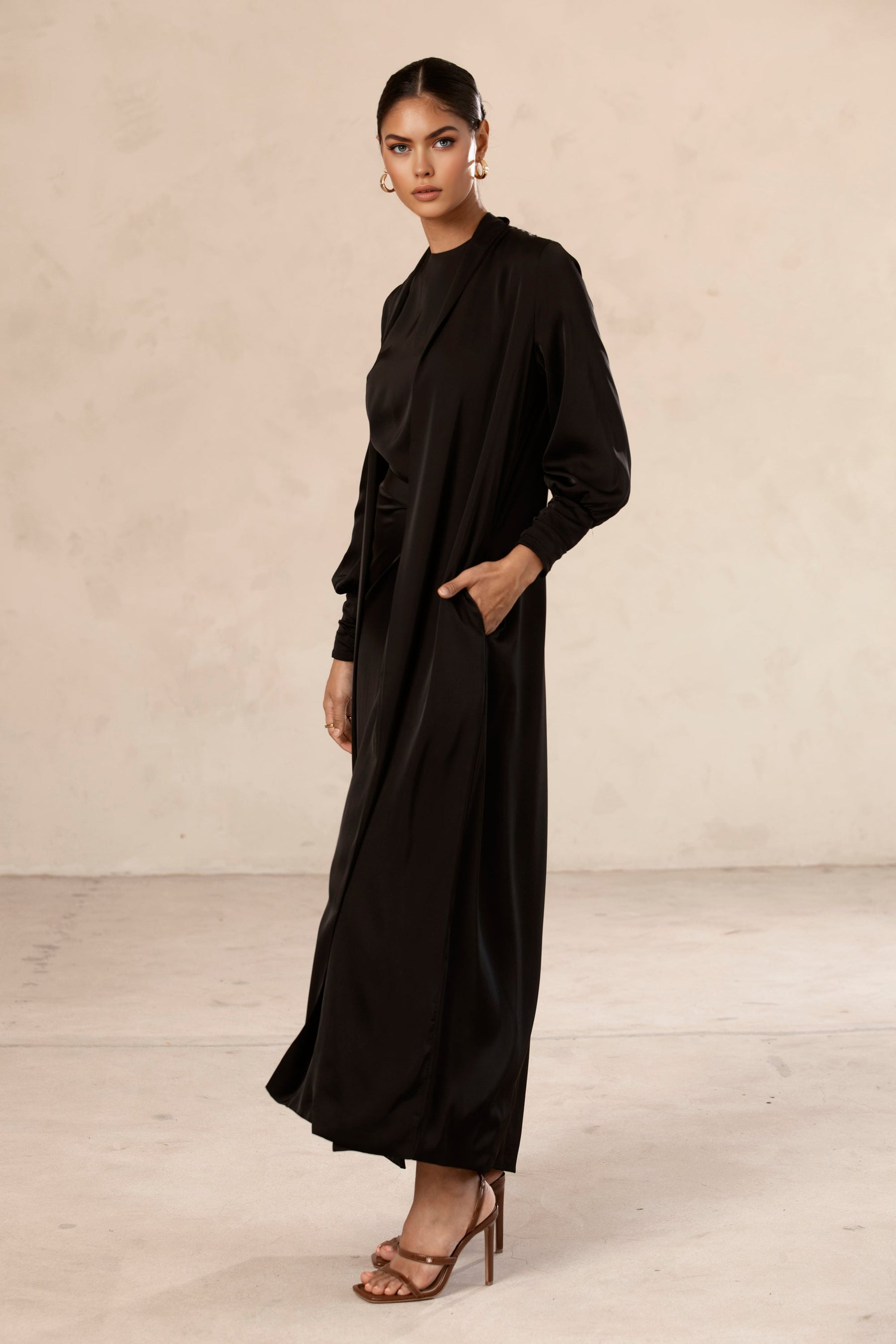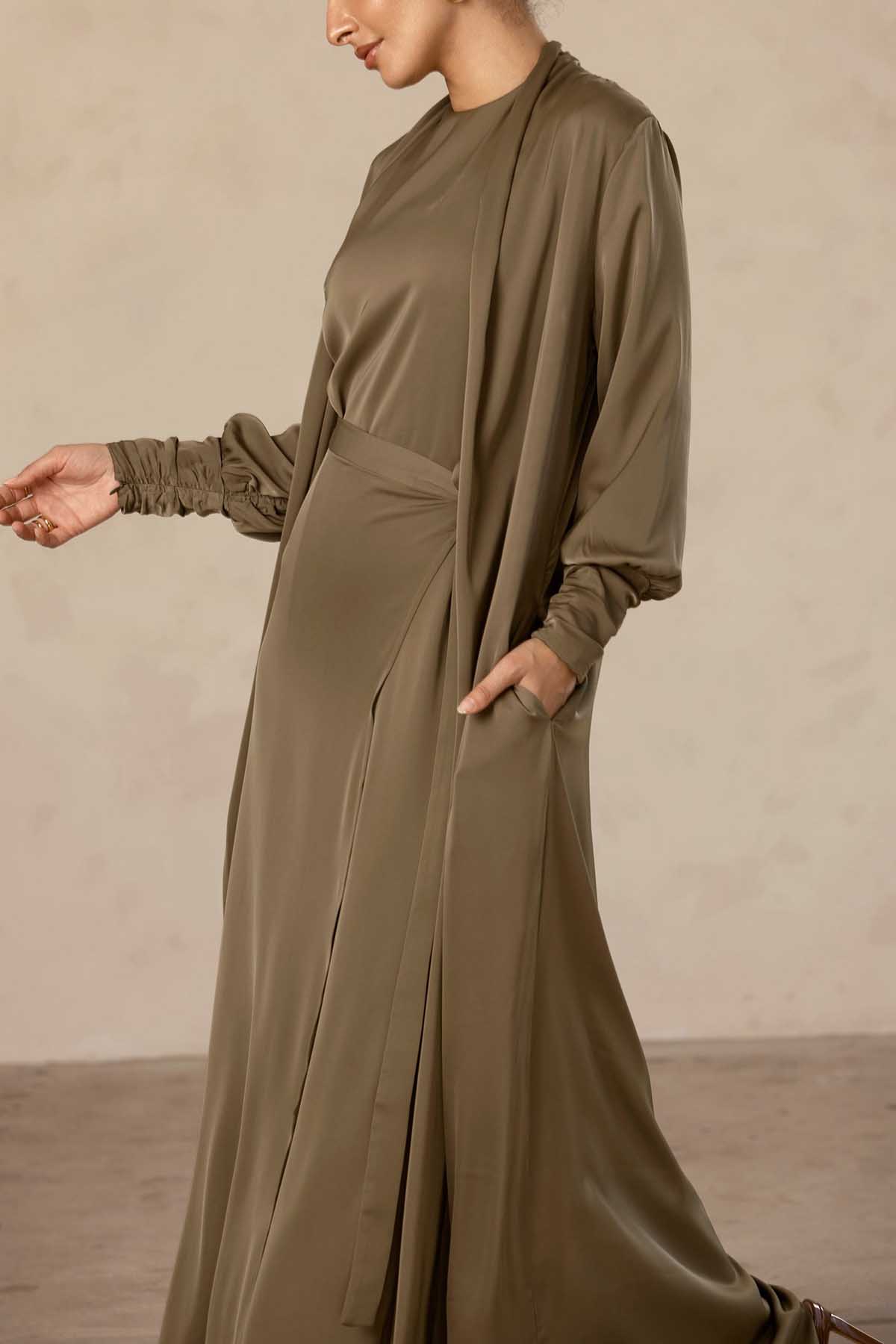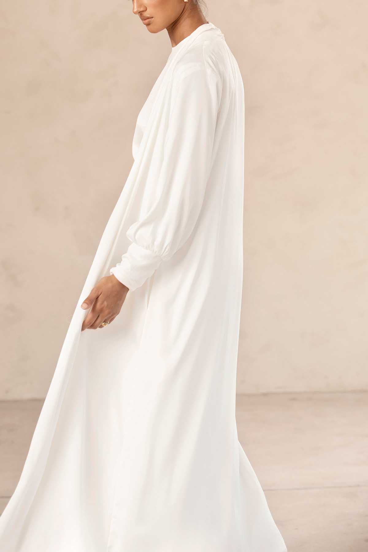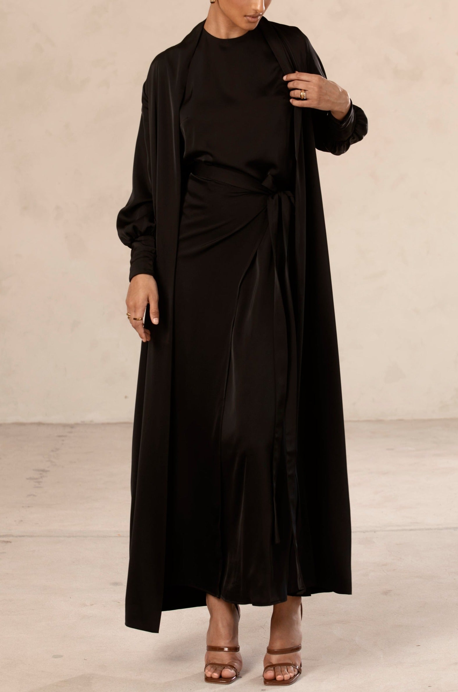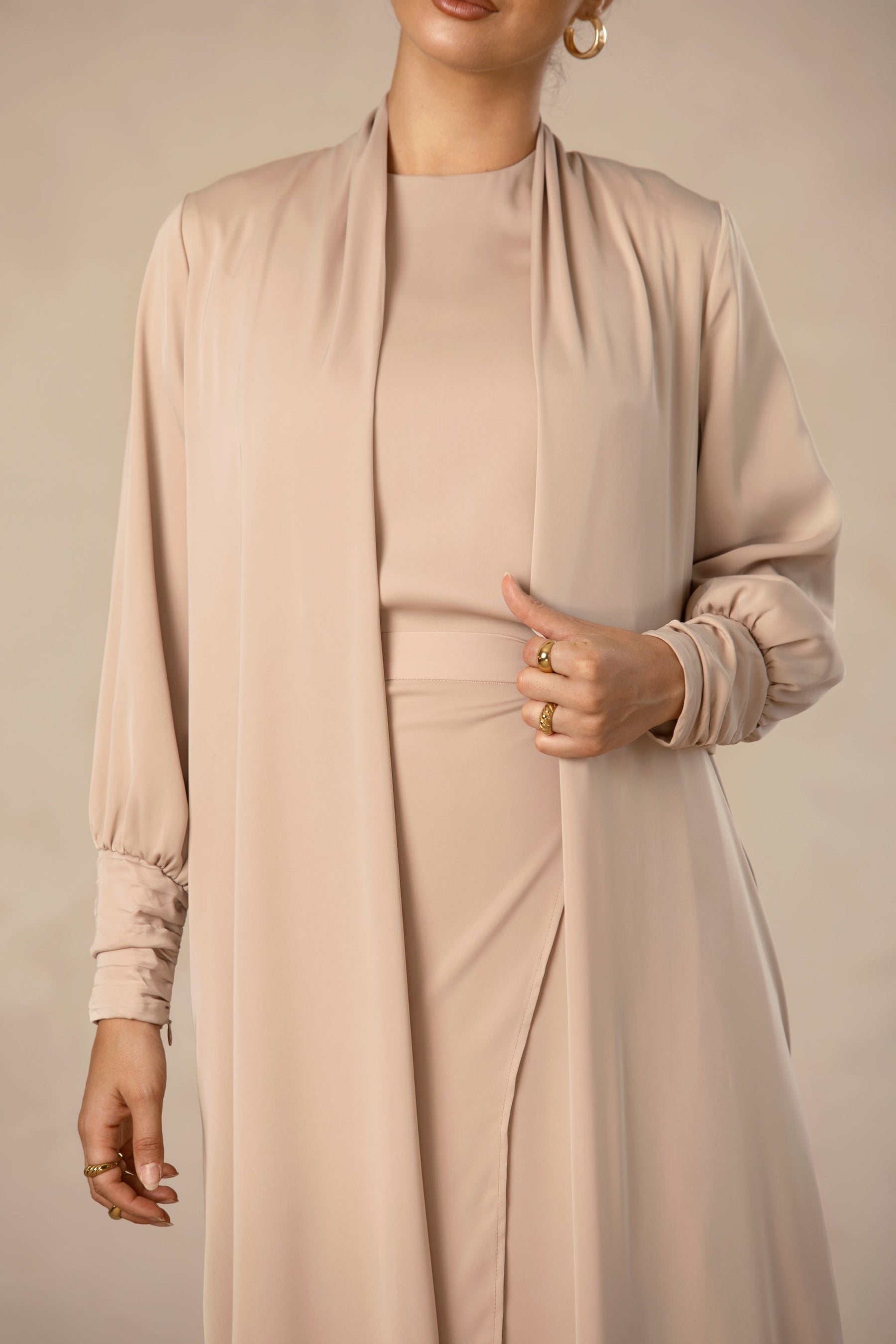 This open abaya features lantern sleeves, hidden zipper sleeves, and loose open front design. Pairs perfectly with our Sadia sleeveless maxi dress set.