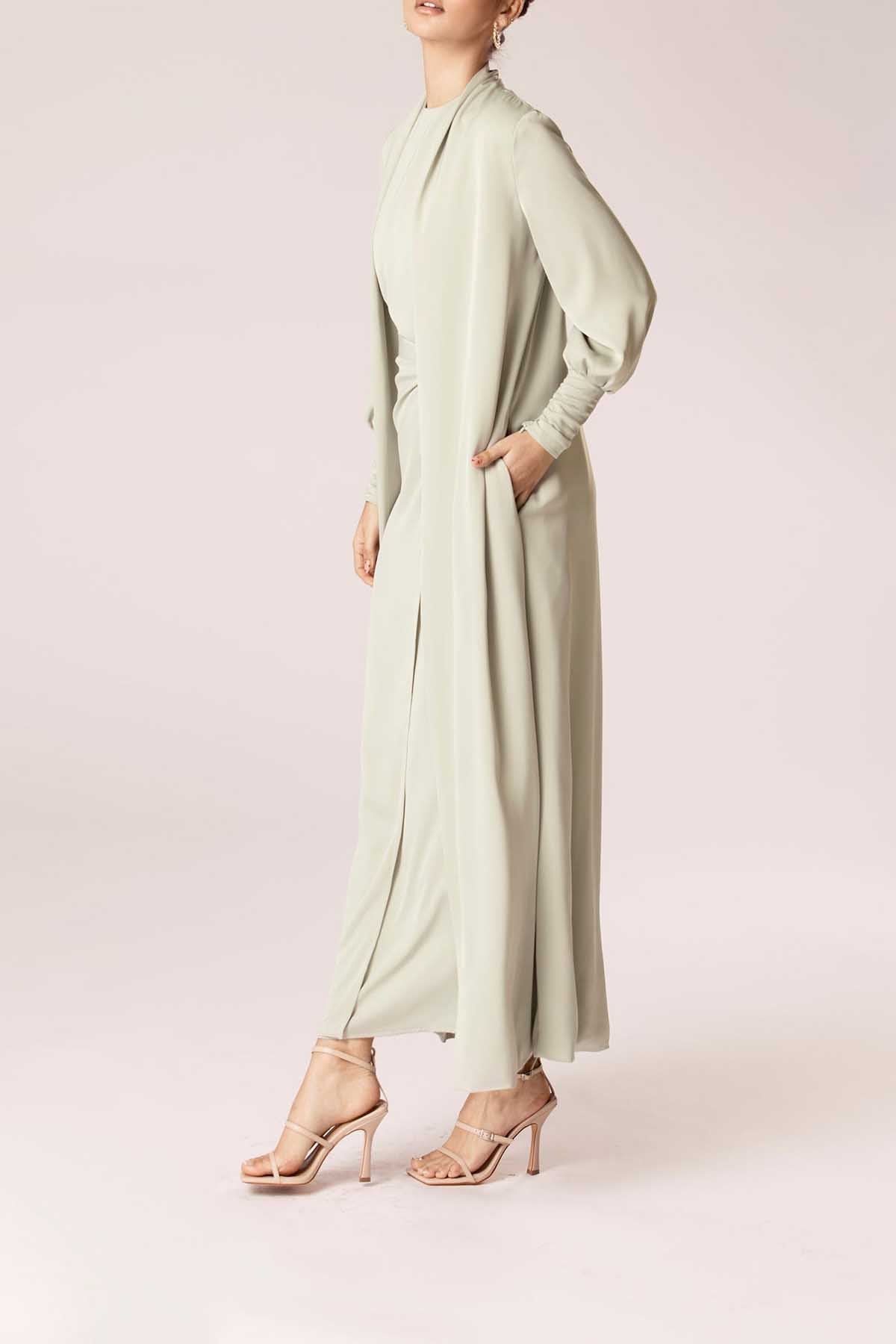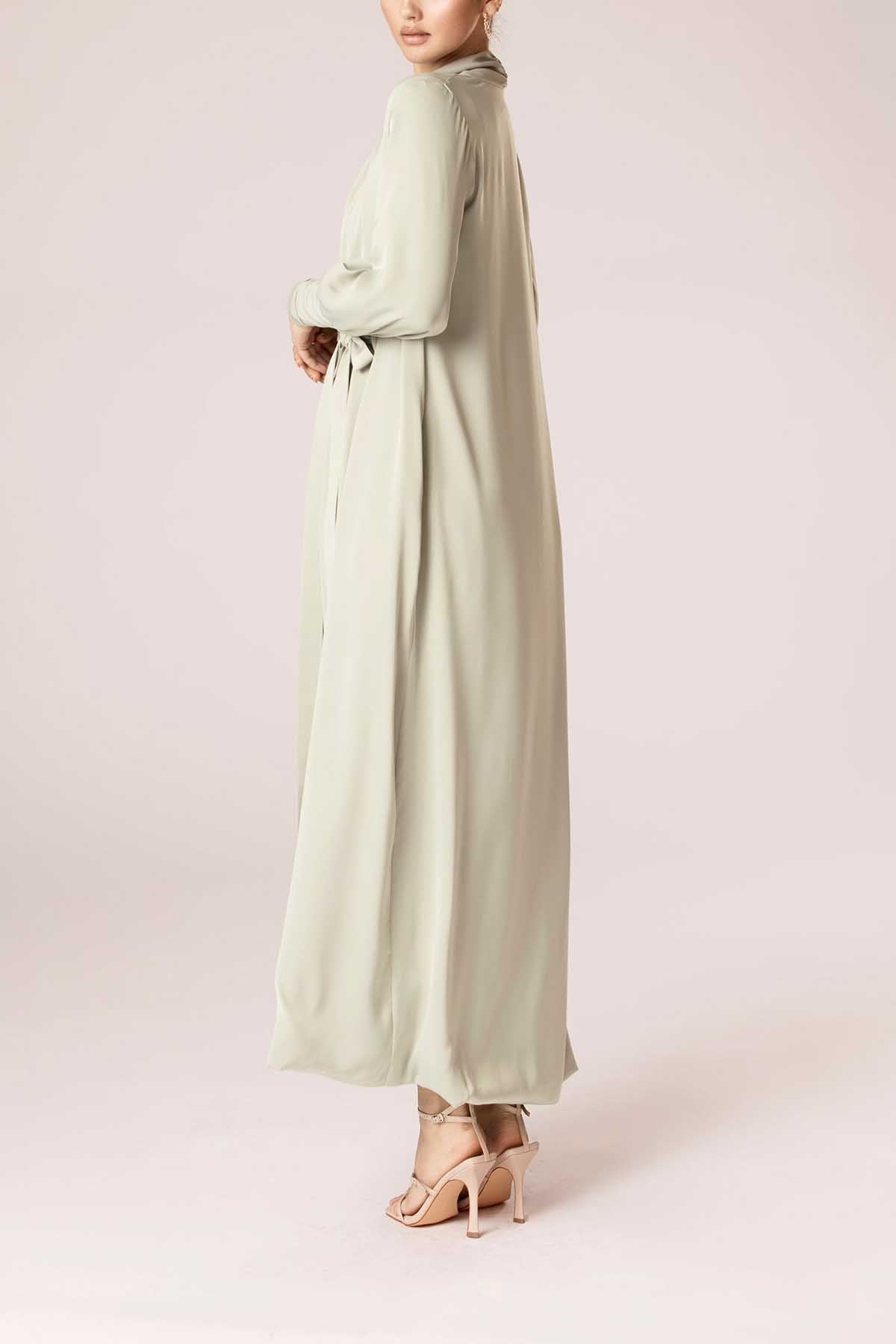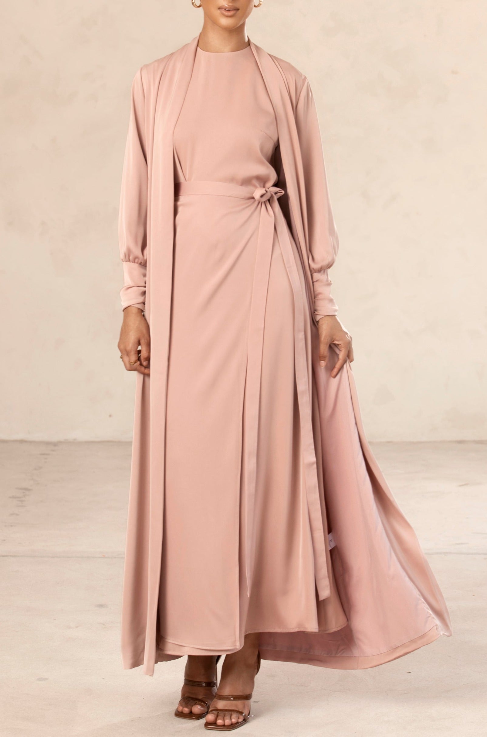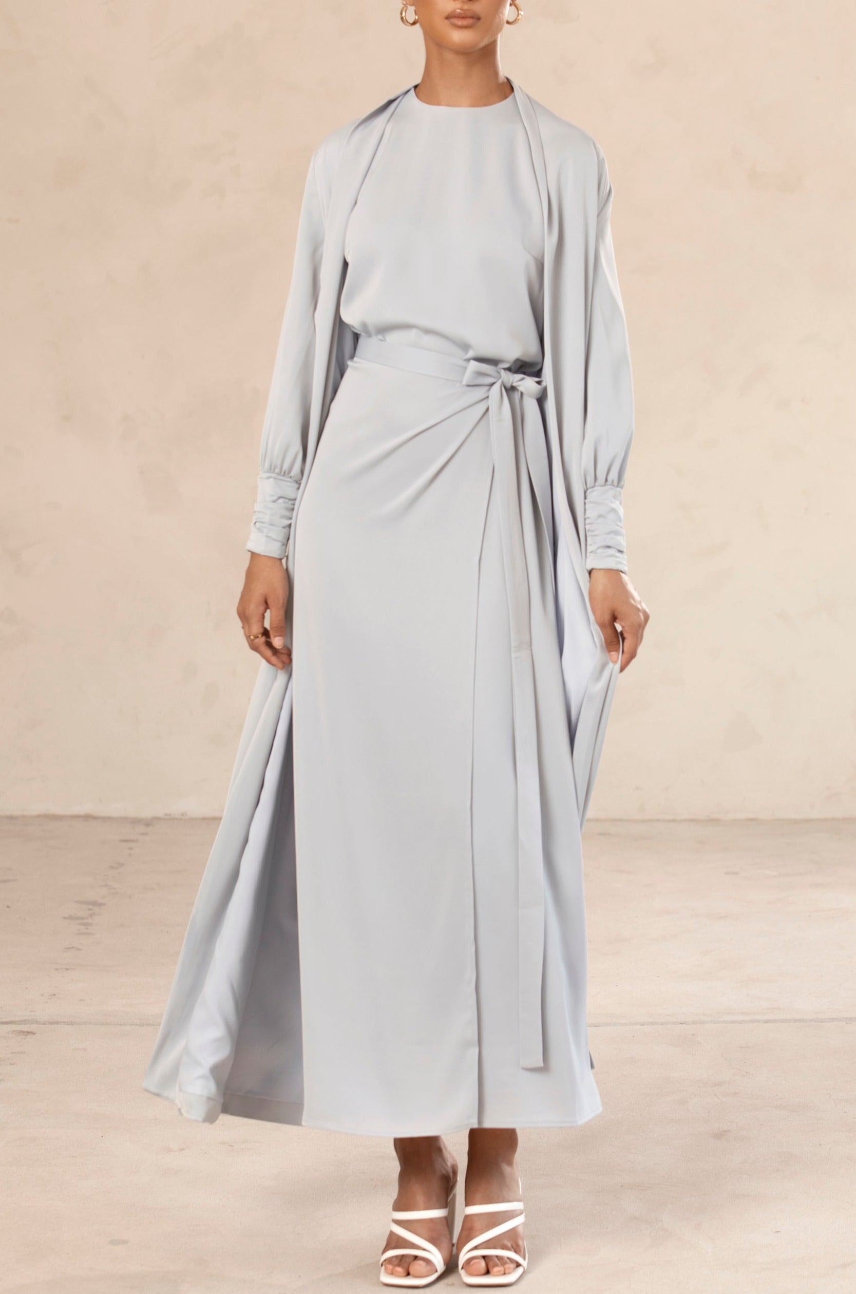 This open abaya features lantern sleeves, hidden zipper sleeves, and loose open front design. Pairs perfectly with our Sadia sleeveless maxi dress set.