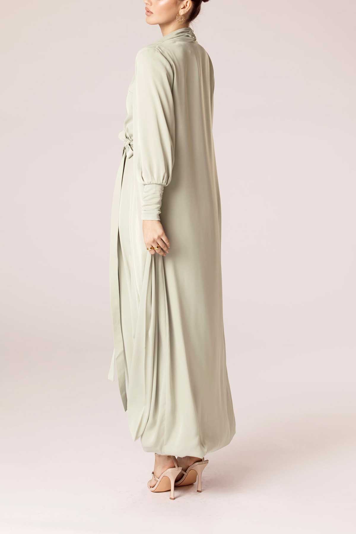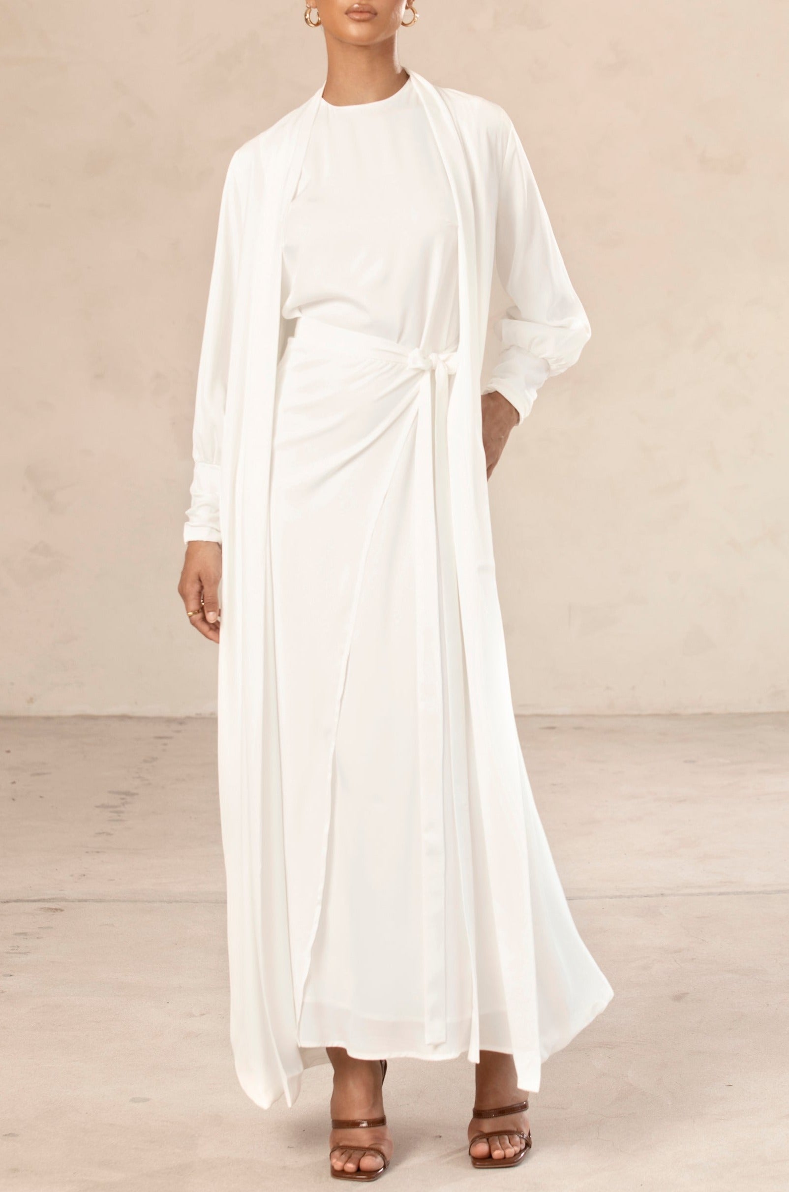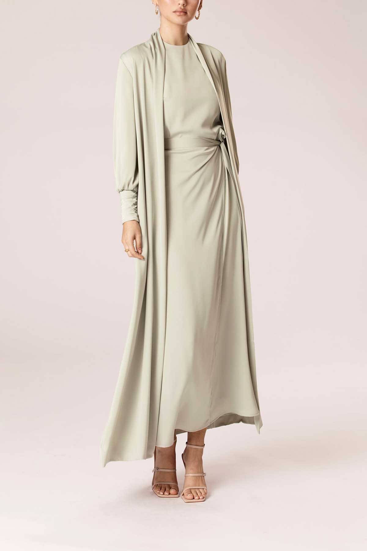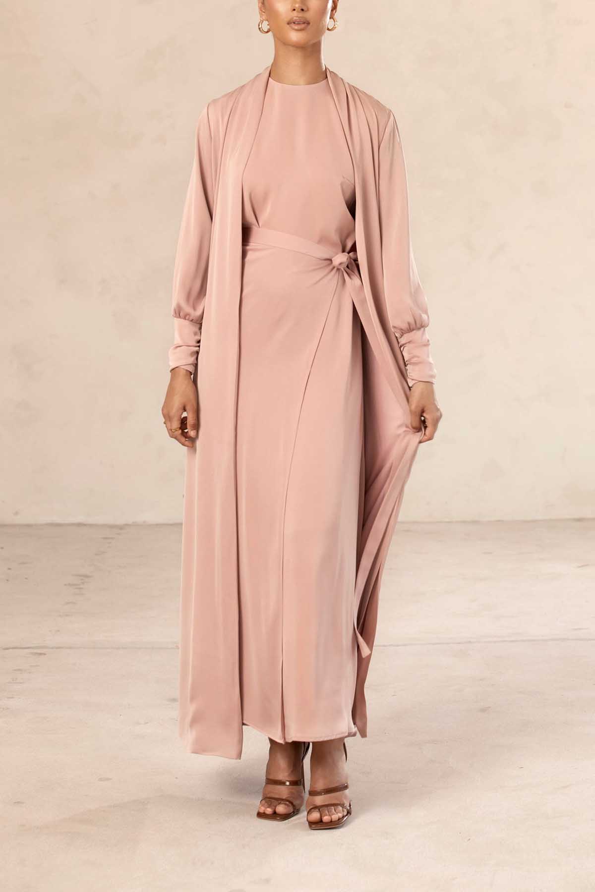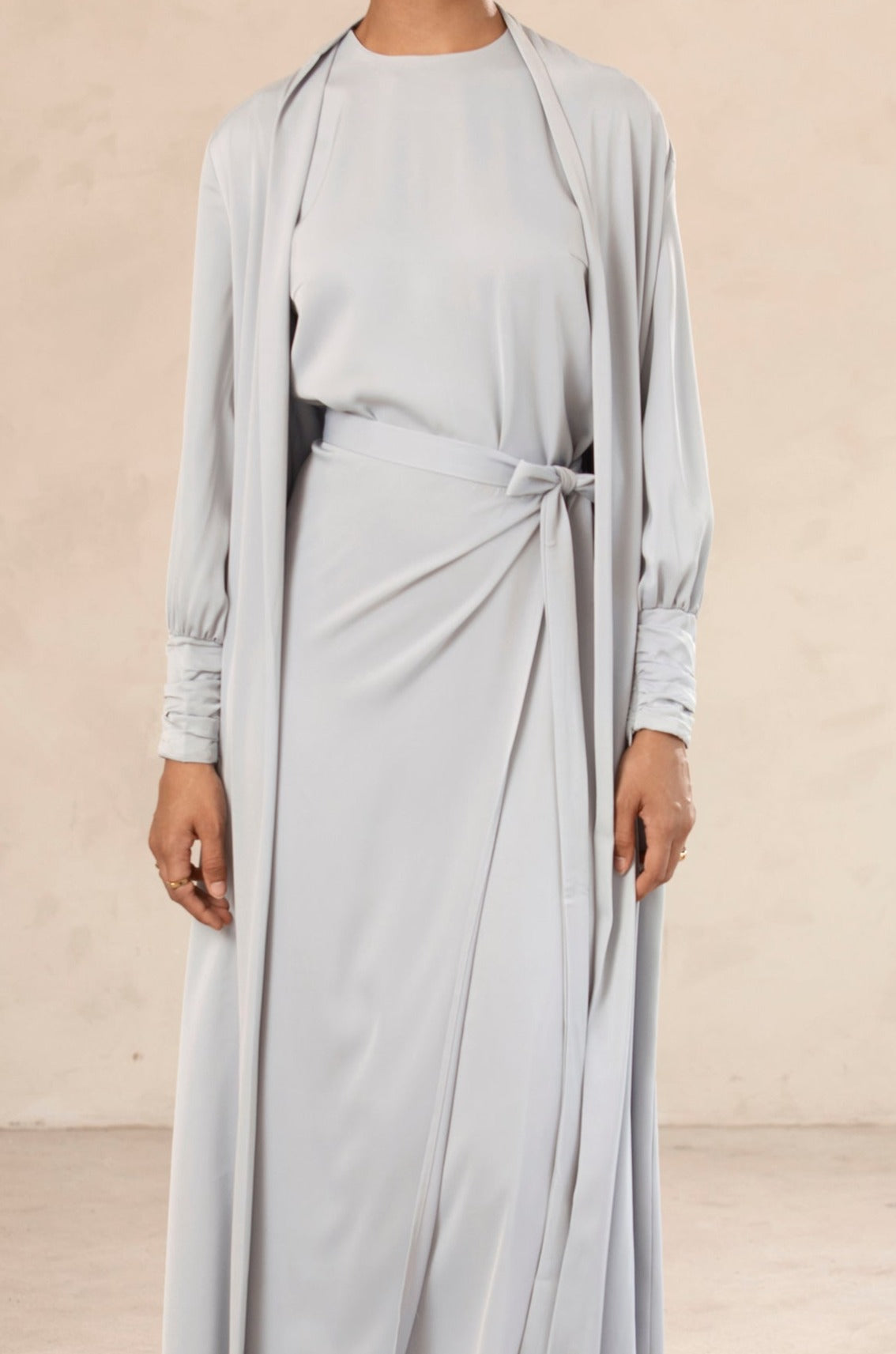 This open abaya features lantern sleeves, hidden zipper sleeves, and loose open front design. Pairs perfectly with our Sadia sleeveless maxi dress set.