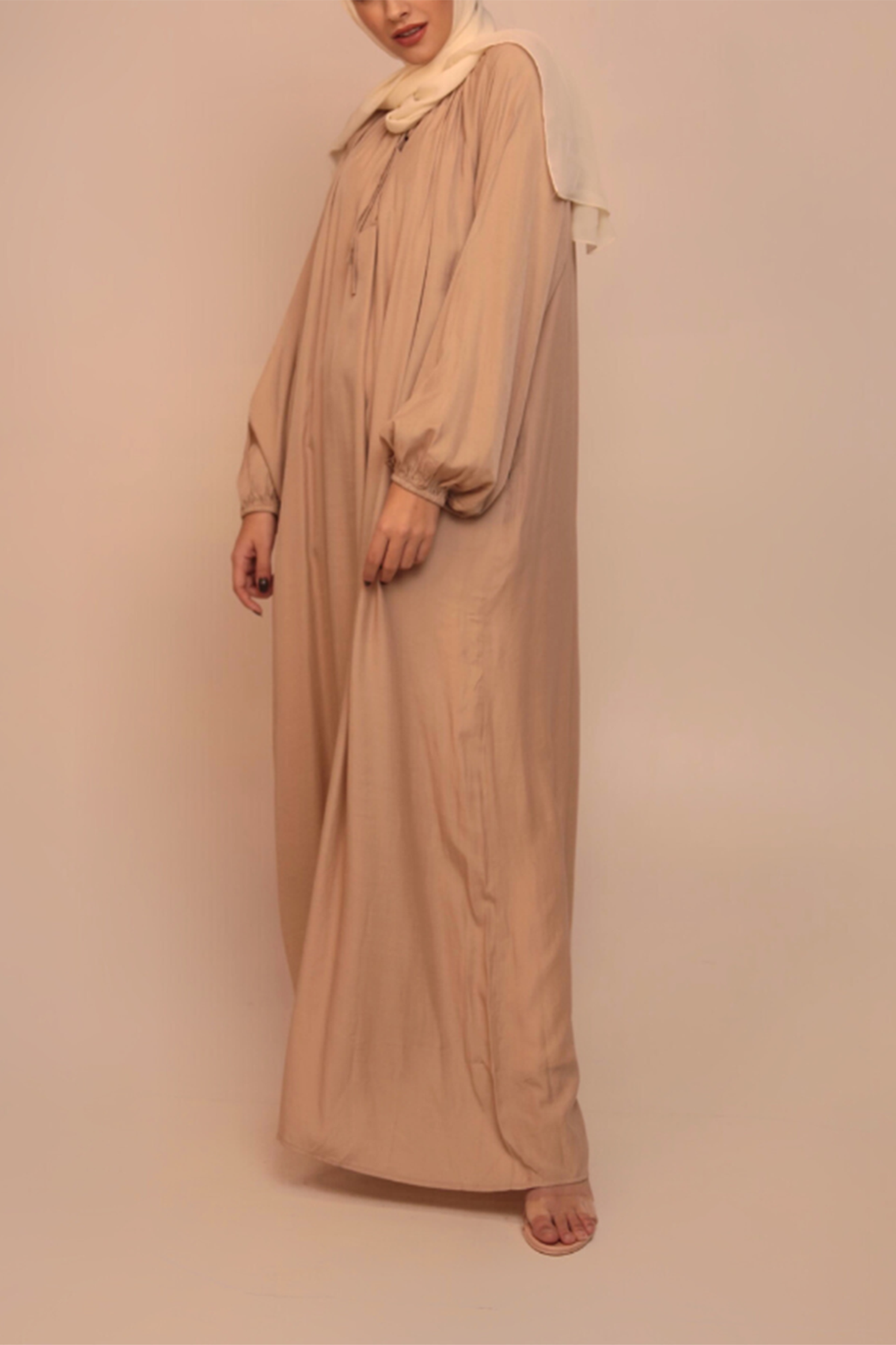 This simple yet sophisticated open concept abaya enhances a minimal style. Cinched balloon sleeves and a standard silhouette give you a blank canvas to style as you choose. This dress has a loose fit and runs large so we recommend sizing down if you want true to size.