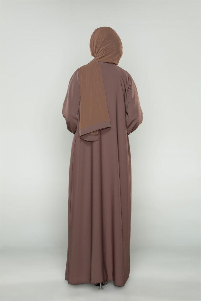 Our minimalistic and elegant taupe open abaya with elasticated cuff sleeves is perfect for everyday wear. A perfect essential piece for every wardrobe. Style it with our Inner slips (sold separately). The abaya features pop up buttons on the front of the abaya. Made with the high grade Nida material. Includes matching belt and chiffon hijab to complete the modest look. This classic taupe open abaya can be worn on any occasion.
