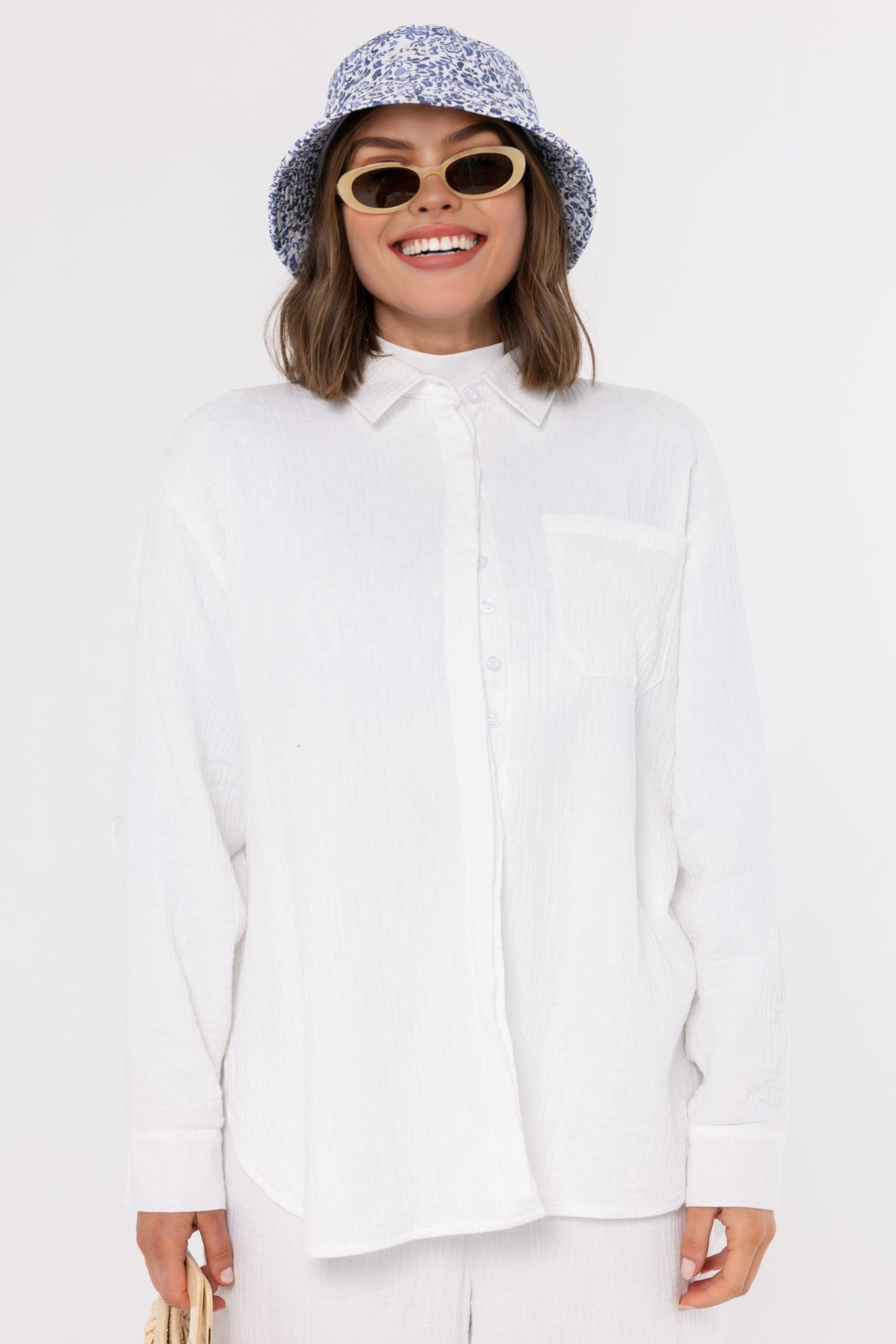 Embrace the warmer seasons with the stylish ‘Unwind’ button shirt in classic white. It features a full lining and is crafted from breathable cotton, offering a modest and comfortable fit. Pair it with the matching ‘Unwind’ pants for a fresh and comfortable look.