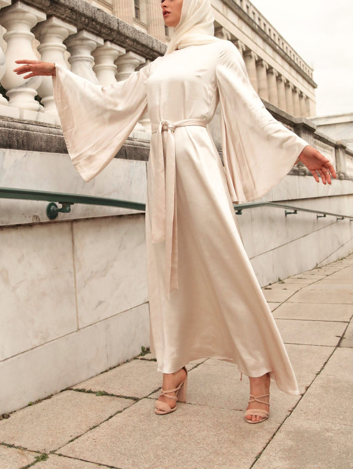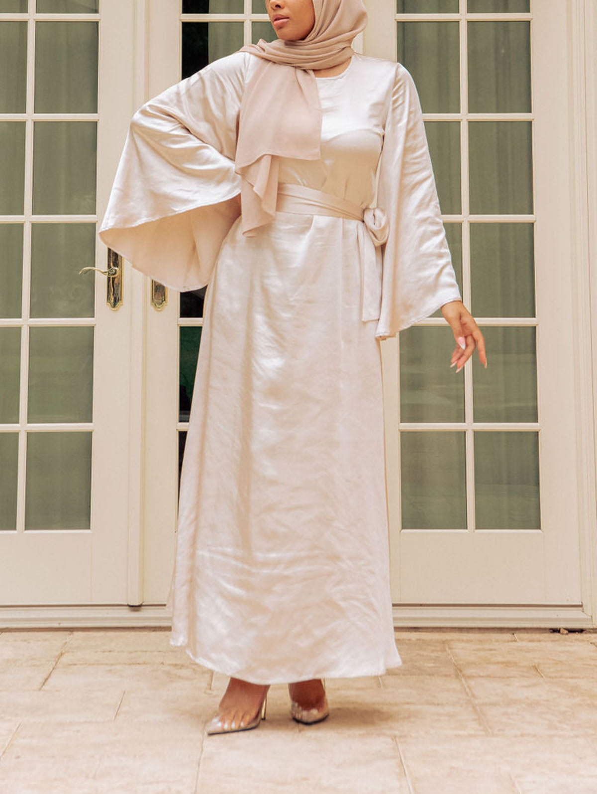 Be timeless and channel your inner diva in this round-neck satin blend abaya. new addition to our collection is the epitome of class. The cascading asymmetrical bell sleeves add ease of movement but polished style. Effortless and airy, this viscose-satin dress updates our signature A-line silhouette, a cascading full skirt with a sweeping hem. This stunning maxi is tempered by a detachable belt It comes in four stunning shades