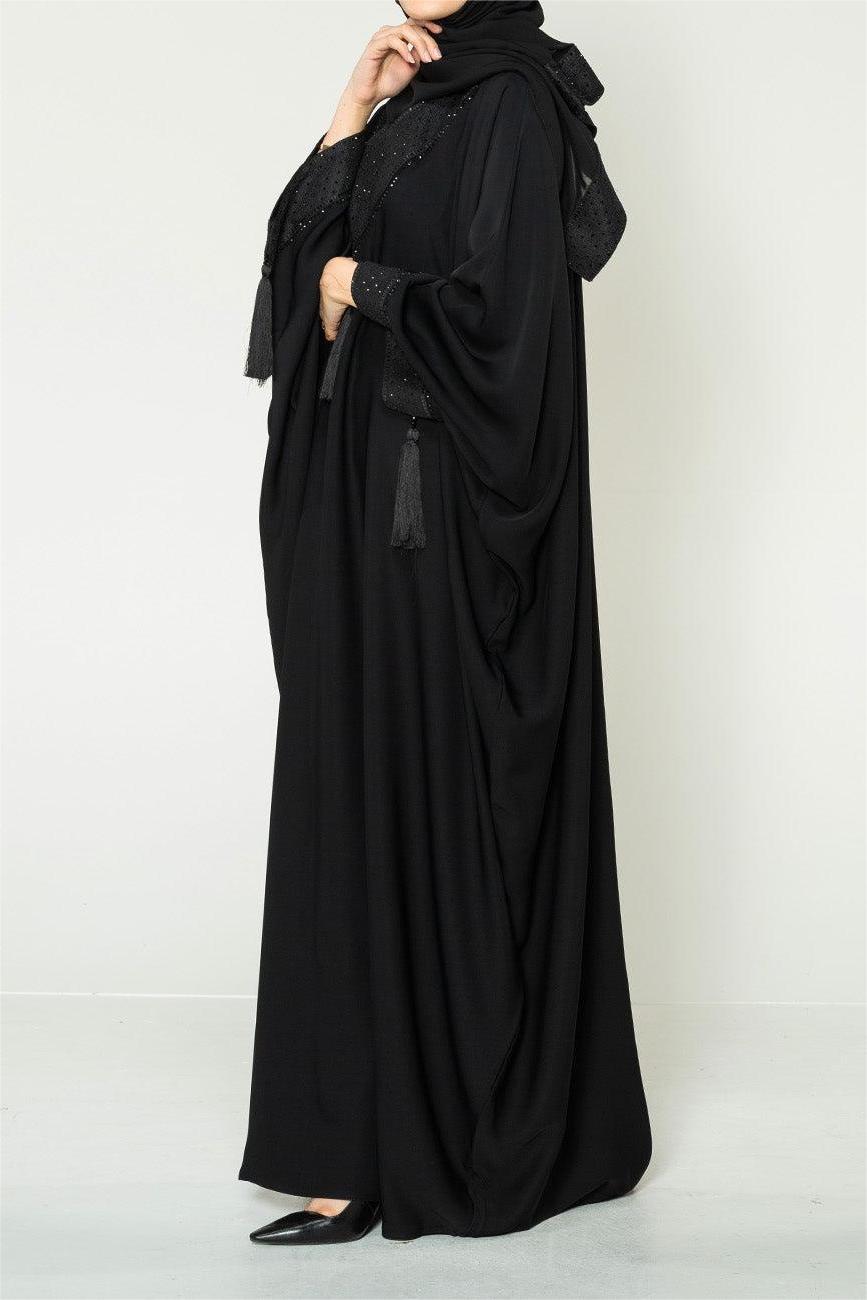 Hello Fatima brings you a Palestinian inspired farasha. Traditional black on black embroidered lace on the neck line trailing along the cuffs with tassels. This abaya brings a touch of pure tradition, elegance and demure to your wardrobe. Includes matching hijab to keep you looking modest and traditional.