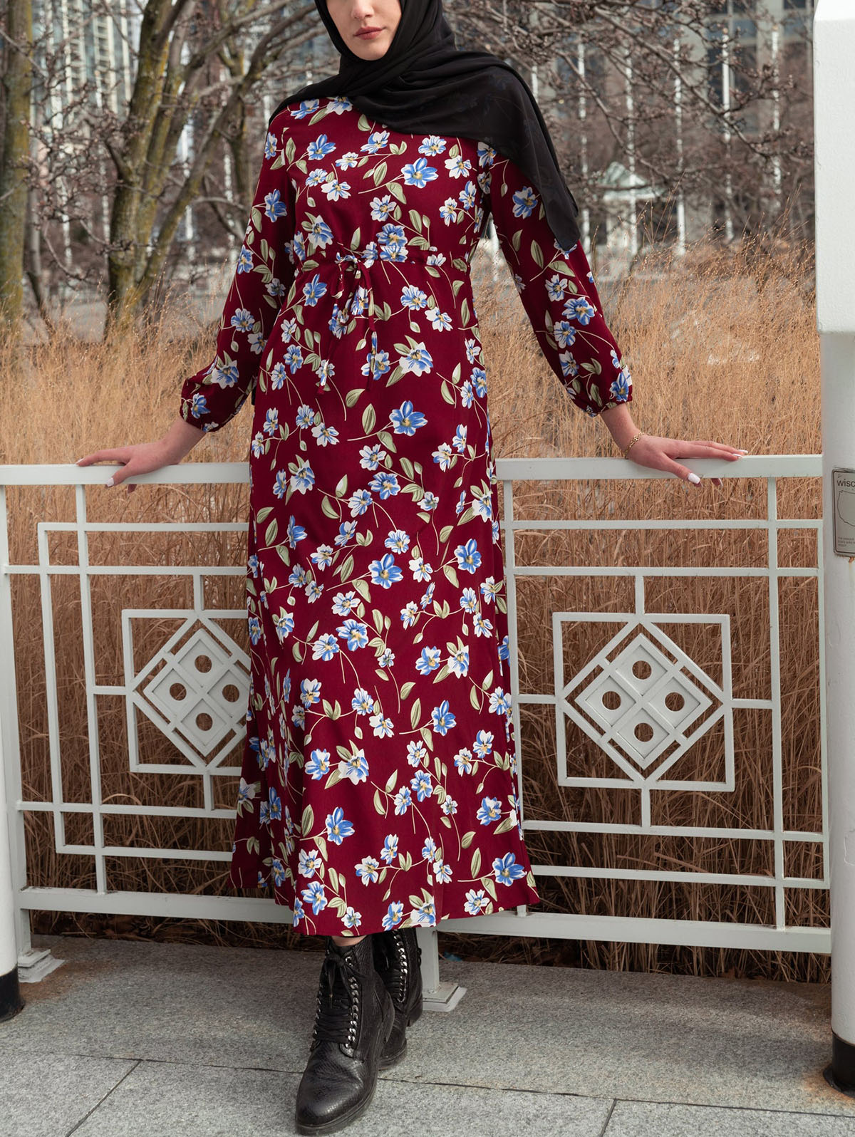 Our new maxi dress comes in the most distinct and beautiful shade of red, printed with blue blooming floral design. A unique print exudes floral serenity. Take risks with your sense of style in this trendy yet chic printed maxi . Our Morning Glory dress comes with an adjustable self-tie waistline and cinched balloon sleeves.