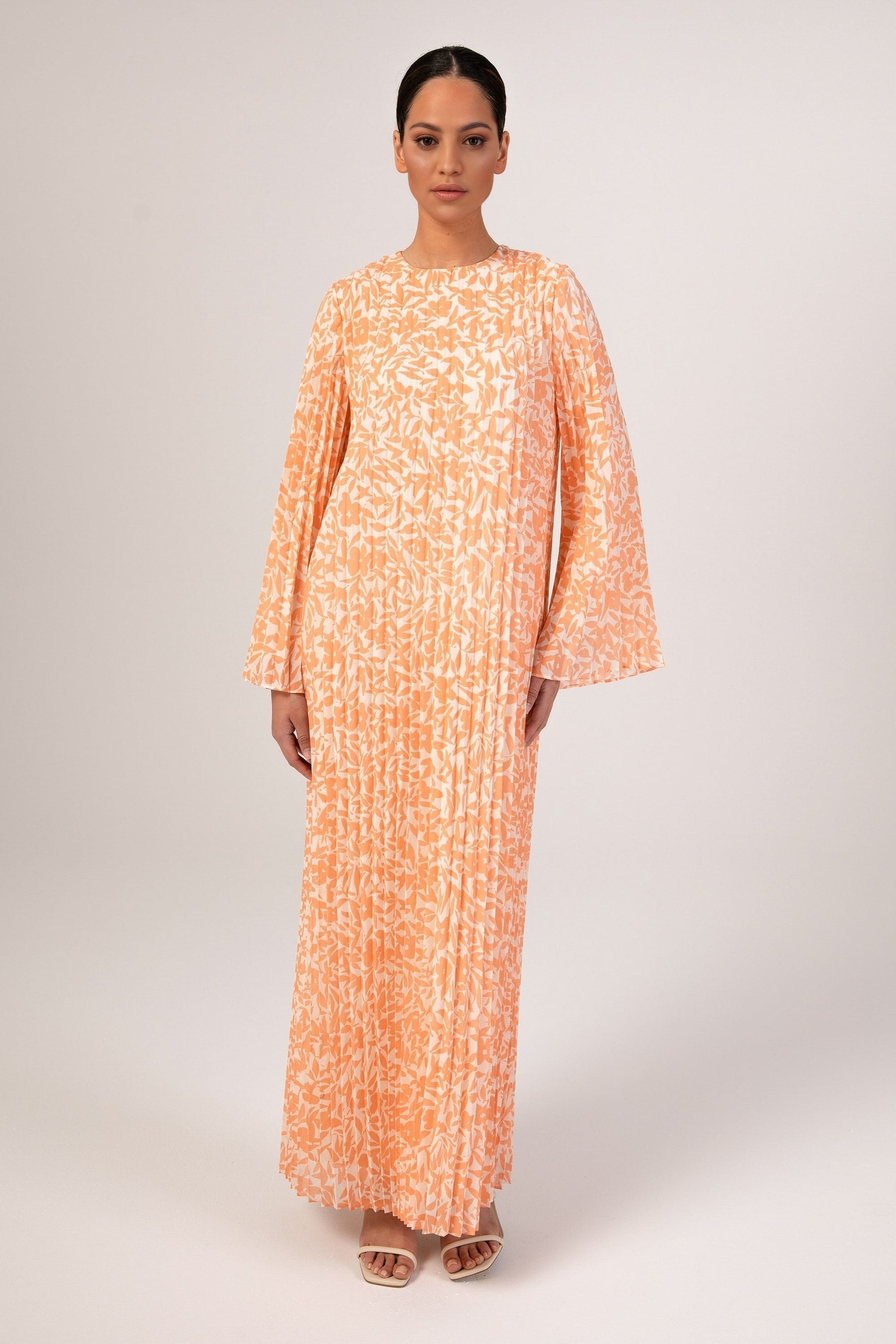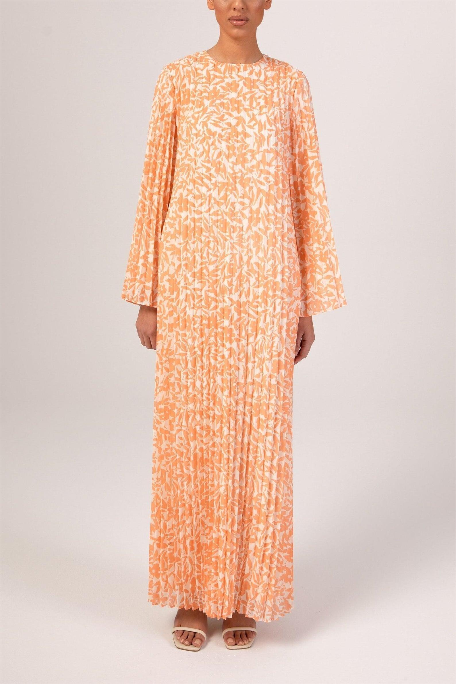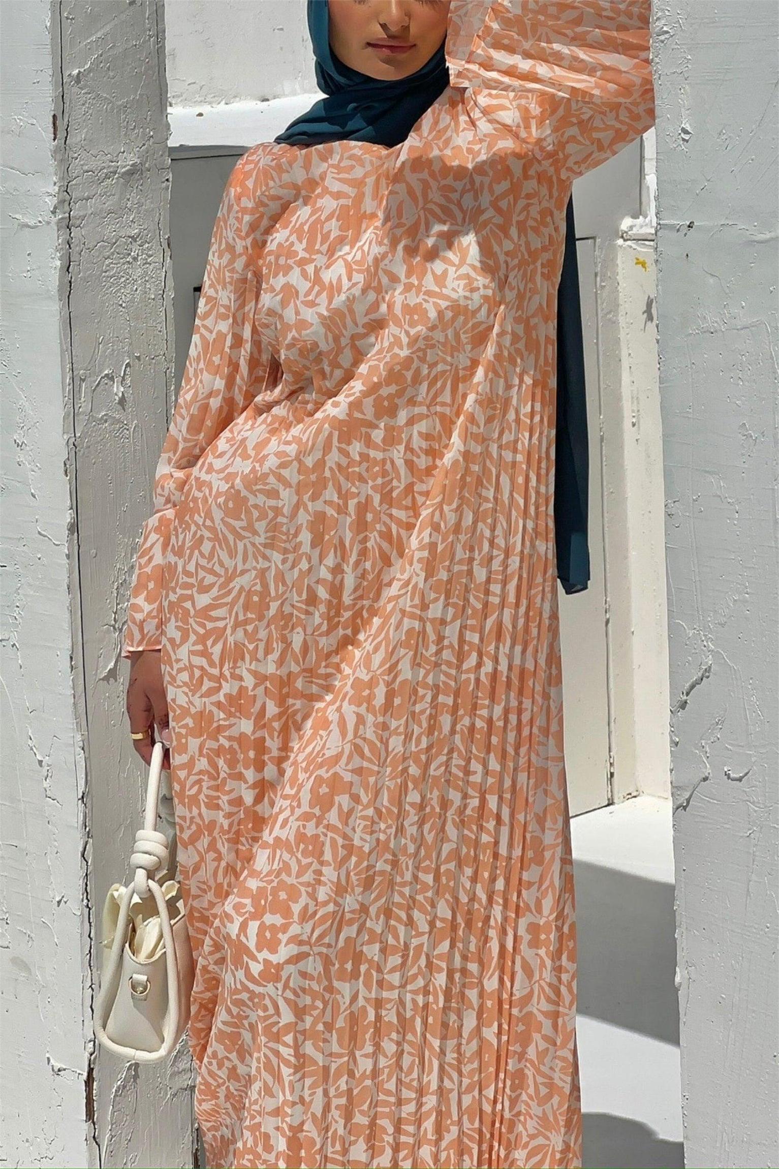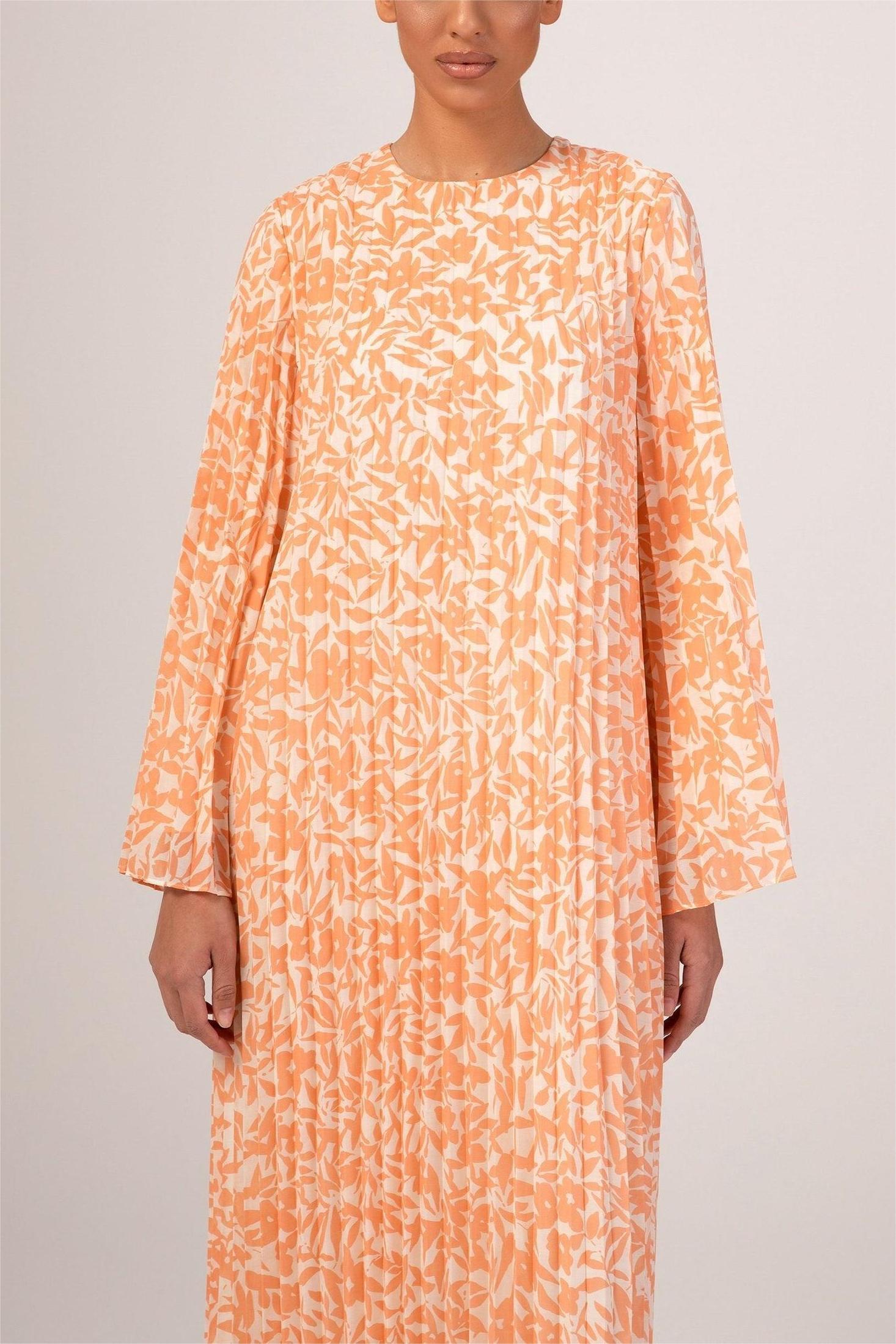 The Pleated Shift dress features a delicate pleated chiffon fabric, with a modest casual-fit bodice and feminine floral pattern for the perfect summer dress.