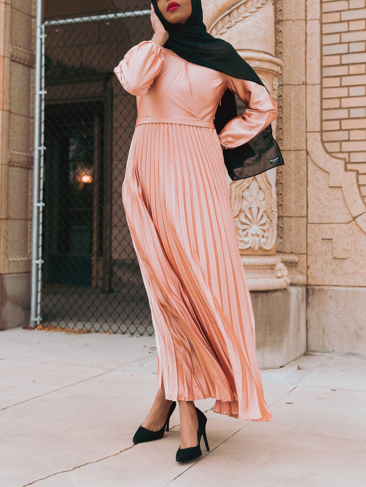 This stunning and magnificent floor length gown is detailed with accordion pleating all round and a surplice neckline. Cinched balloon sleeves keep your arms accessible, and the flowy satin blend material feels soft and luxurious against your skin. Removable belt included. Available in two captivating shades.