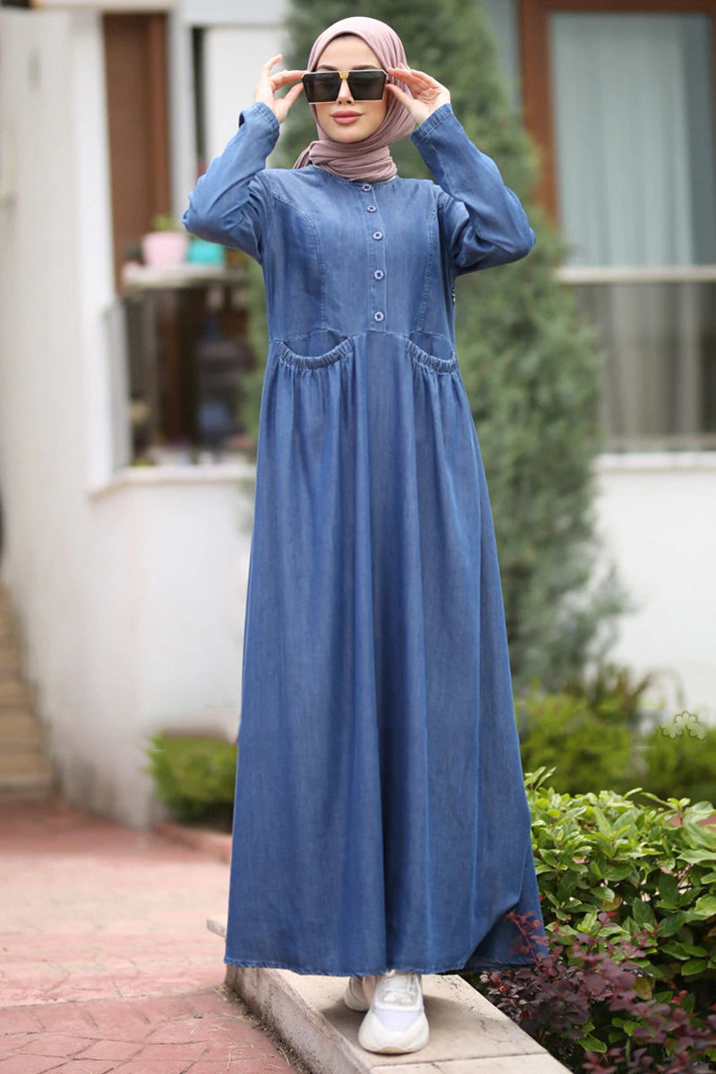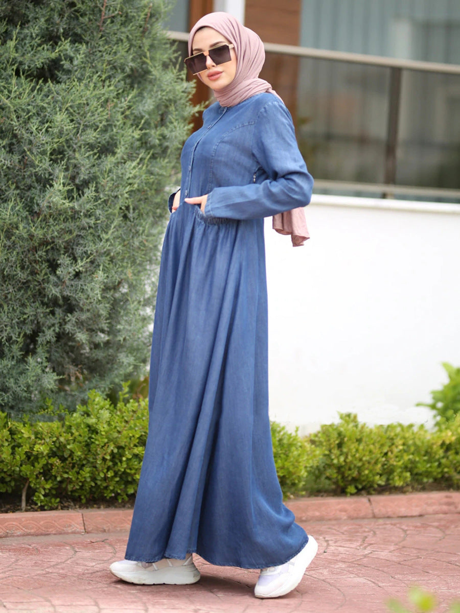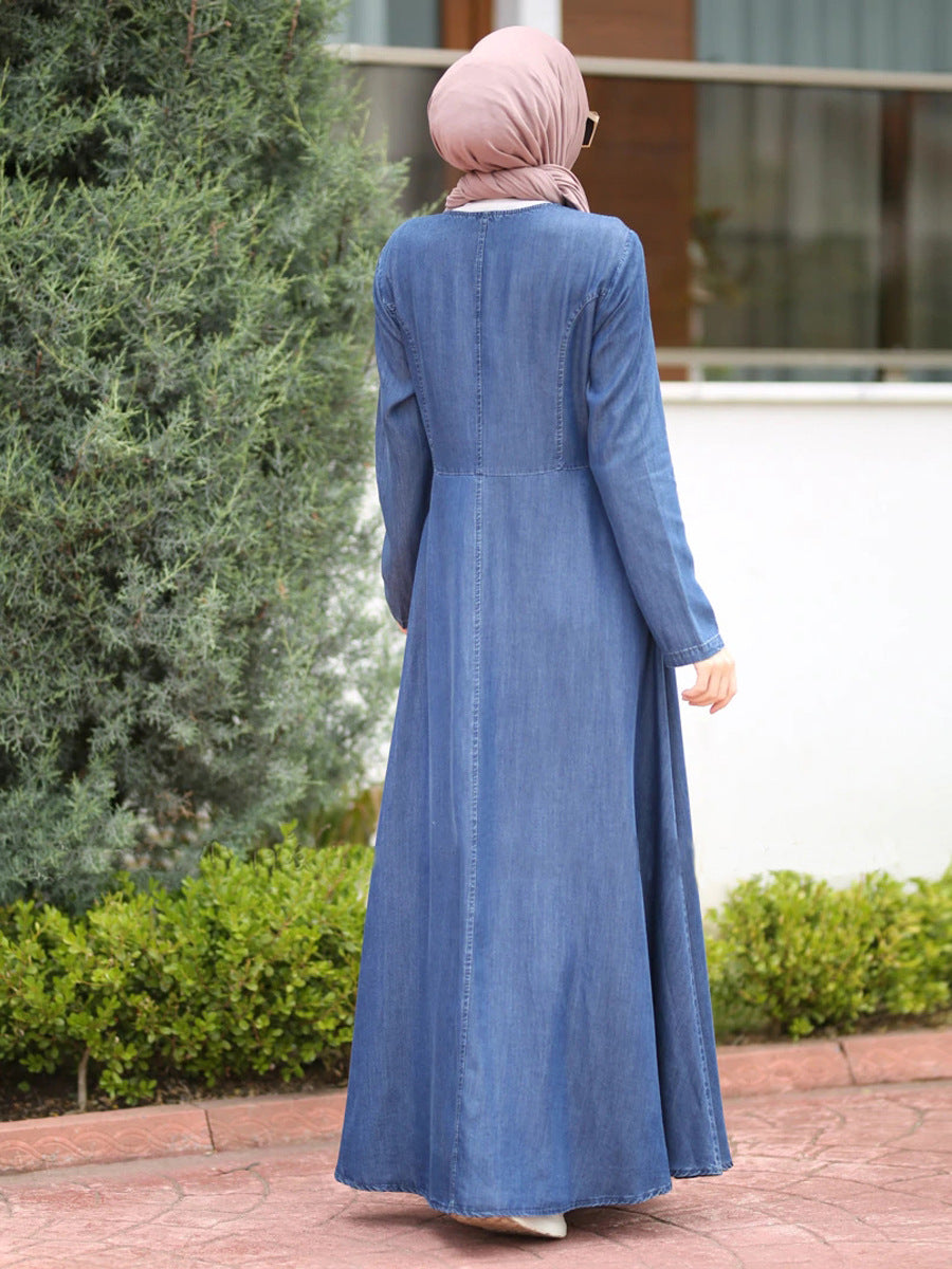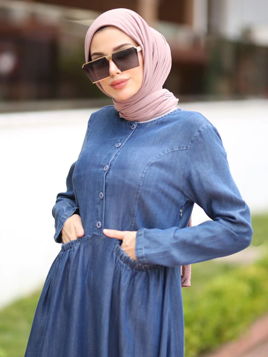 Art Blue O-Neck Pockets Button Denim Fall Long sleeve Dress