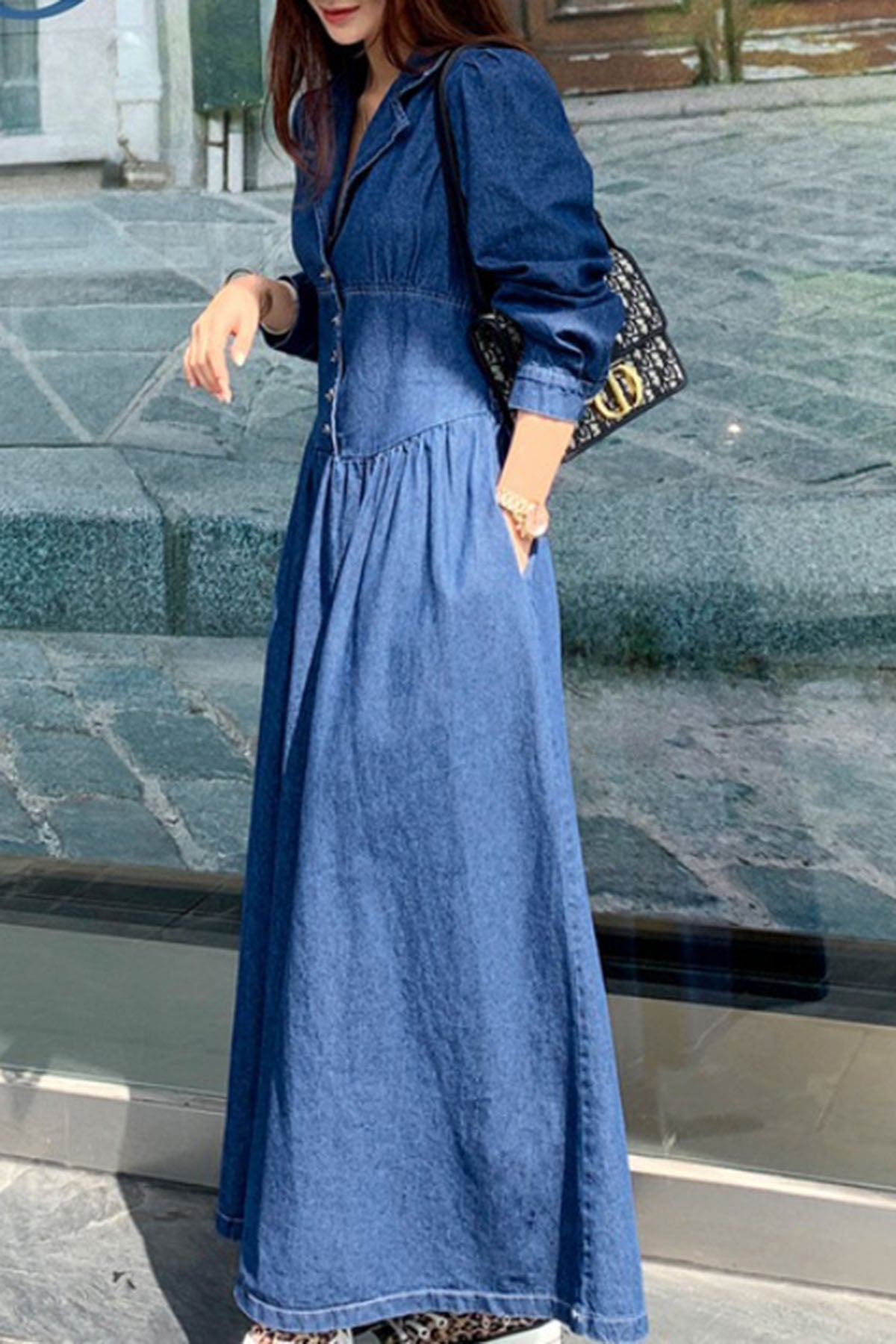 Loose Blue Pockets Button asymmetrical design Fall Denim Long sleeve Long Dress