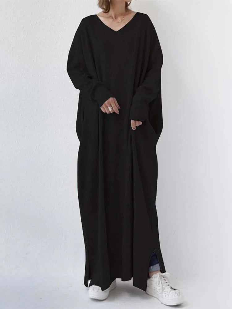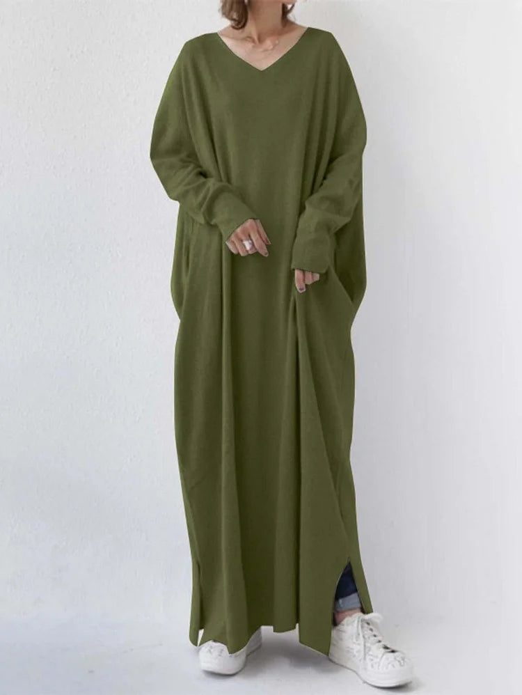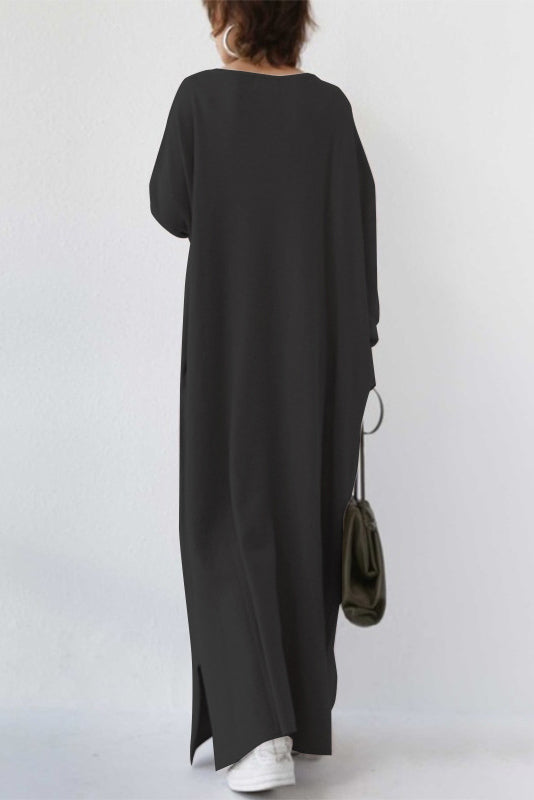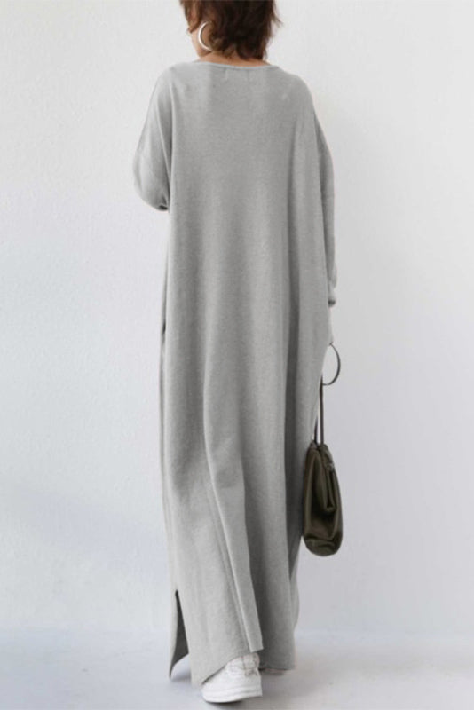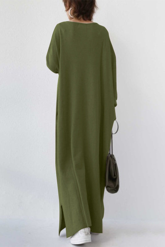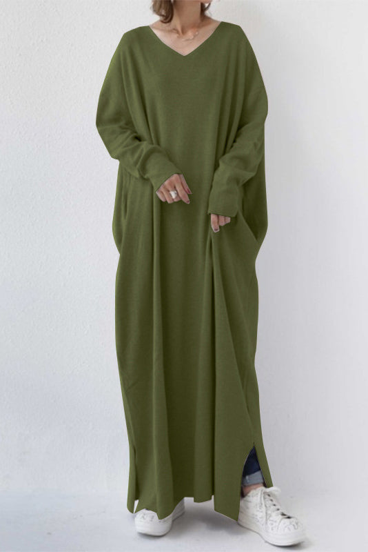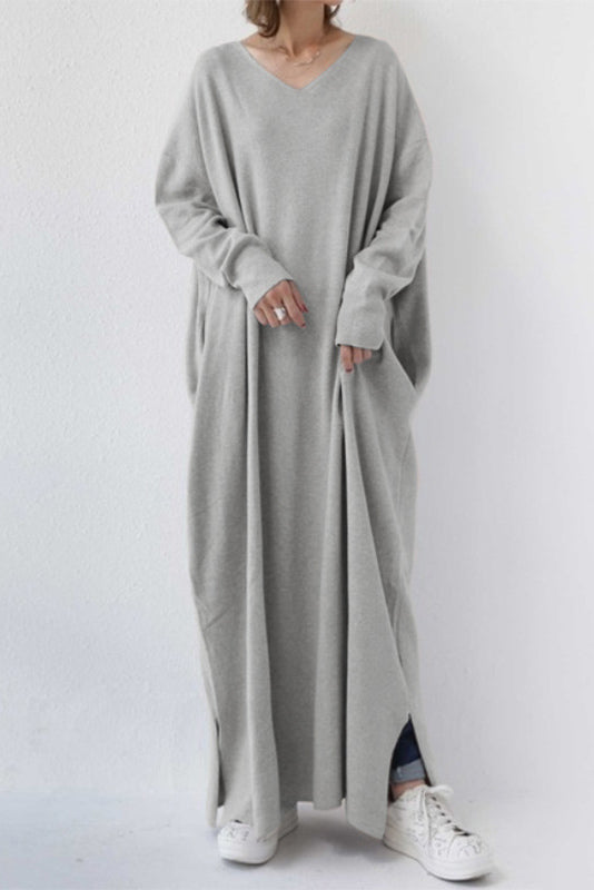 Solid V Neck Long Sleeve Slit Hem Pocket Maxi Dress
