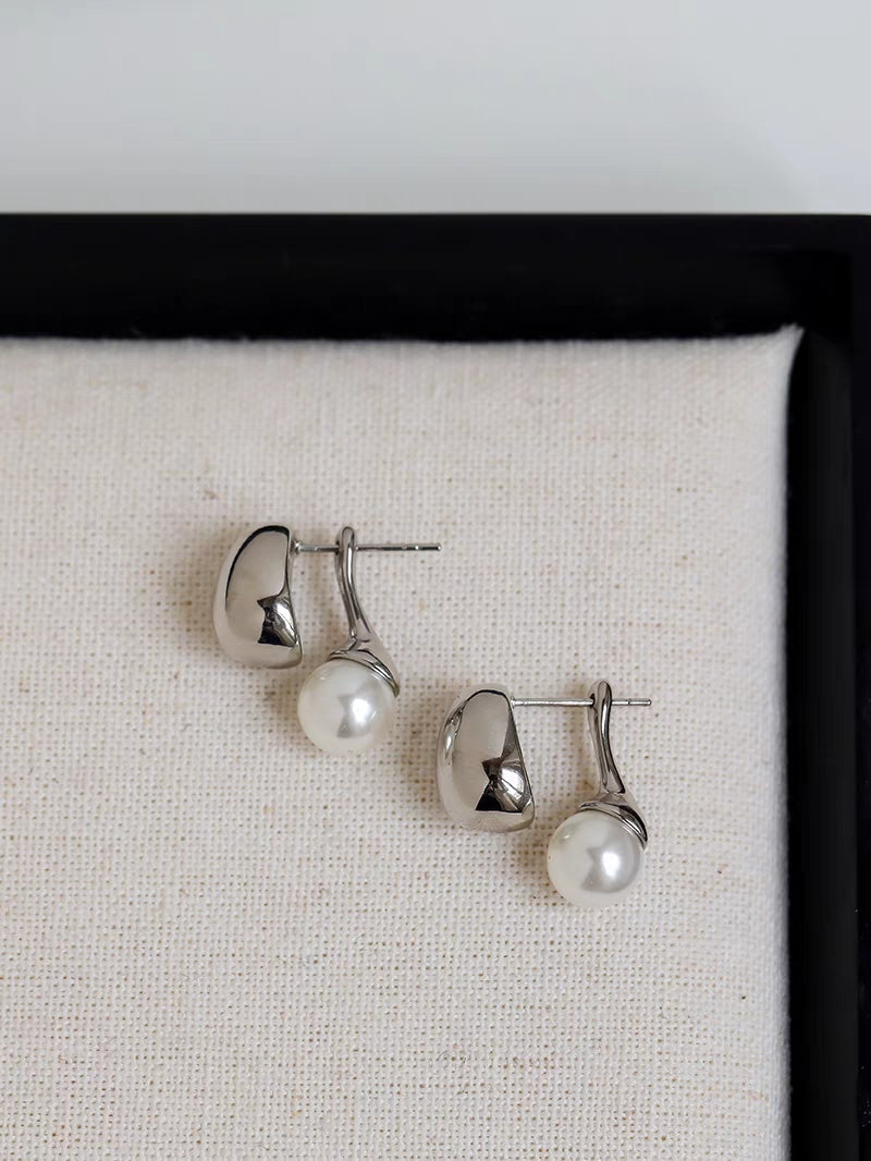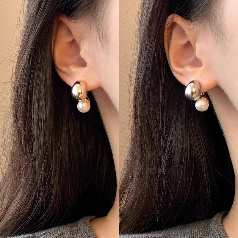 A pair of earrings that features a small drop design that is embellished with a single faux pearl. Style : Earrings Design : Metallic, Embellished, Faux Pearls Closure : Push Pin