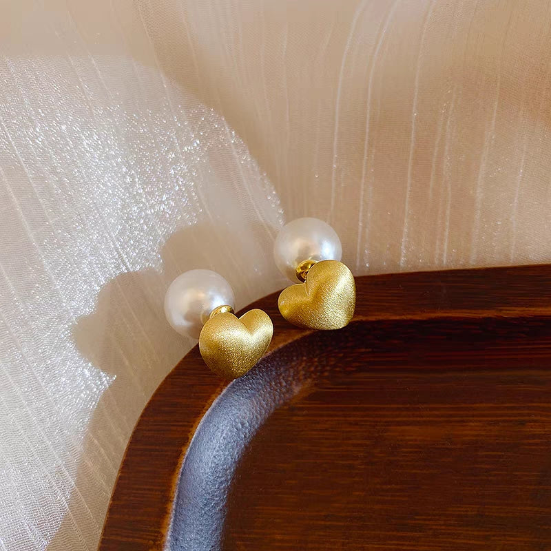 A pair of earrings that features a small heart design that is embellished with a single faux pearl. Style : Earrings Design : Metallic, Embellished, Faux Pearls Closure : Push Pin