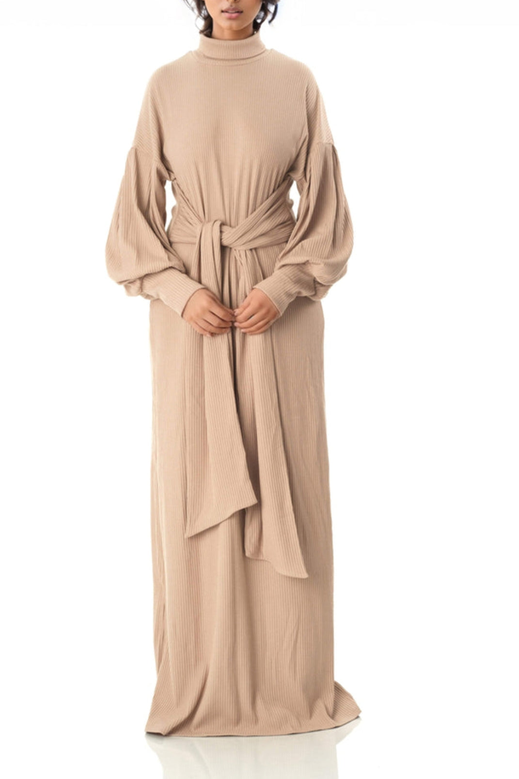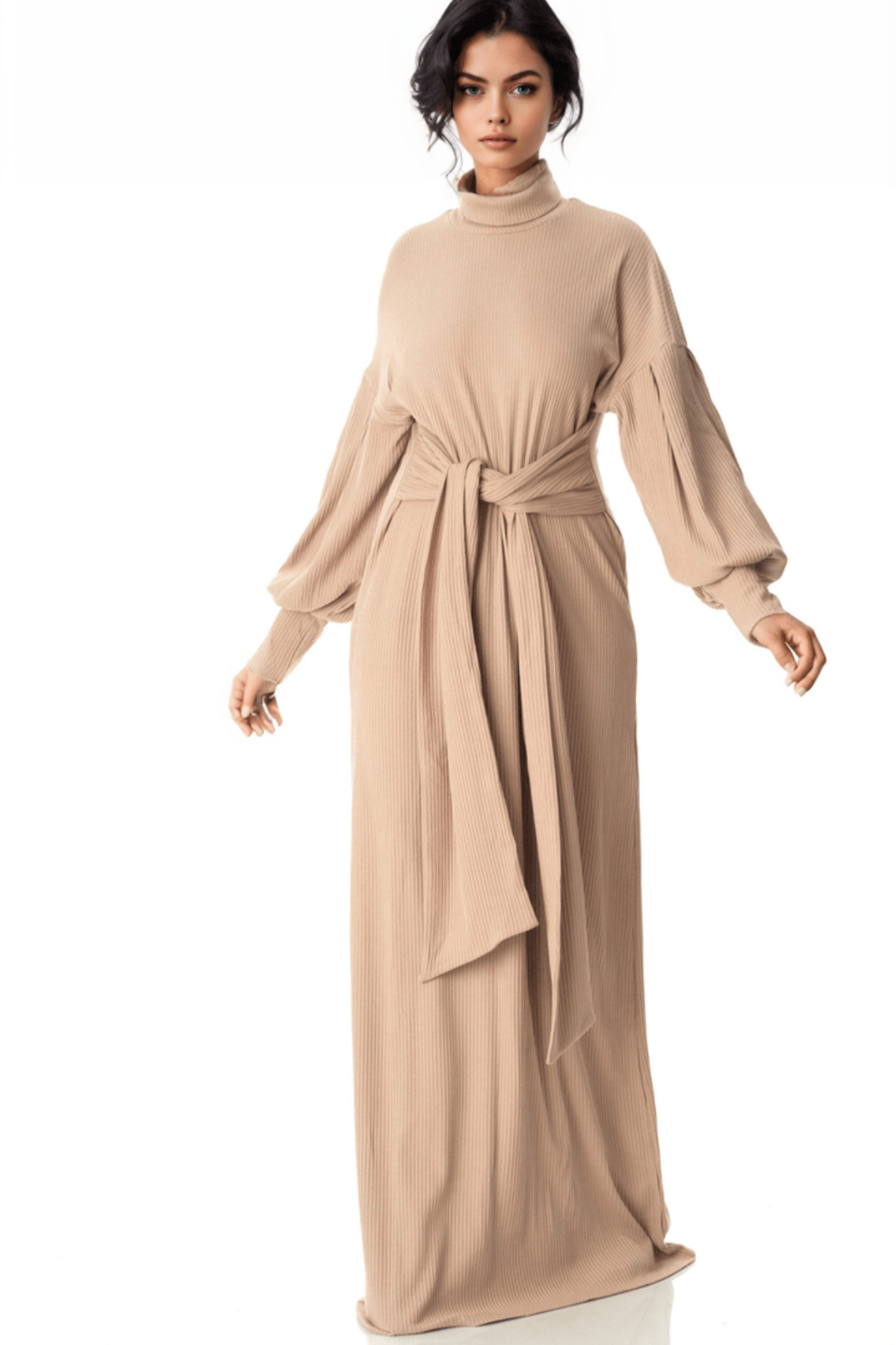Add this season's must-have hue to your look with this Ribbed-Knit Turtleneck Sweater dress. Featuring a large attached belt that you can tie it front or back. Made ribbed material with a high neckline and beautiful sleeve detailing, we are in love
