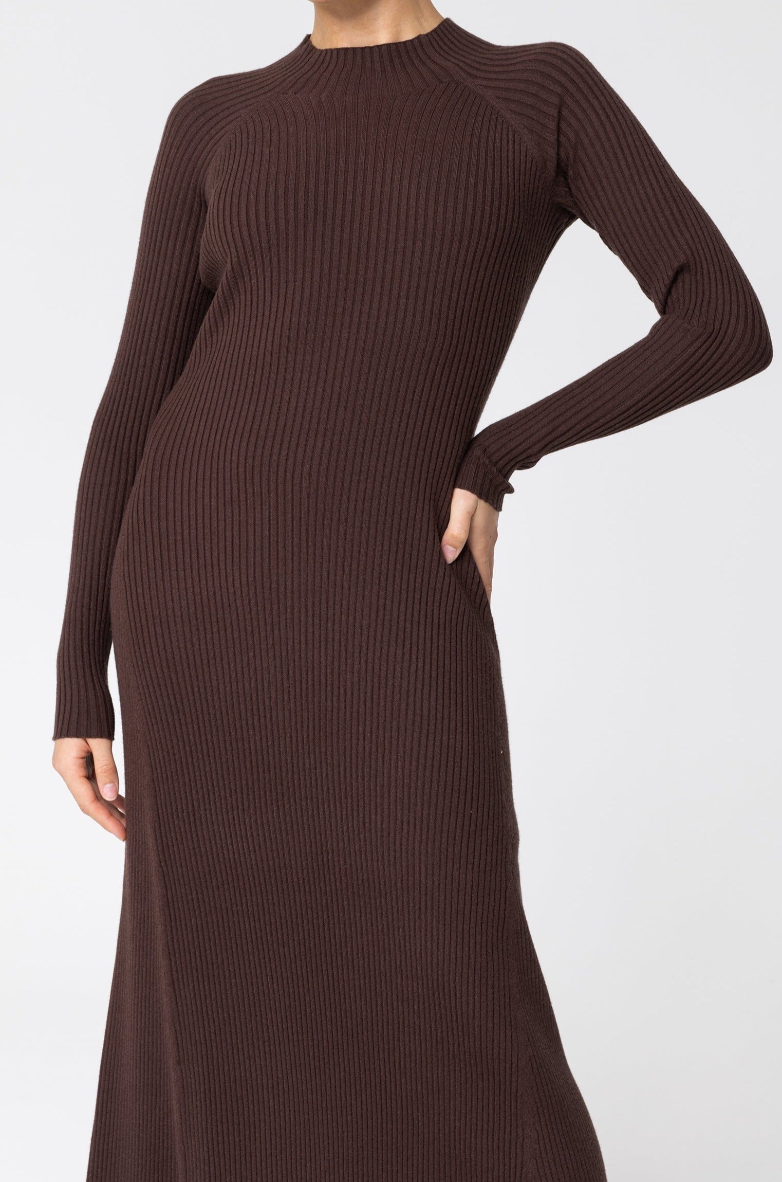 The feminine silhouette of the Marwa Ribbed Dress is designed with a timeless bodice. This elegant long dress is made using a special construction, extending the body into sleeve tubes with a flattering yet subtle mock neck.