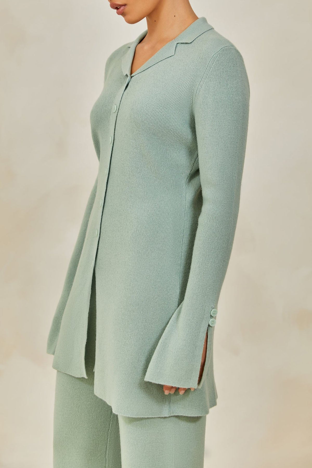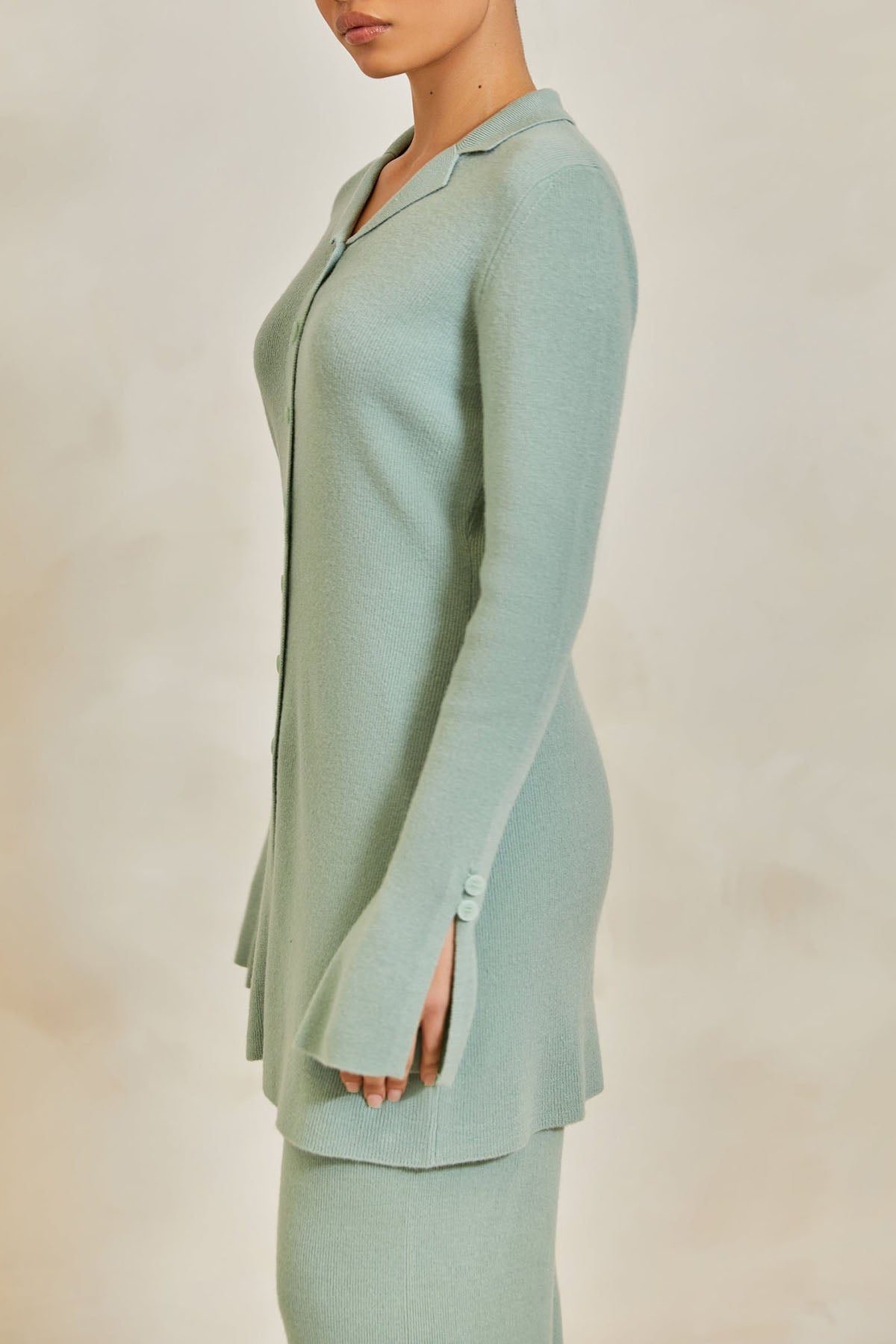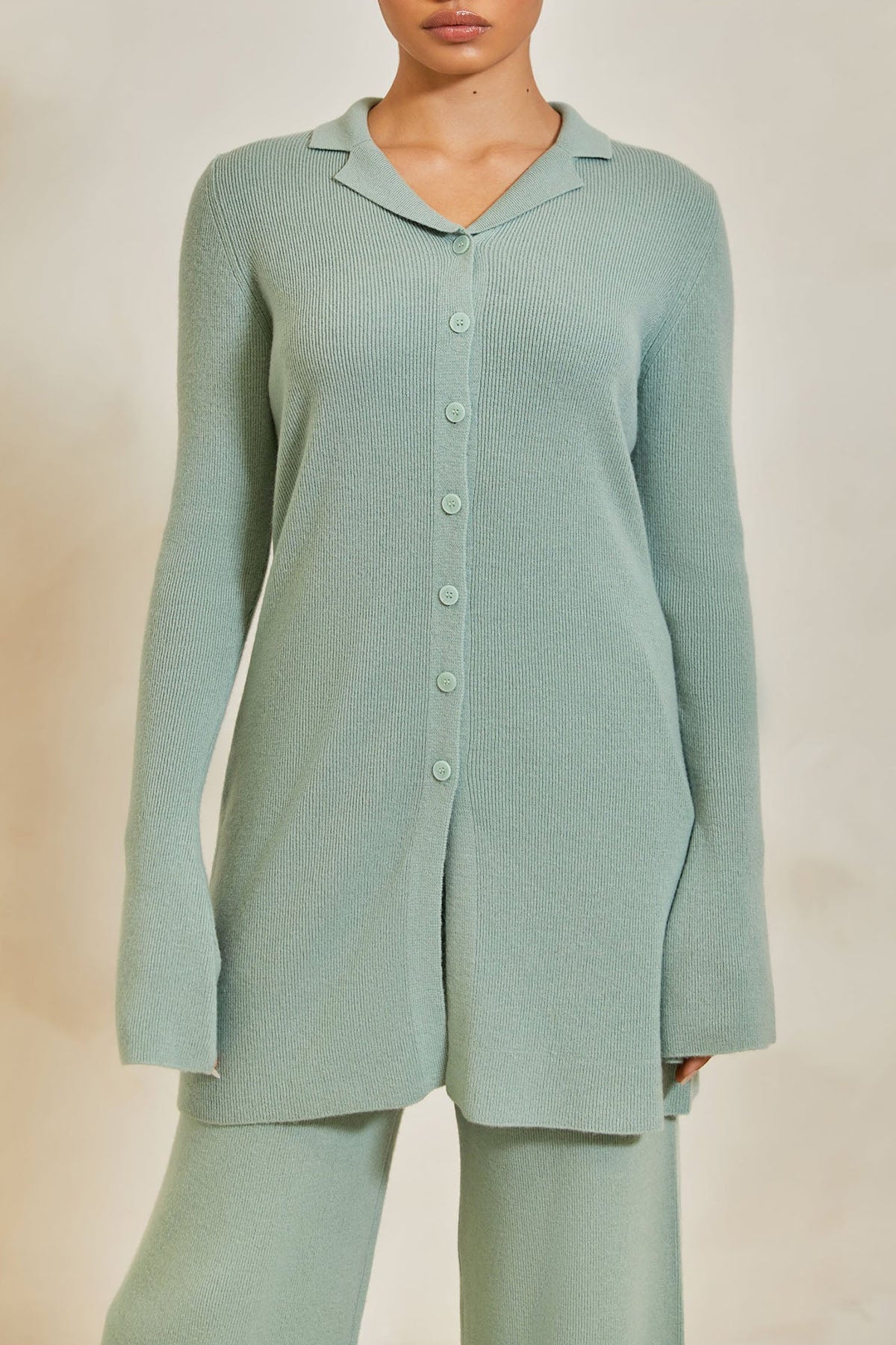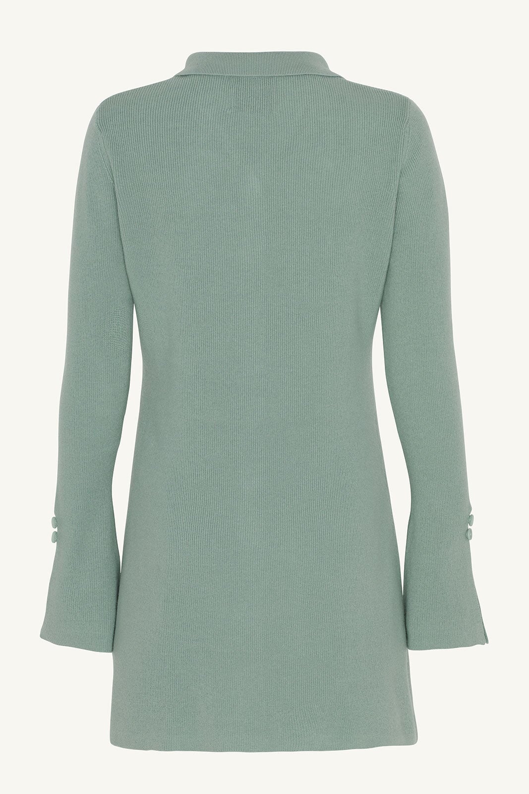 The button down sweater top is knitted from artificial wool. The sleeves are split with button details and the front hem is split to accentuate the relaxed silhouette. This sweater top is cut in a relaxed fit.
