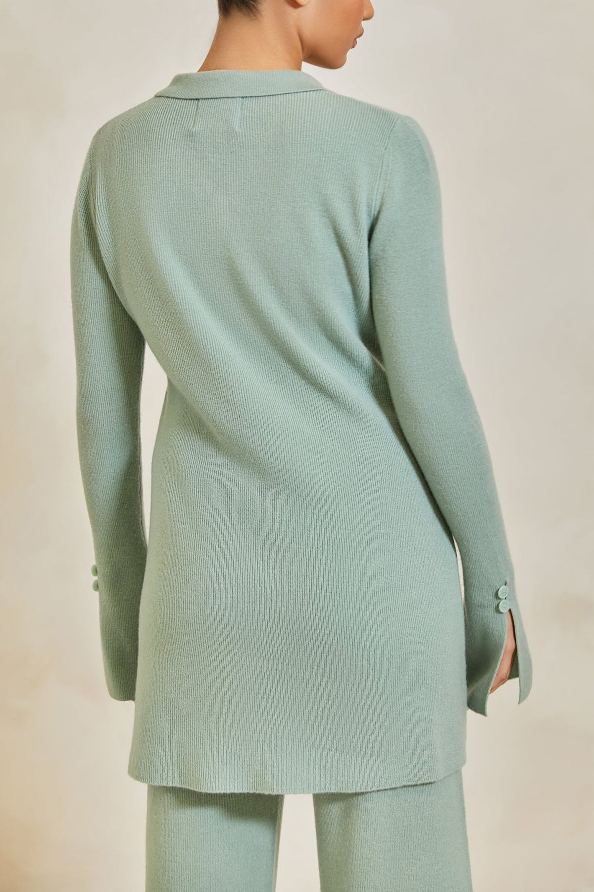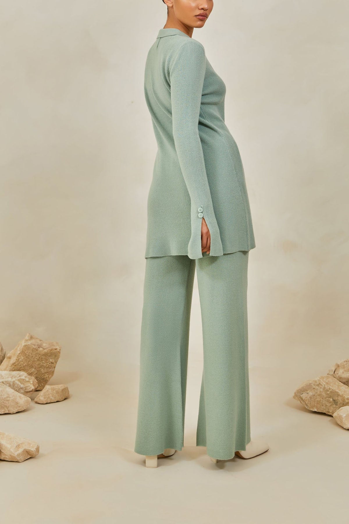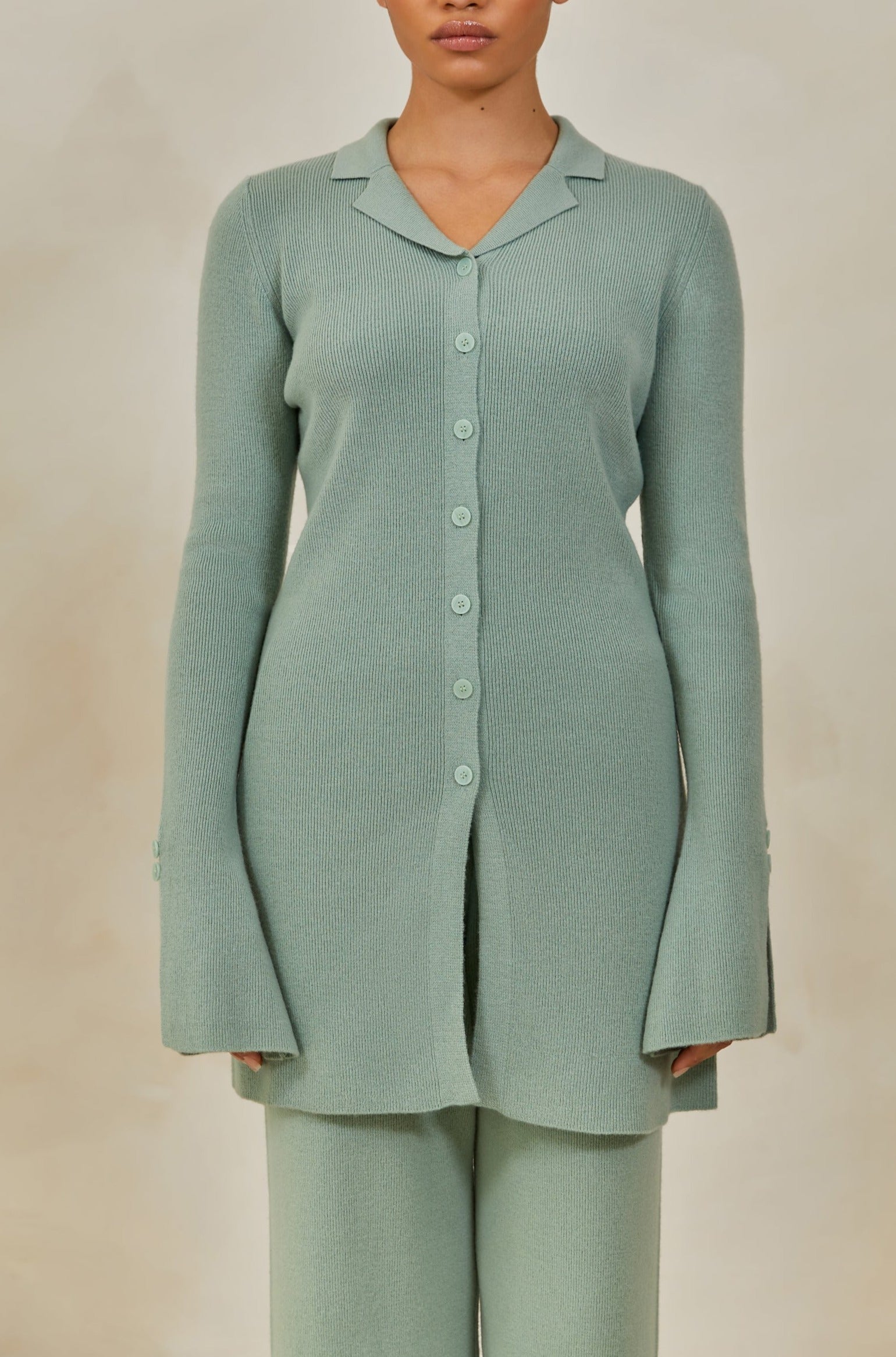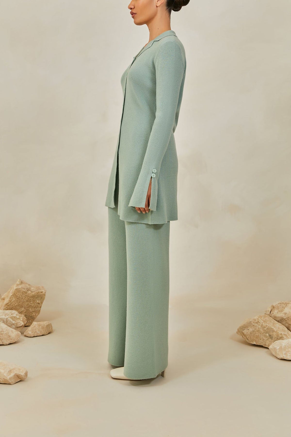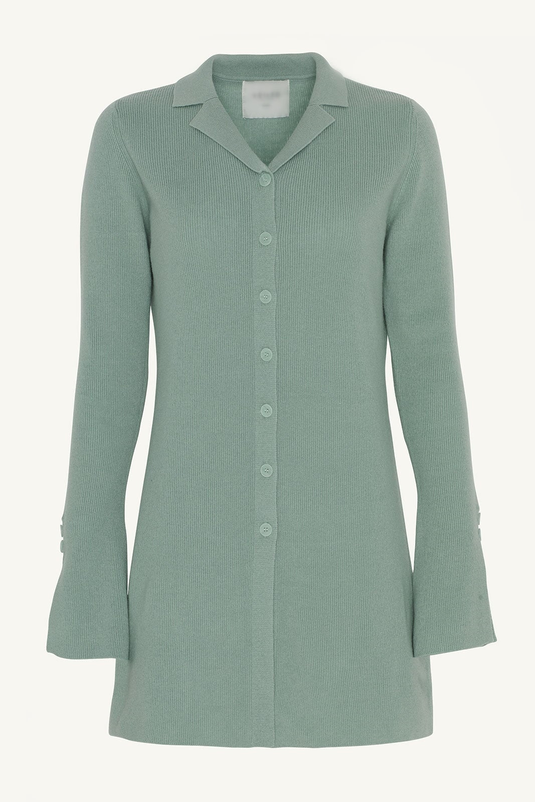 The button down sweater top is knitted from artificial wool. The sleeves are split with button details and the front hem is split to accentuate the relaxed silhouette. This sweater top is cut in a relaxed fit.