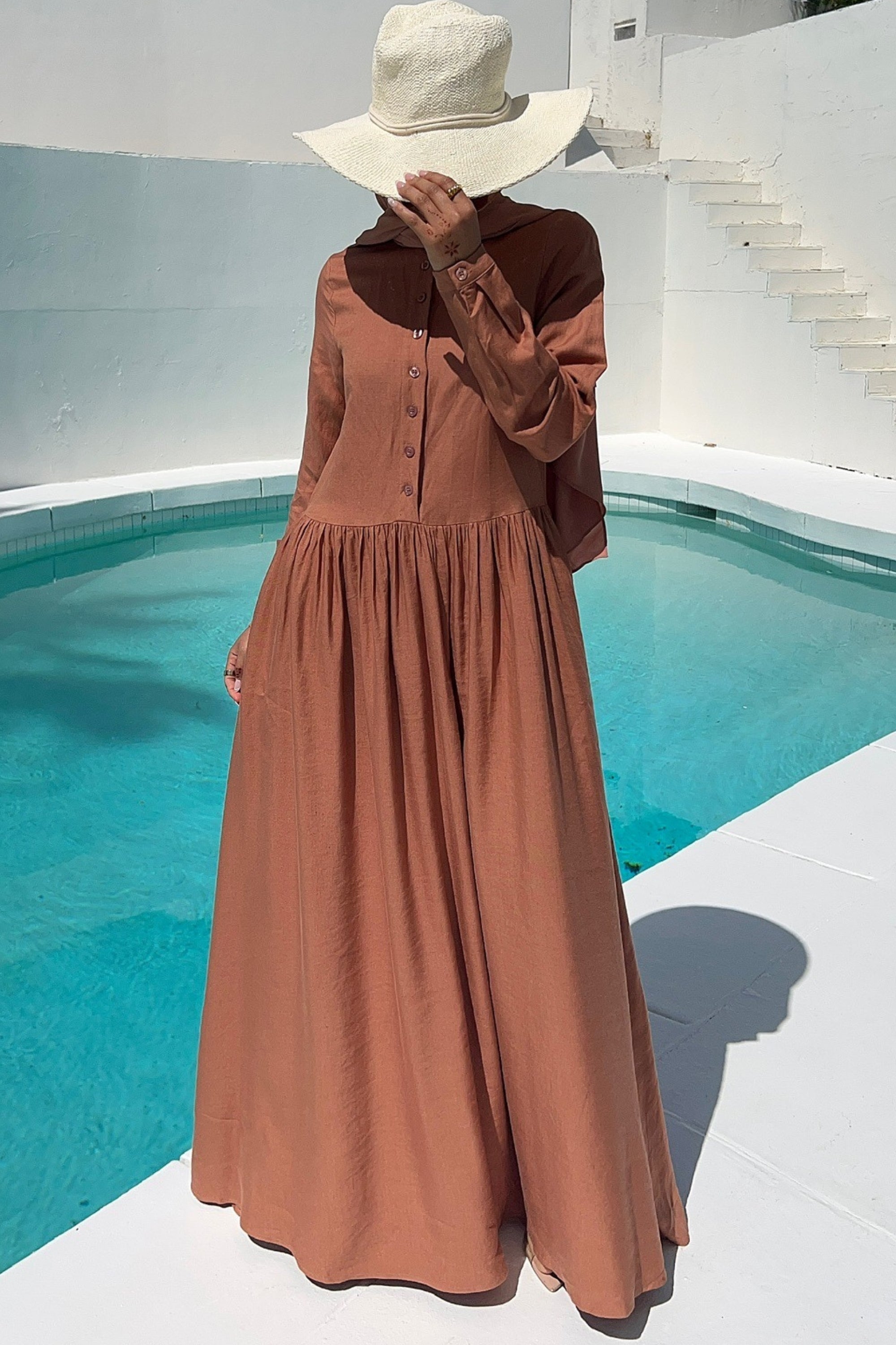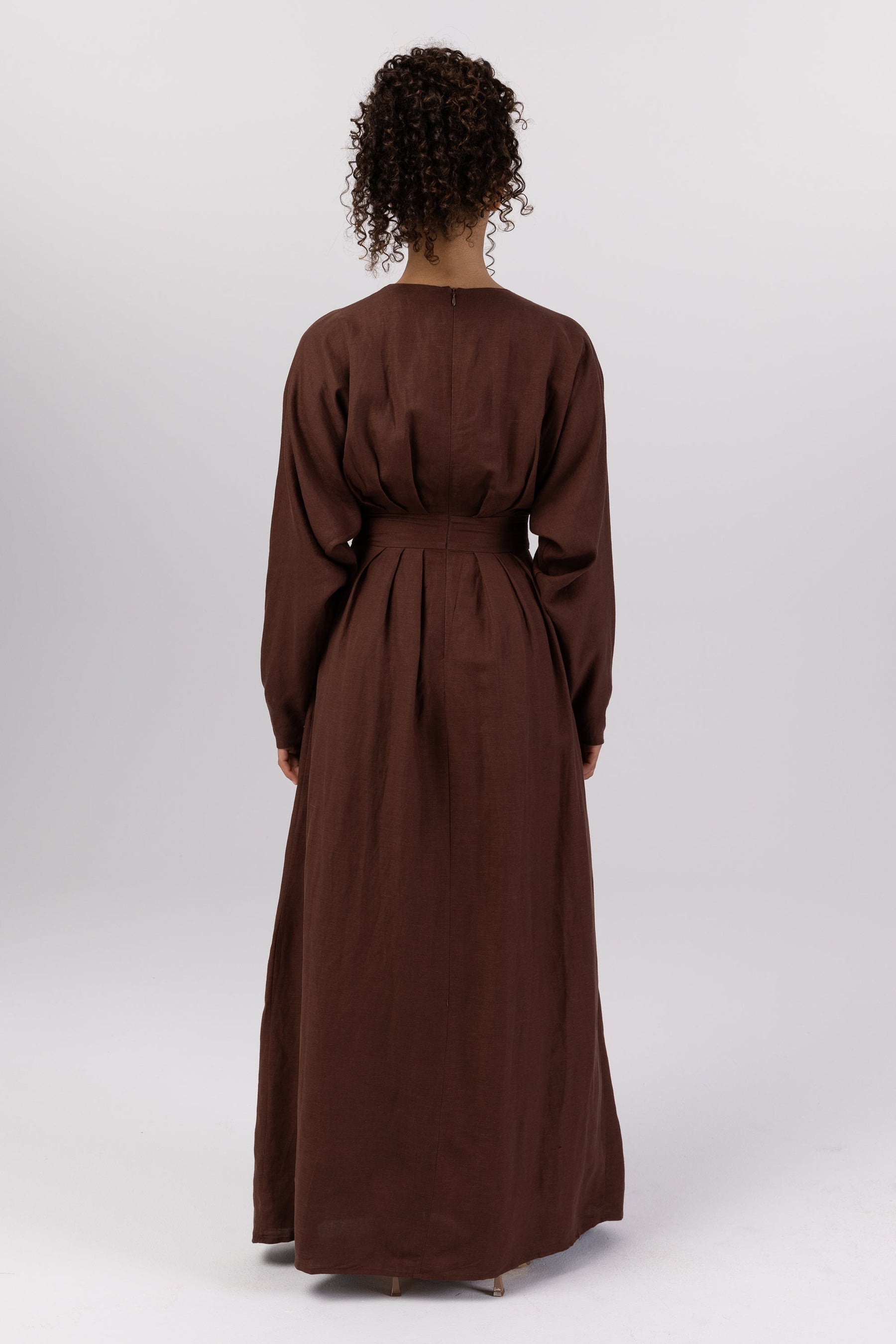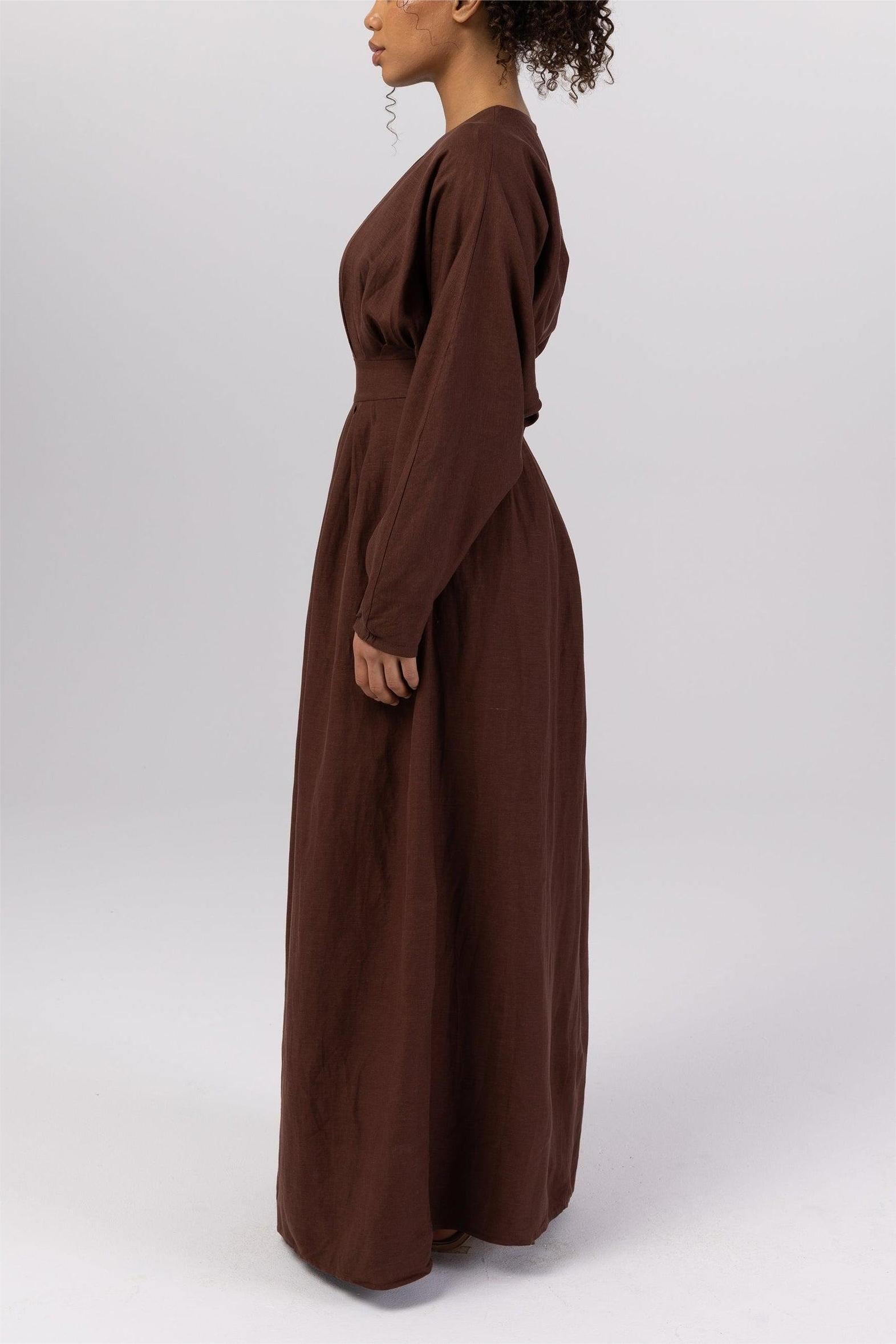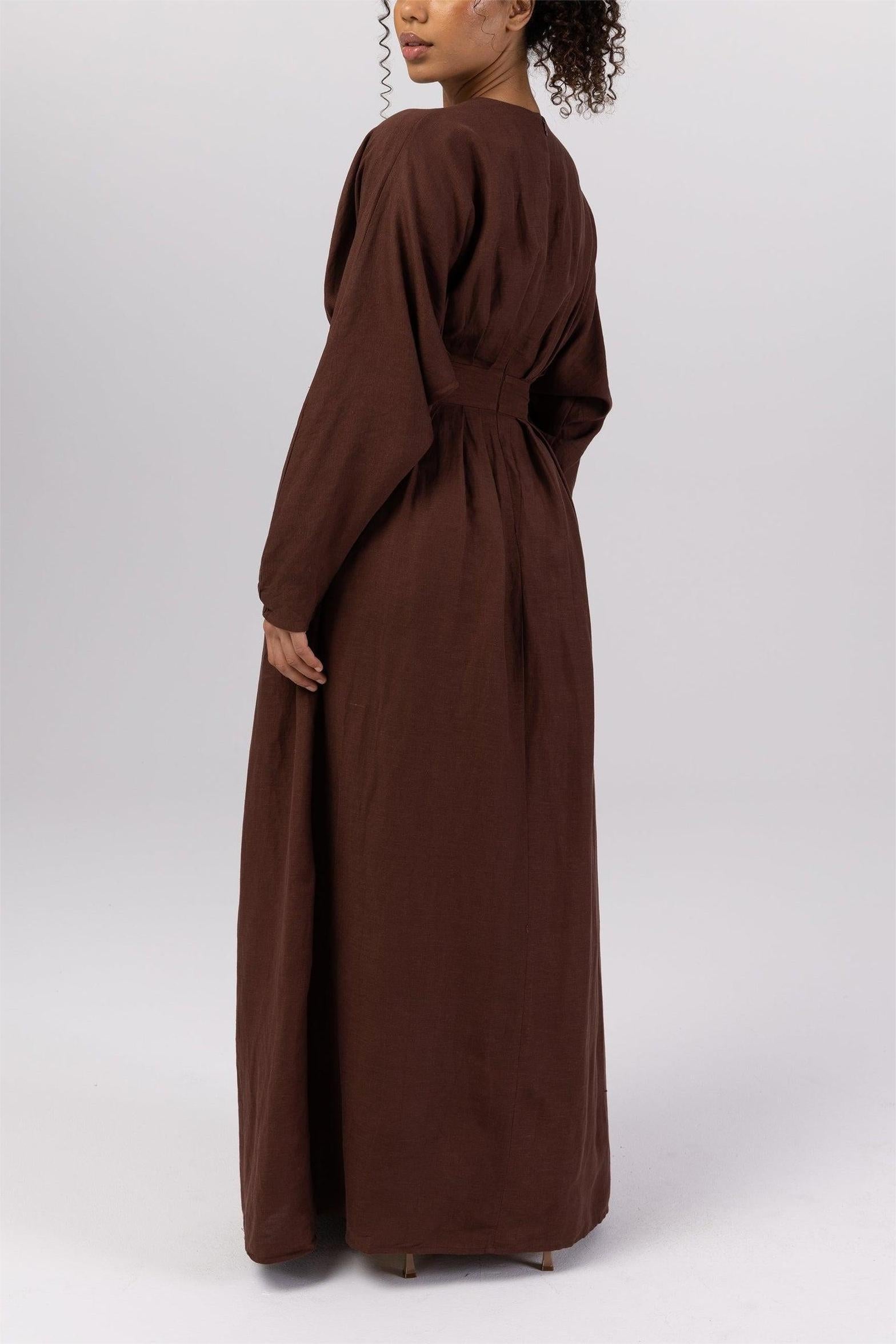 Sabah Cotton Linen Overlay Maxi Shirt Dress -Brown