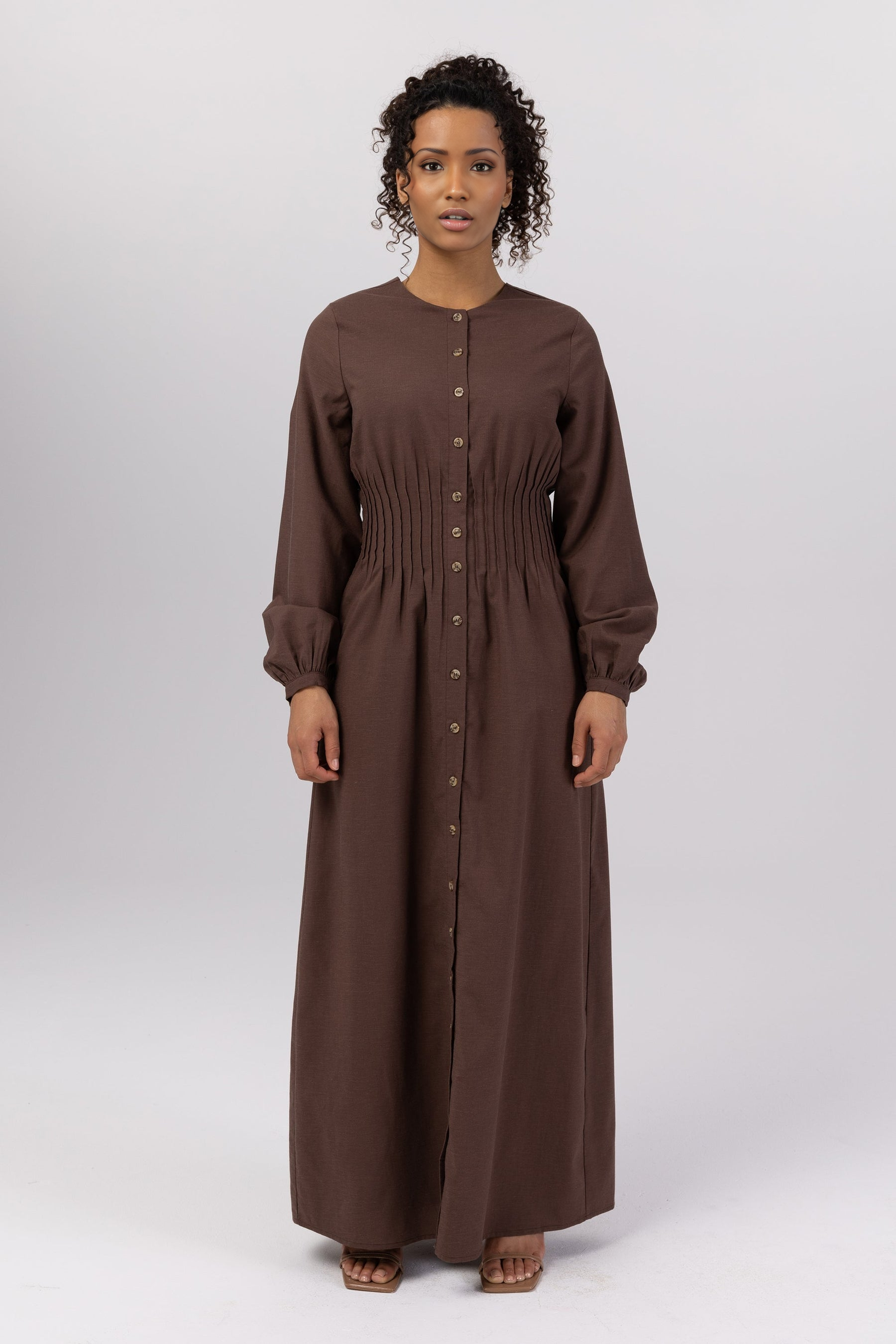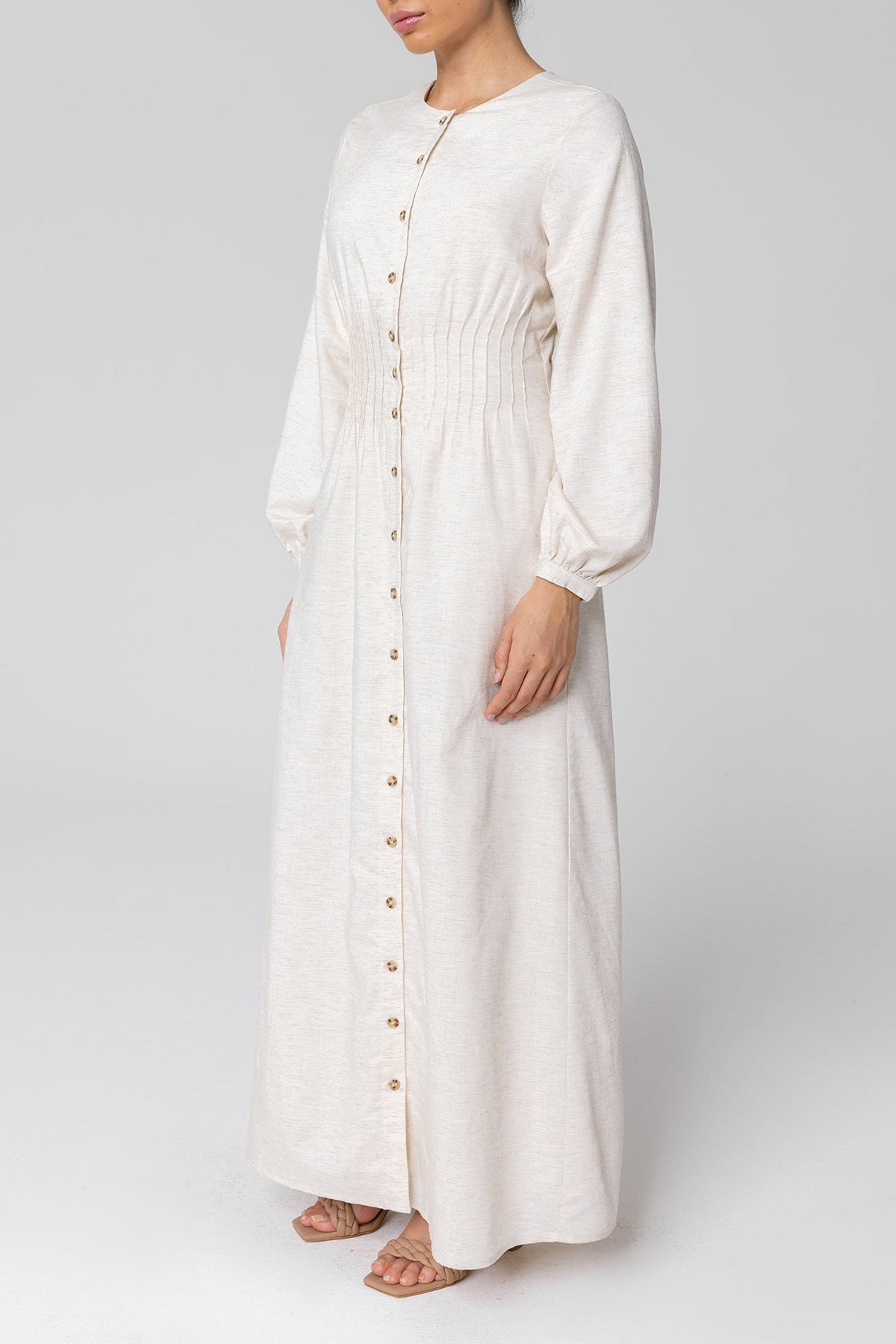 The Lila dress is crafted from a soft viscose and linen blend fabric, a feminine pin-tucked waist and a comfortable button front design.
