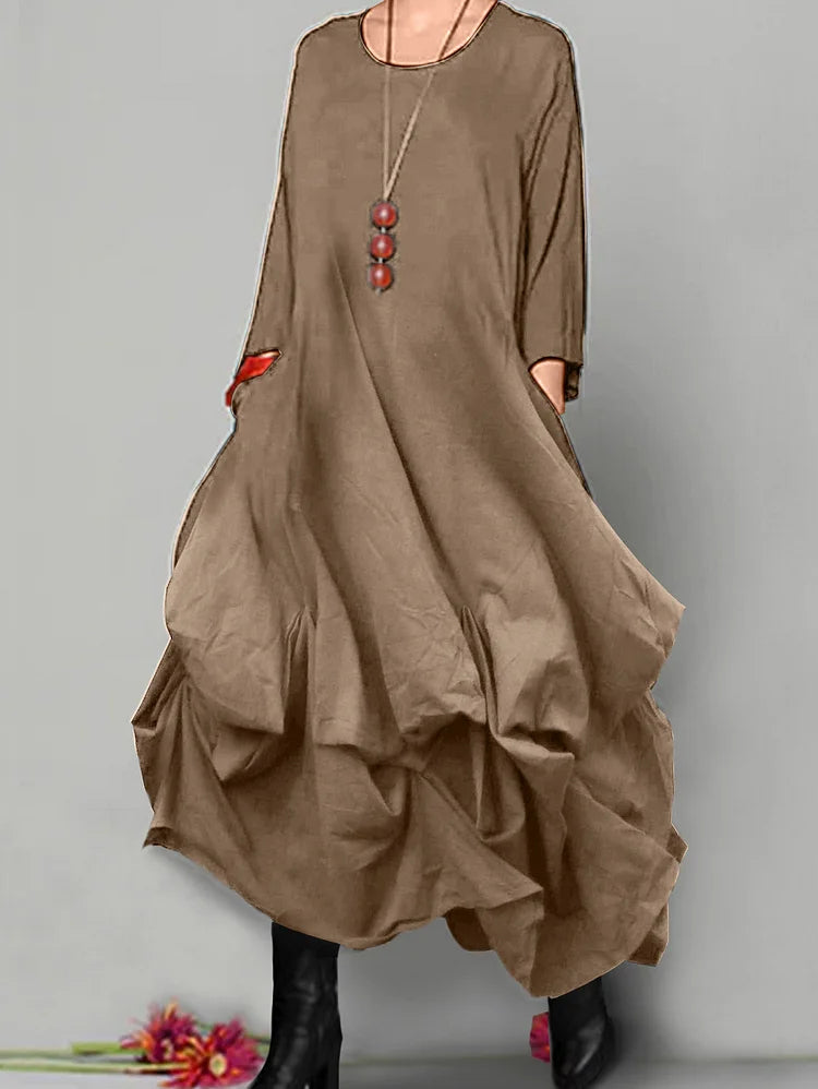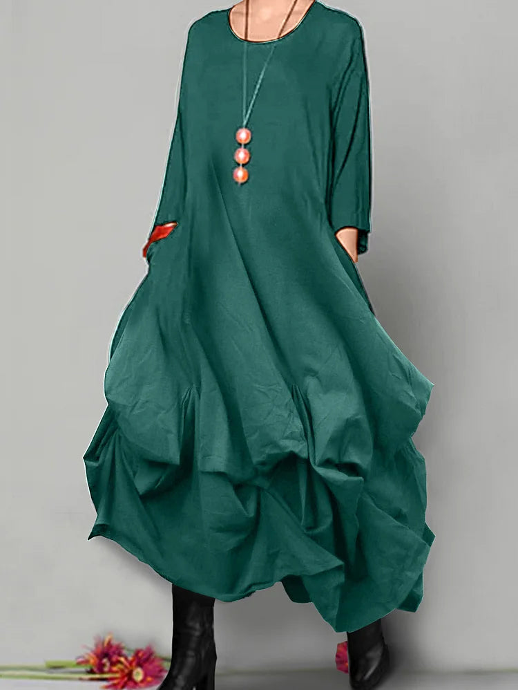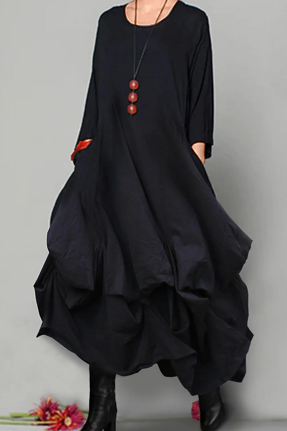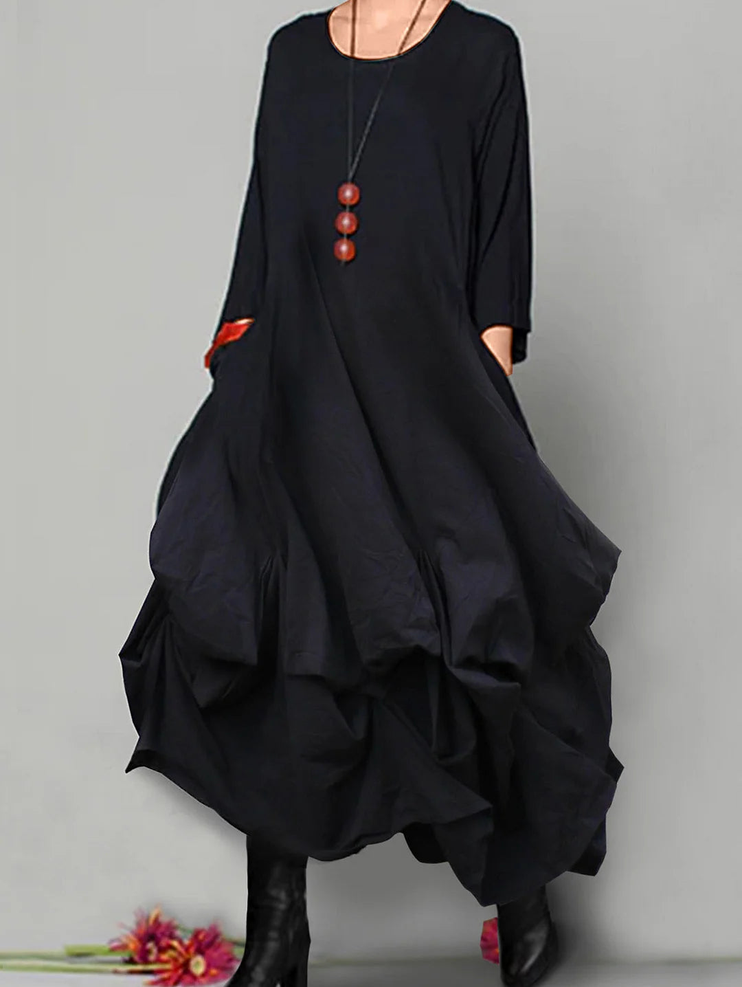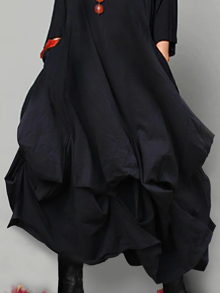 Solid Round Neck Slouchy Asymmetrical Hem Midi Dress