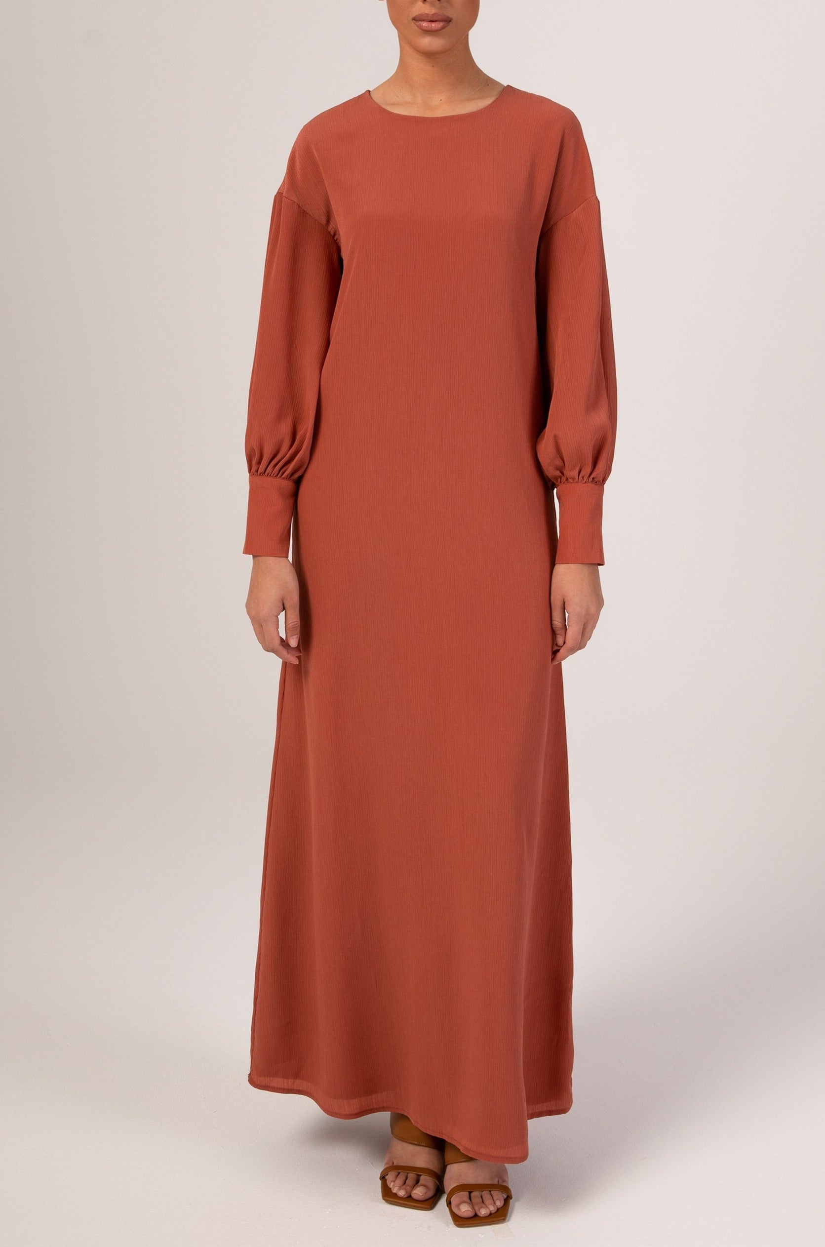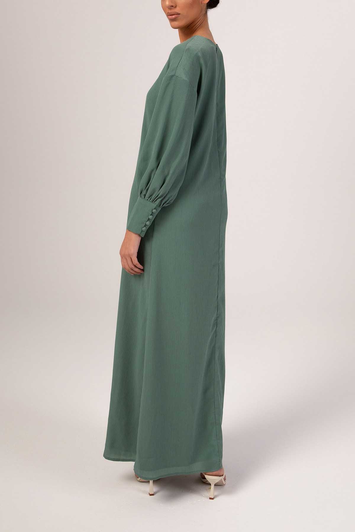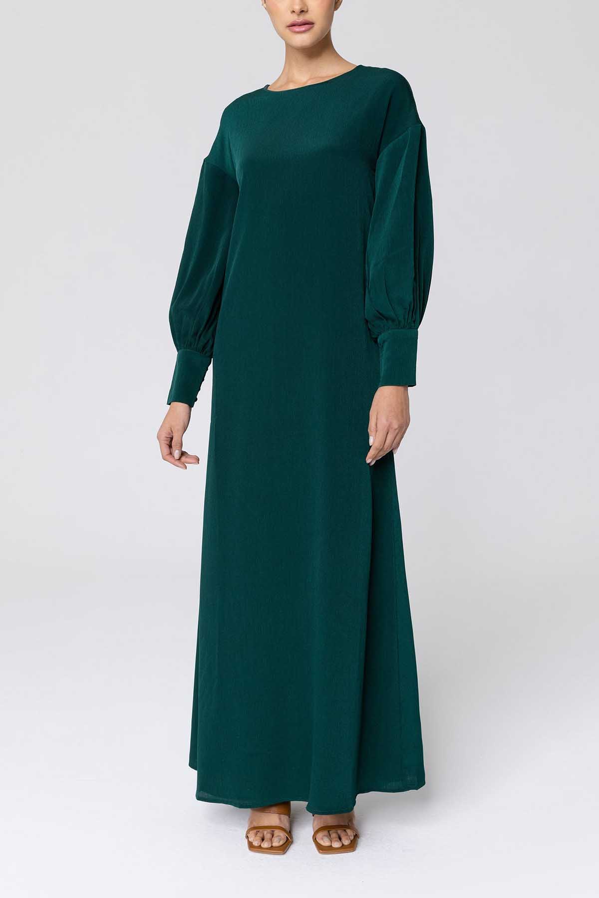 The Madina maxi dress features a subtle textured fabric, slightly oversized buttoned cuffed sleeves, and a loose fit design perfect for every day wear.