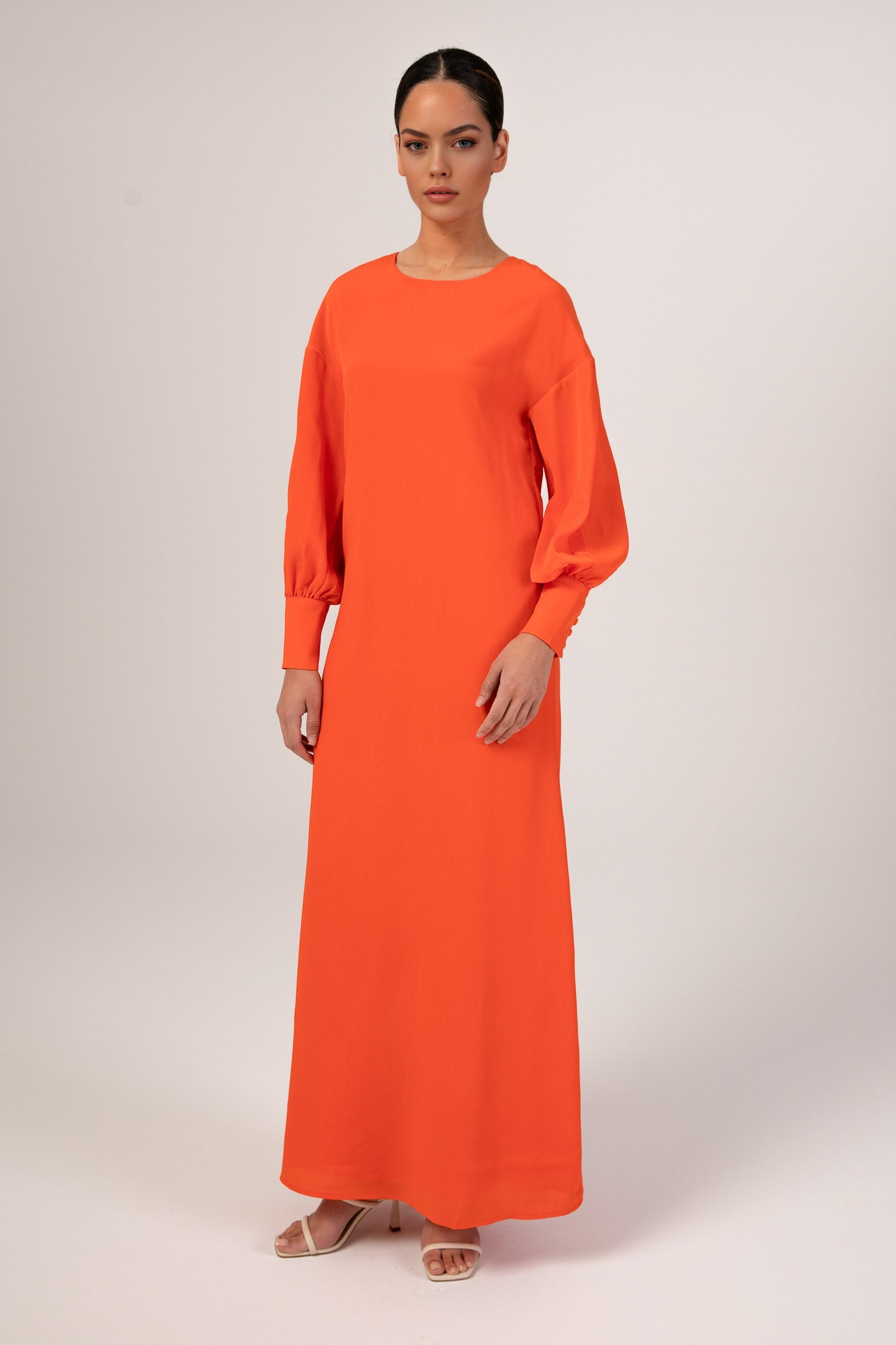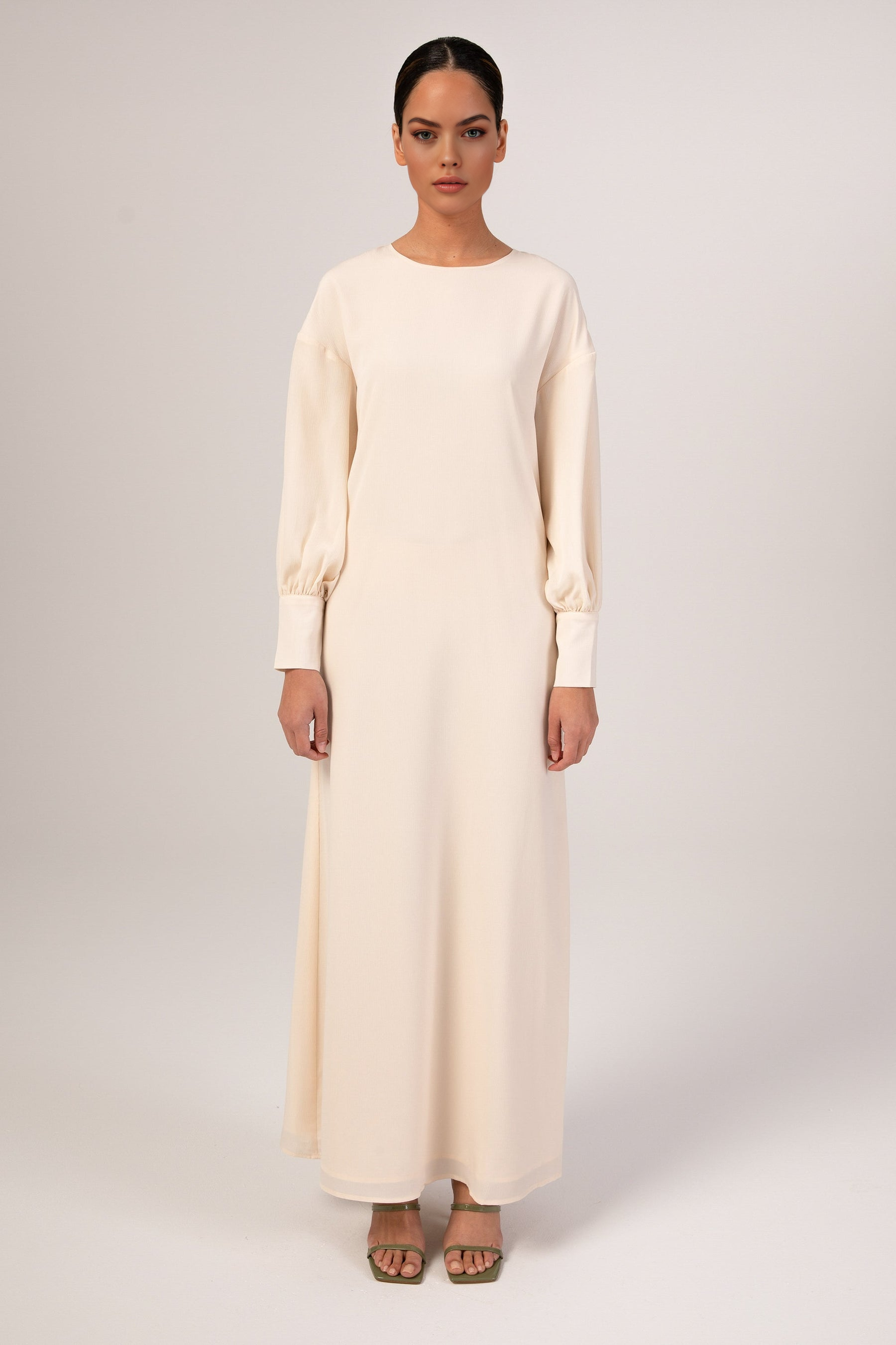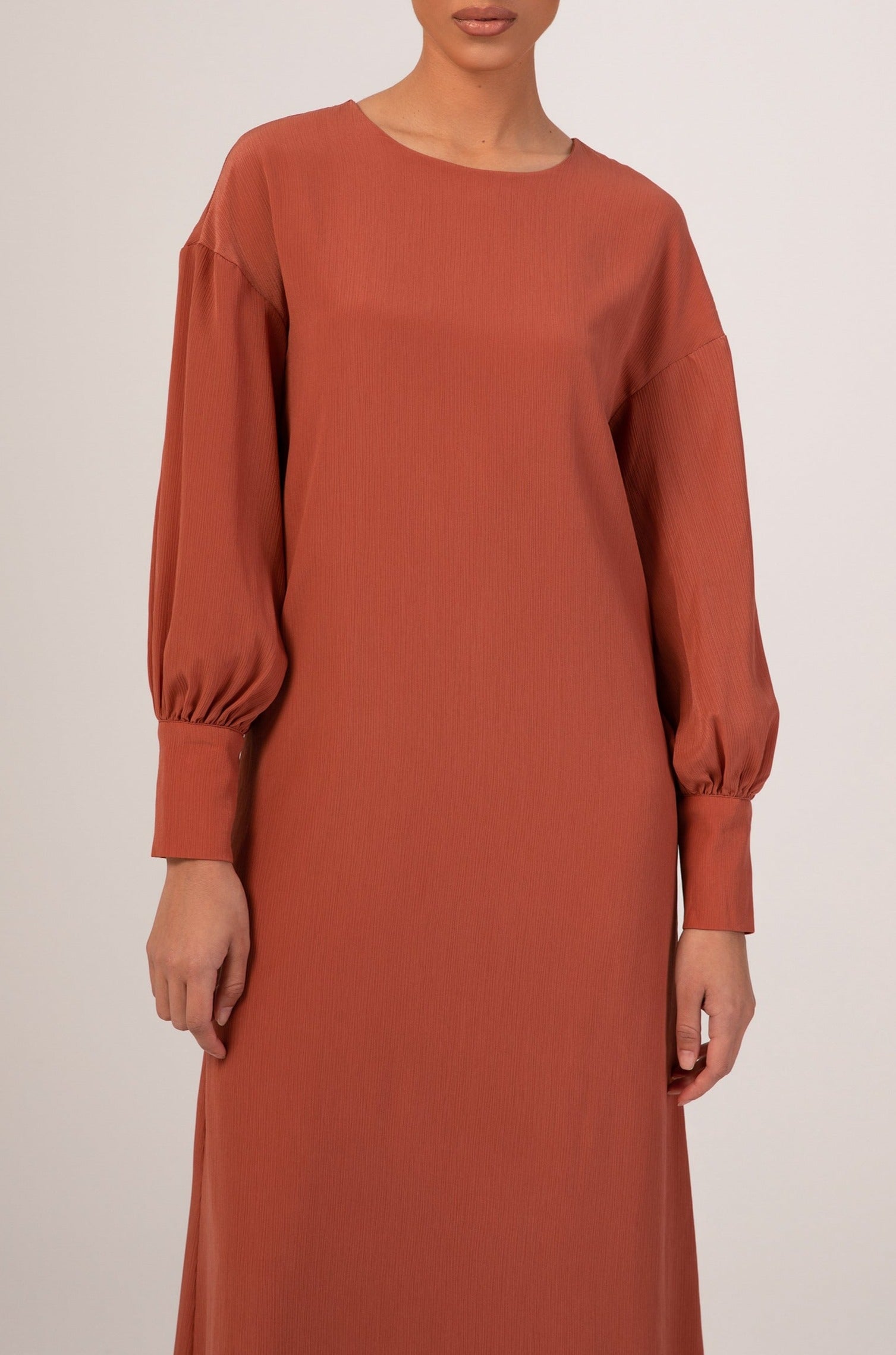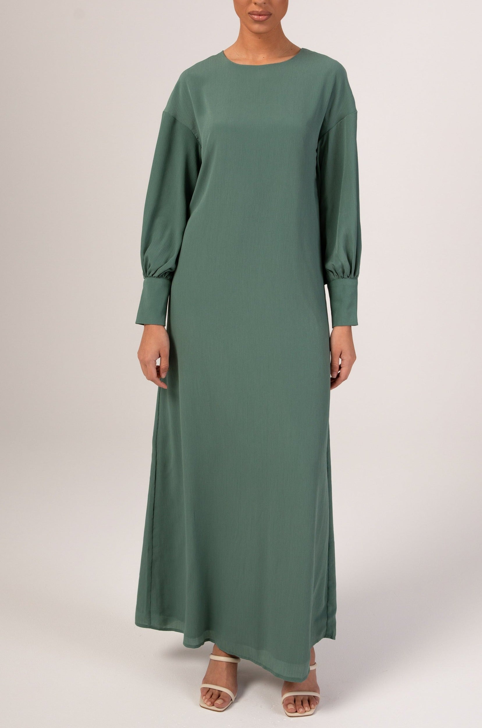 The Madina maxi dress features a subtle textured fabric, slightly oversized buttoned cuffed sleeves, and a loose fit design perfect for every day wear.