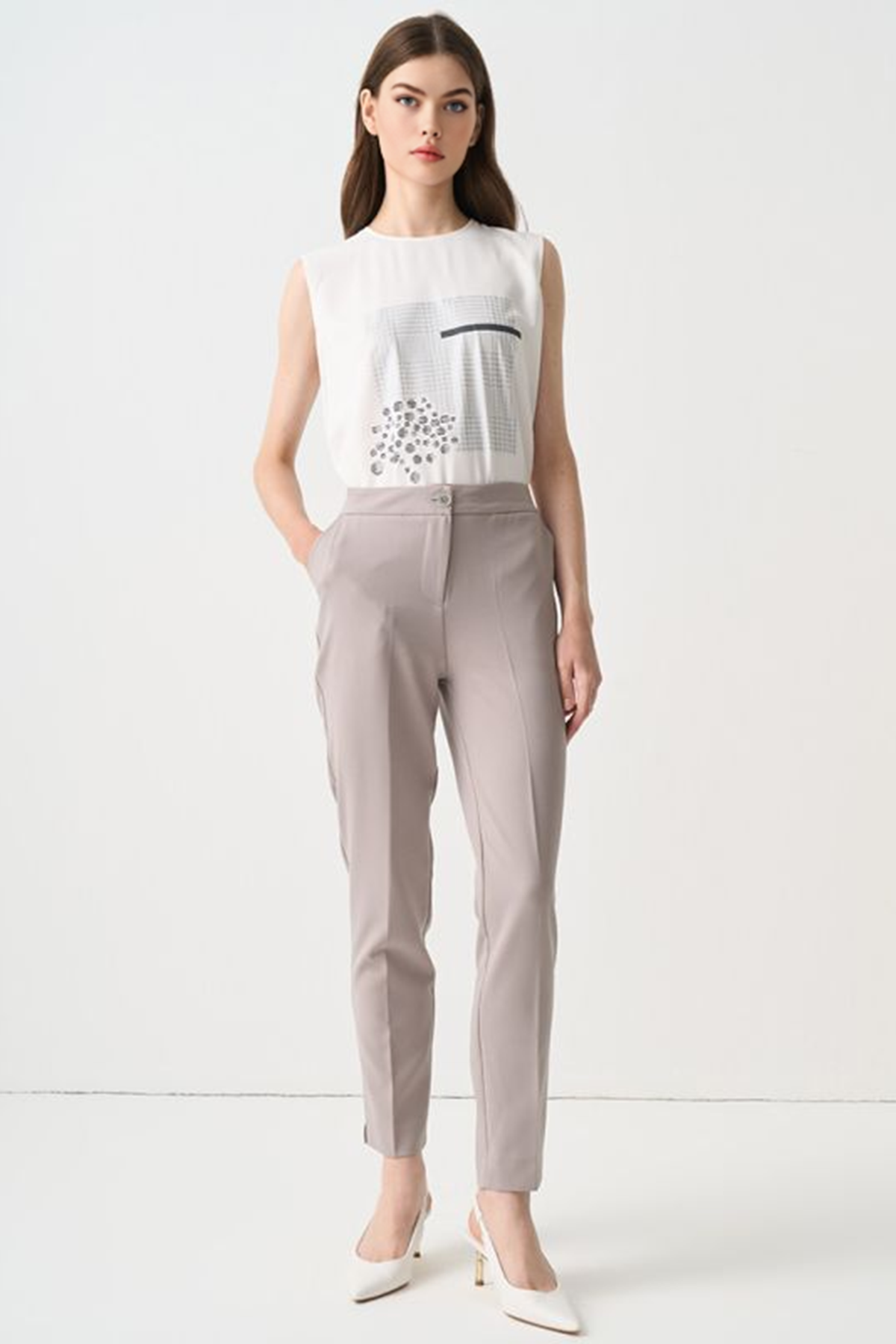 This Modern Trouser will give you the look you need and the style you crave. Style: Trouser Occasion: Formal Design: Side Pockets, Regular Fit, Faux Back Pockets Closure: Front Zipper and Button Length: Ankle Length Material: 90% Polyester, 10% Elastane Model Measurements: Height: 175cm, Waist: 59cm Model is Wearing: Small