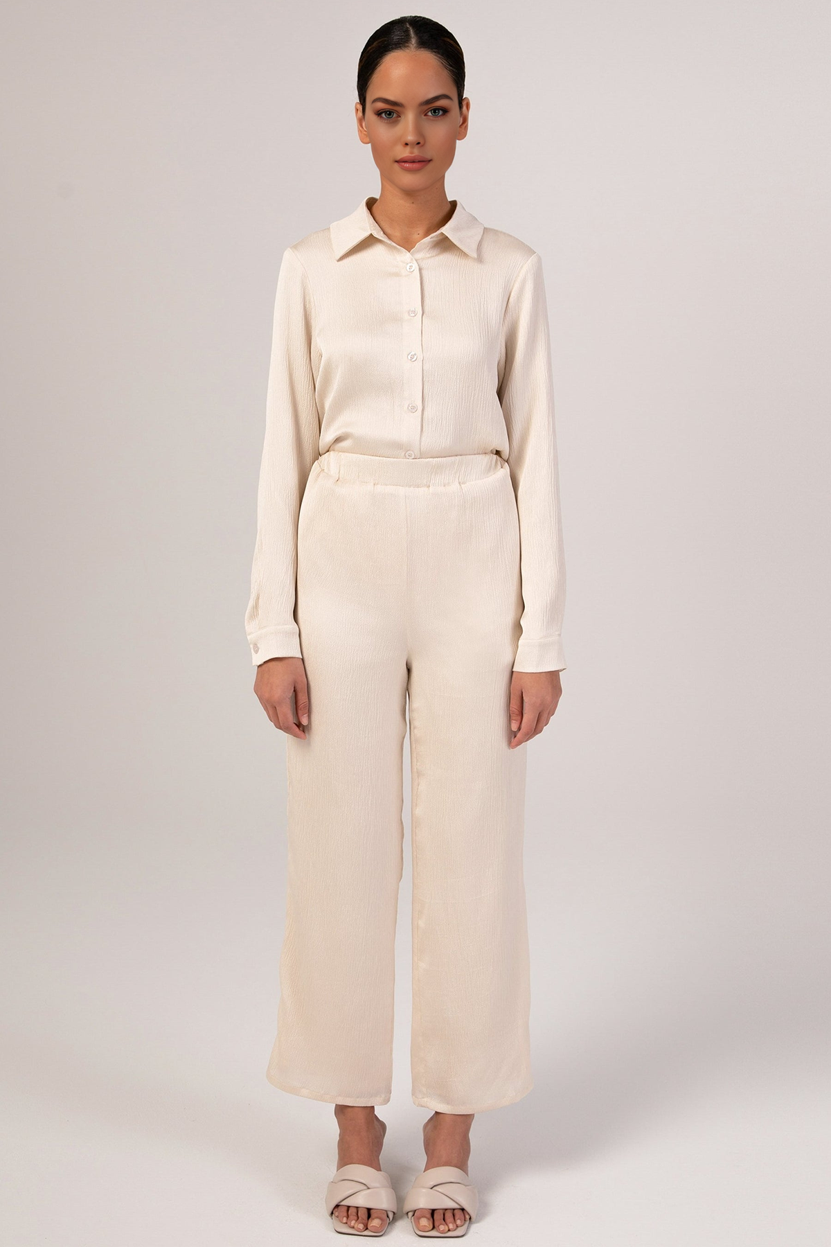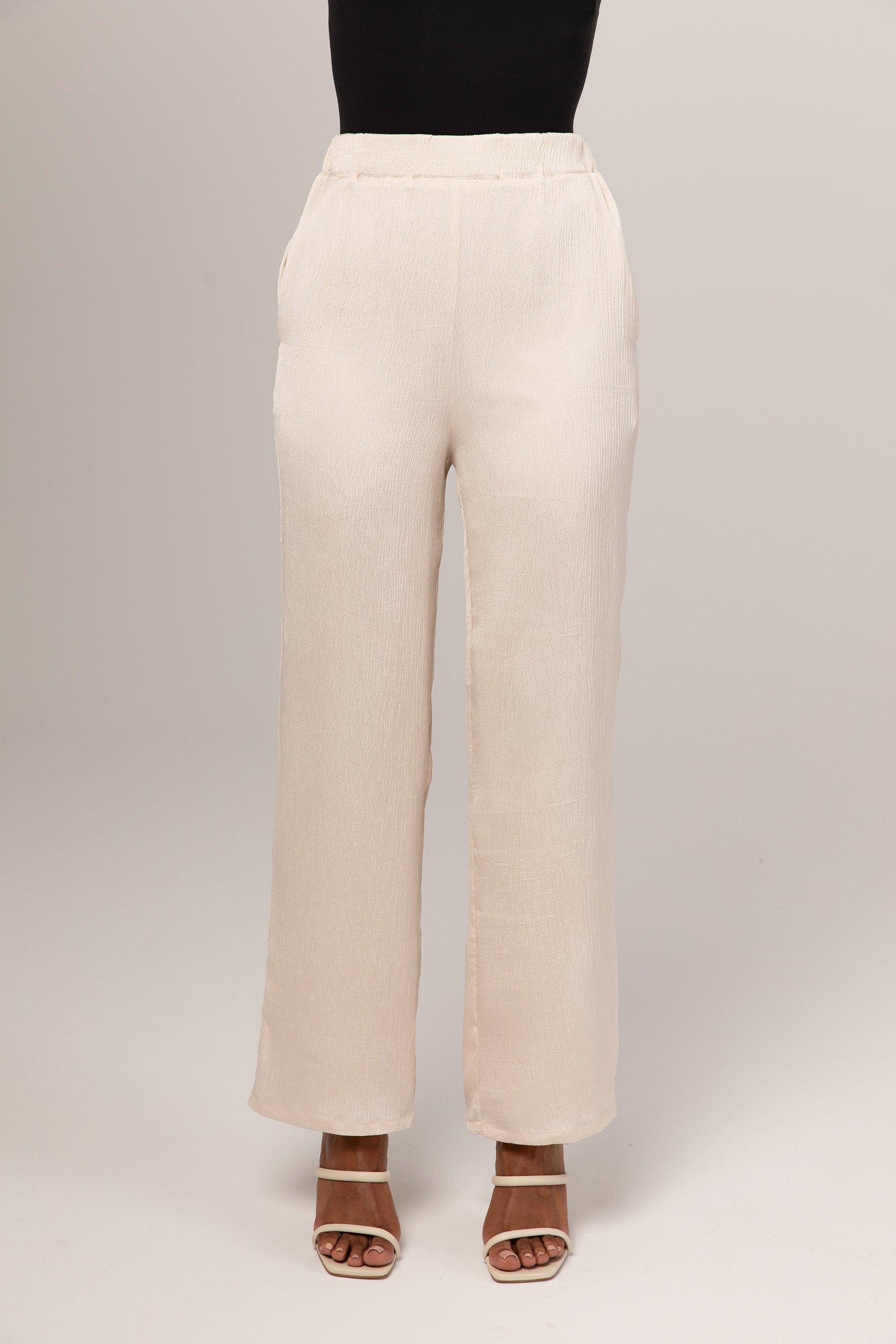 The Katia pants feature a modest wide leg, comfortable elastic banded waist and a subtle textured fabric with slight sheen for a versatile look.