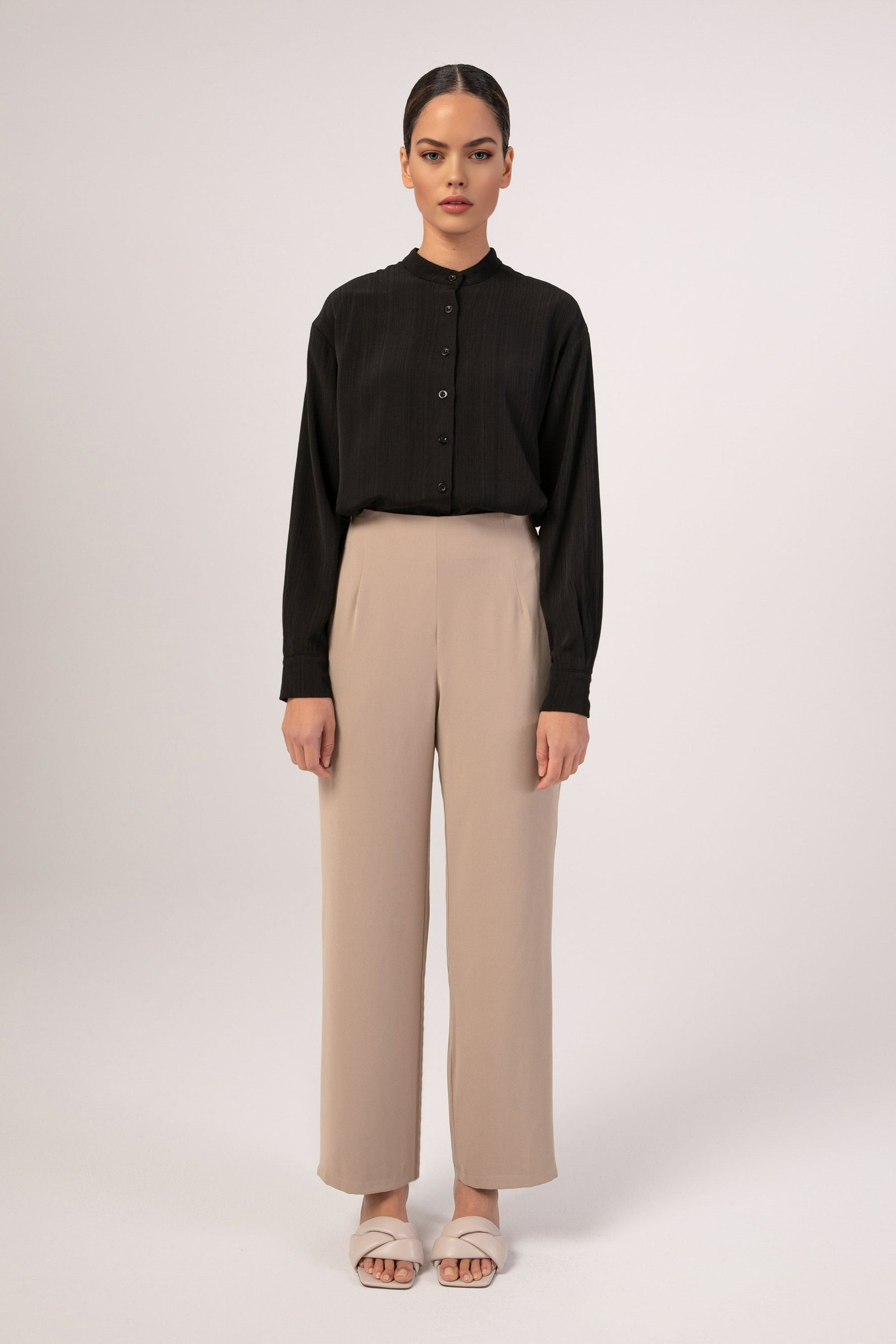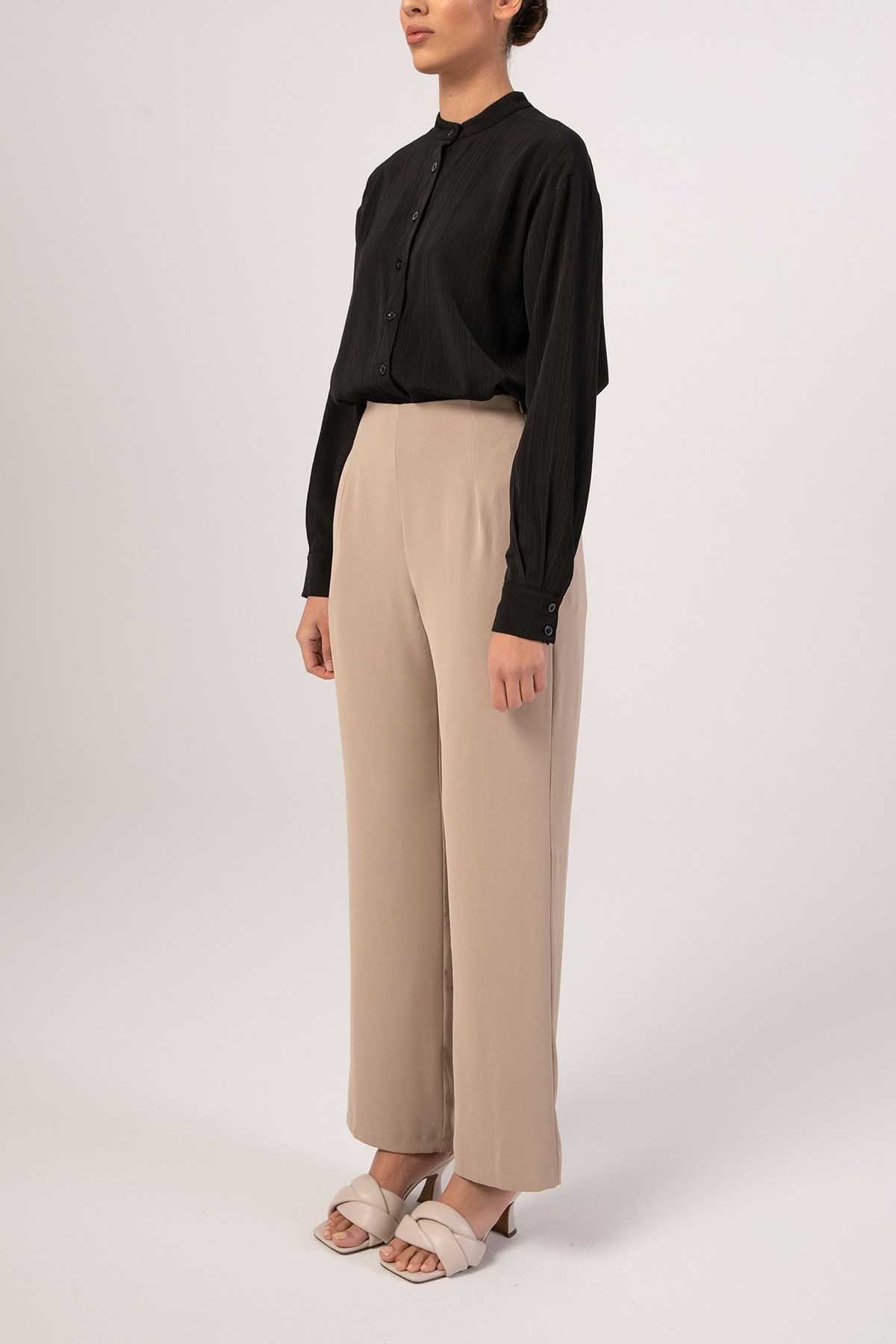 These seamless waist pants feature a modest wide leg, subtle waist pleat and a flattering high rise.