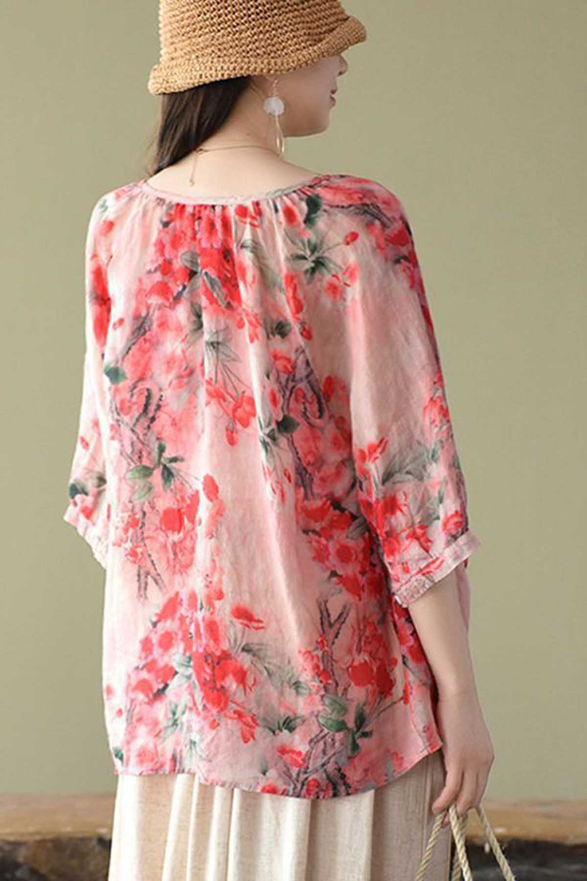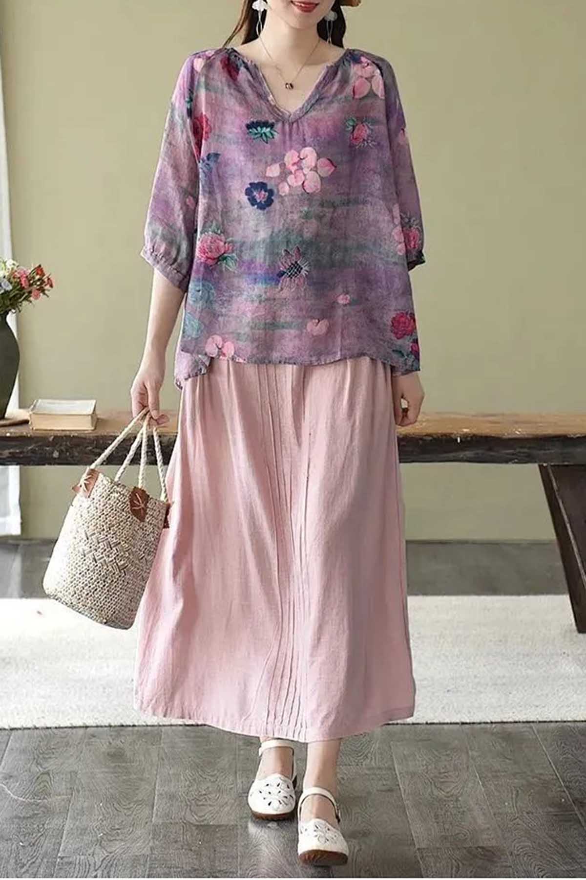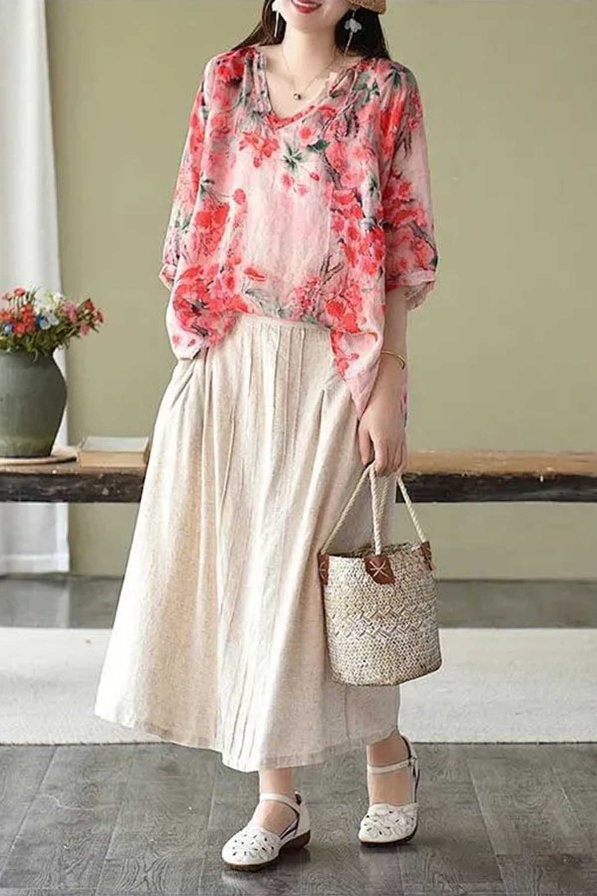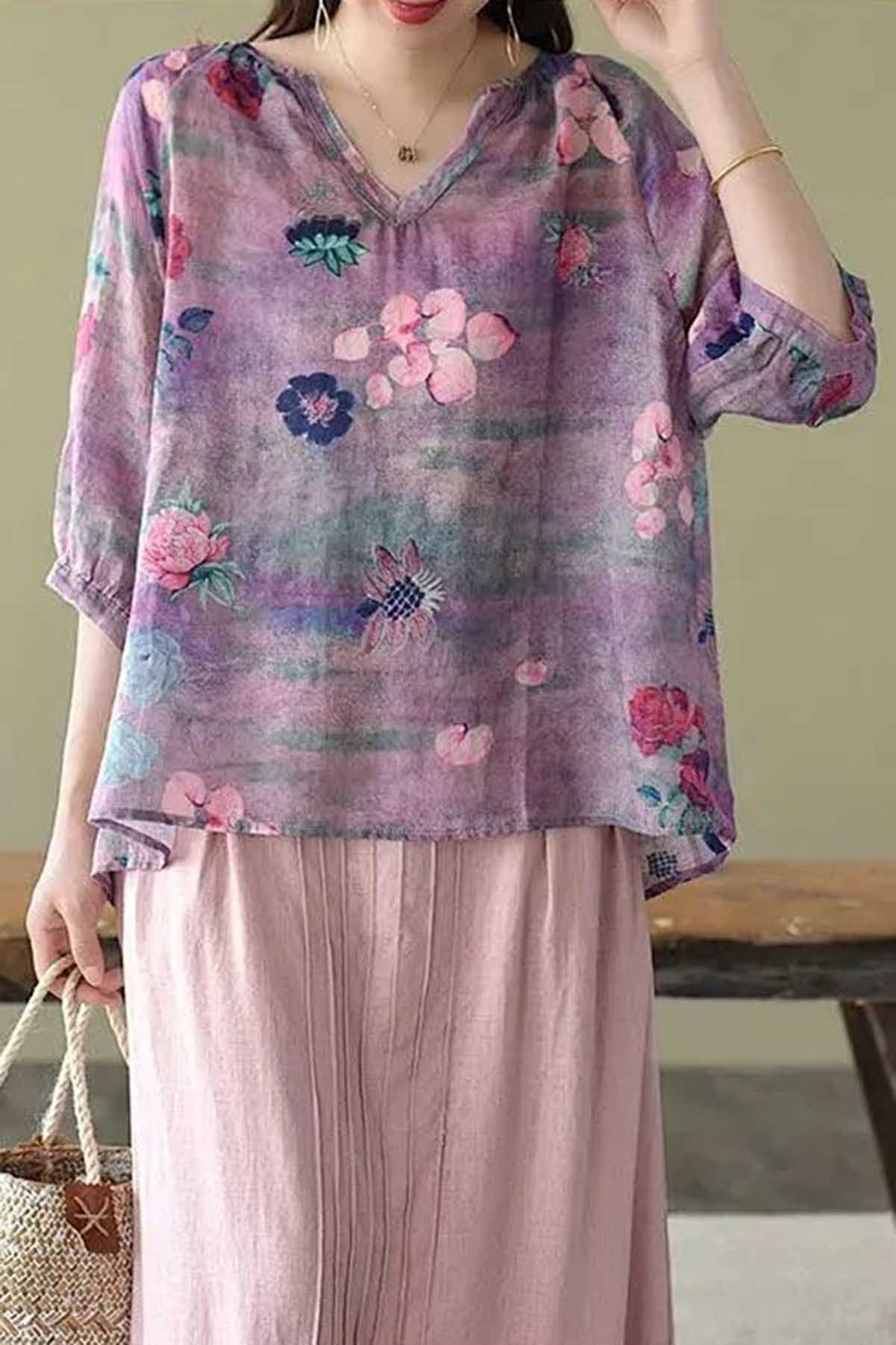 Boutique V Neck Print Loose Half Sleeve Blouses