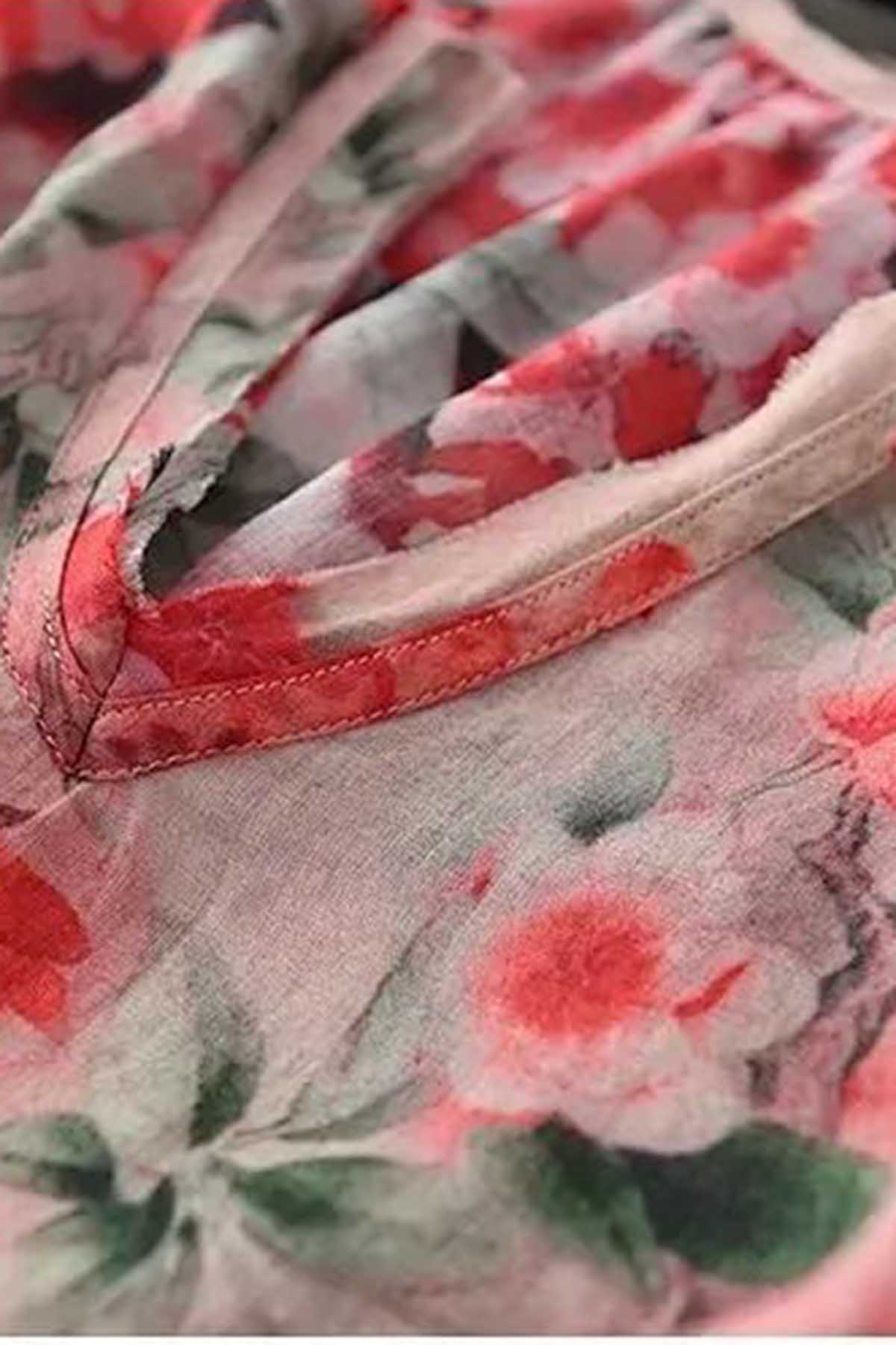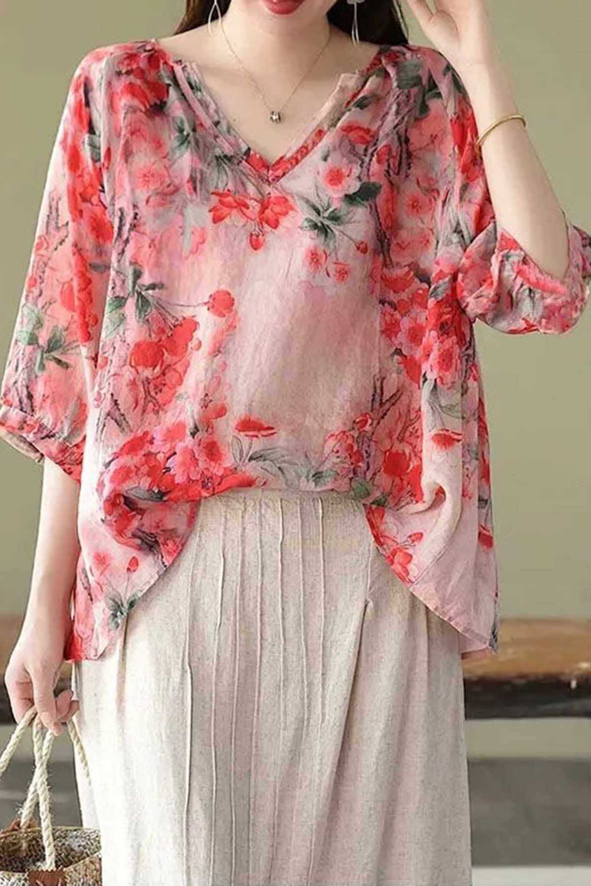 Boutique Pink V Neck Print Loose Fall Half Sleeve Blouses