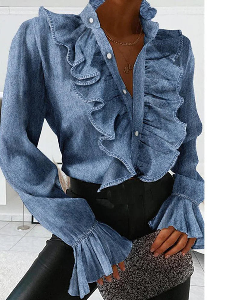 Elegant Plain Ruffled Pressed Pleated Long Flared Sleeve Shirt