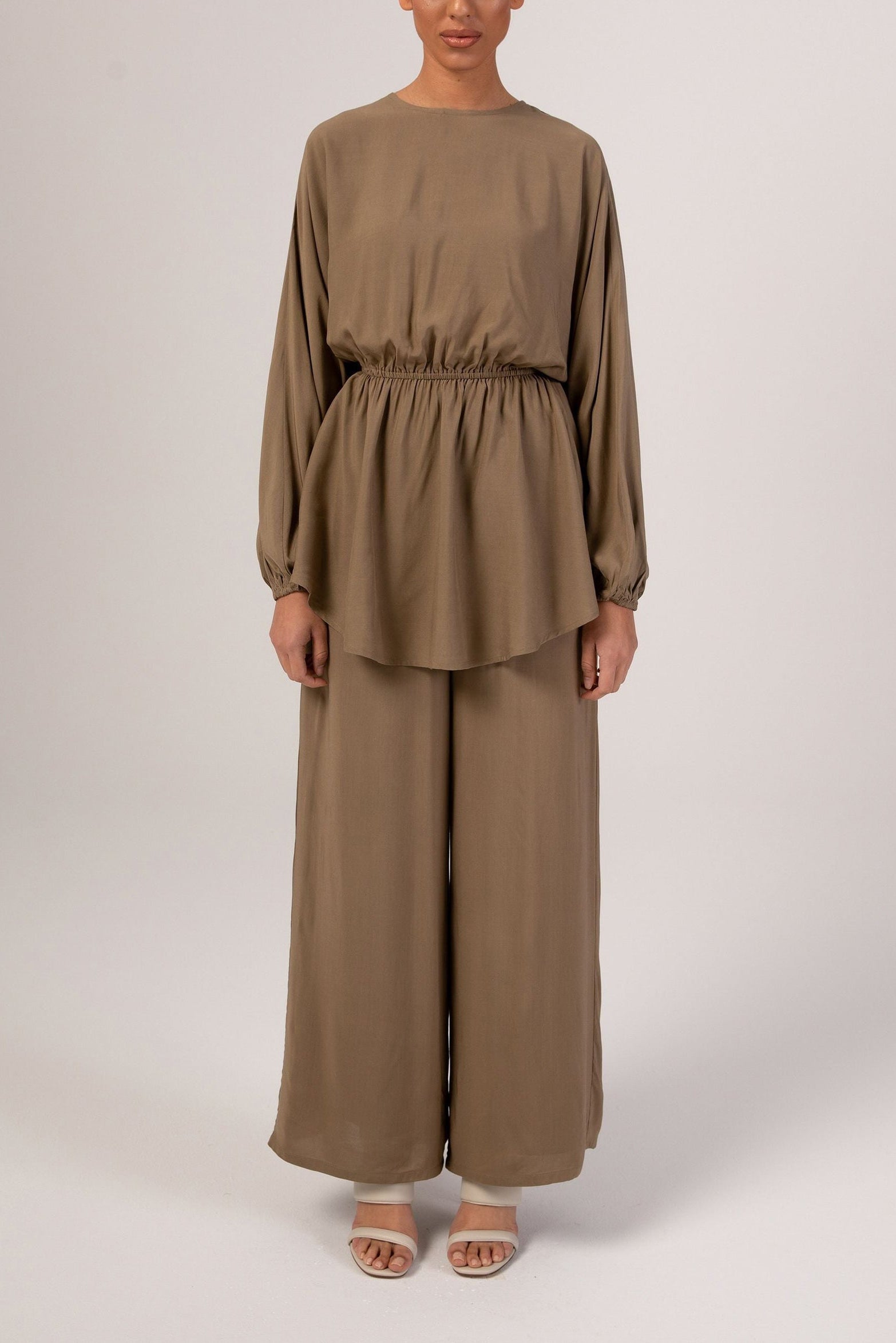 The Hafsa top features a breathable rayon material, a comfortable elastic banded waist and a slouchy batwing sleeve to give the perfect everyday set.