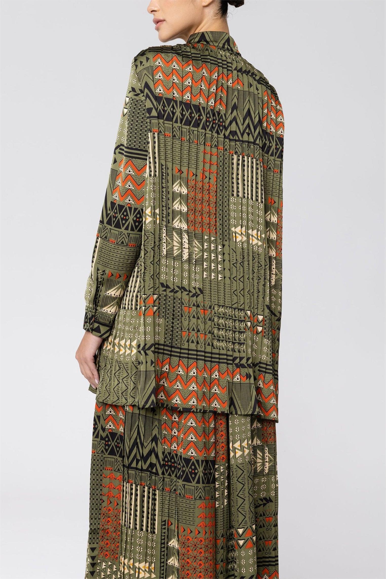 The Heba top features a pleated geometric patterned fabric, button down front, and a modest loose silhouette.