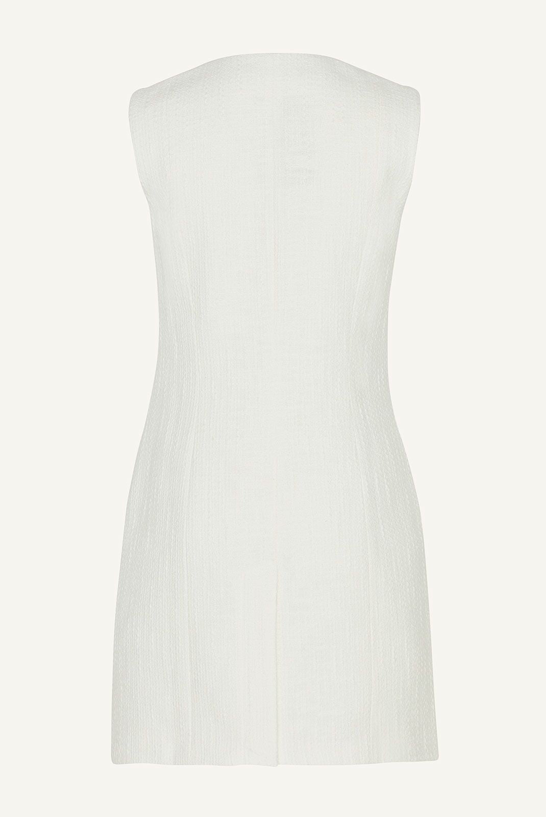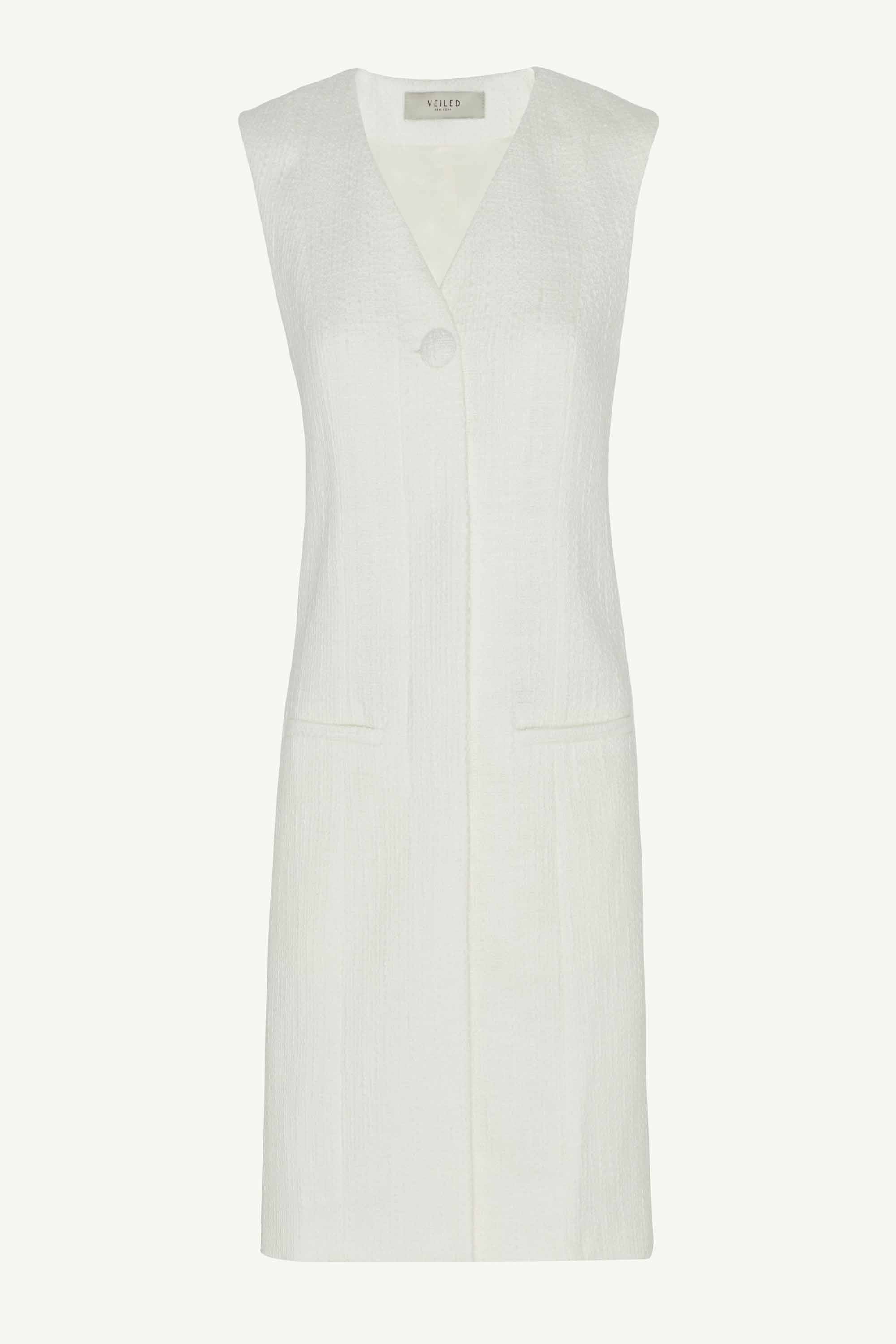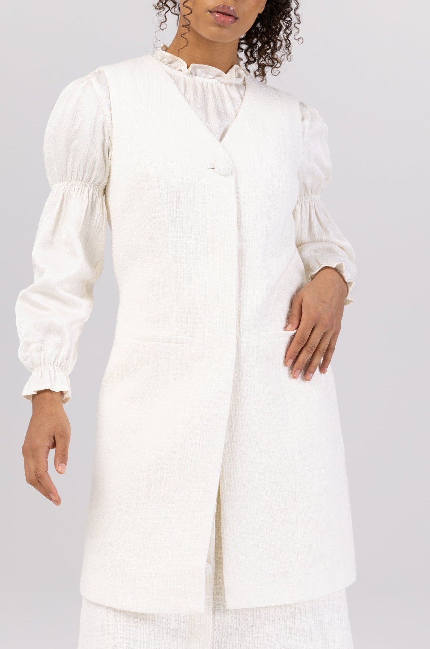 Crafted from sumptuous tweed and tailored for a luxurious fit, the Marcella Vest produced in Portugal adds an air of sophistication and elegance to any ensemble. This pearl-colored top is a timeless piece for your wardrobe.