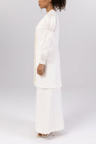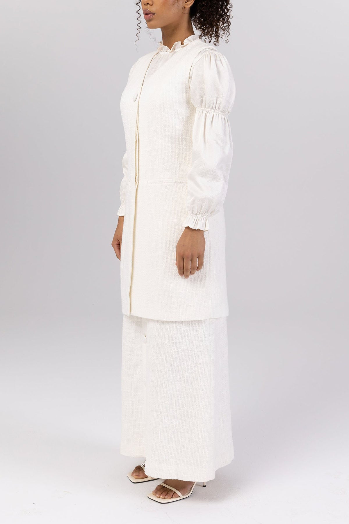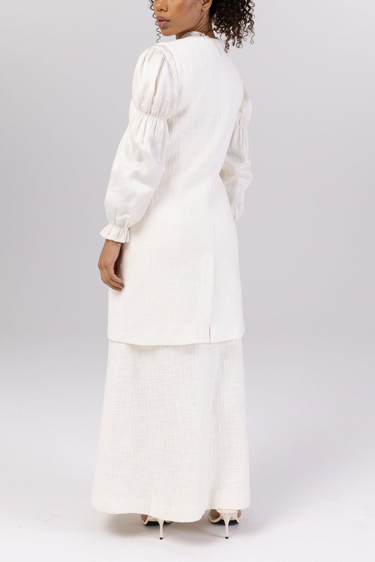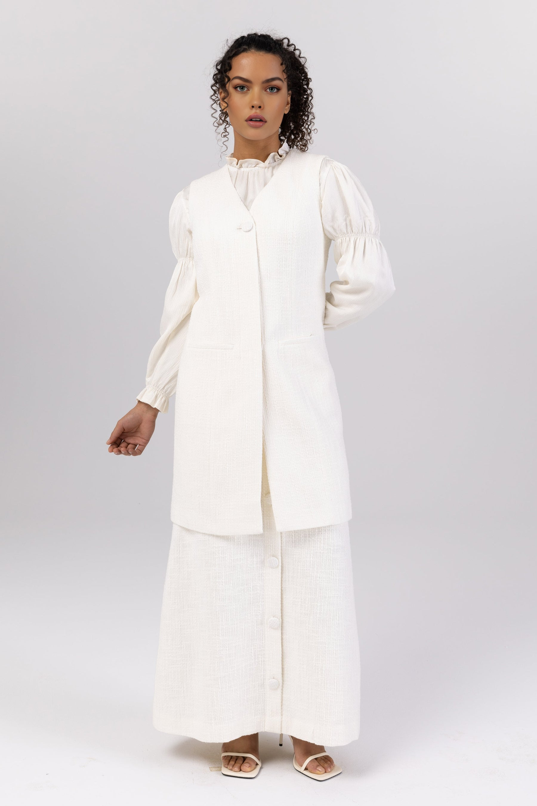 Crafted from sumptuous tweed and tailored for a luxurious fit, the Marcella Vest produced in Portugal adds an air of sophistication and elegance to any ensemble. This pearl-colored top is a timeless piece for your wardrobe.
