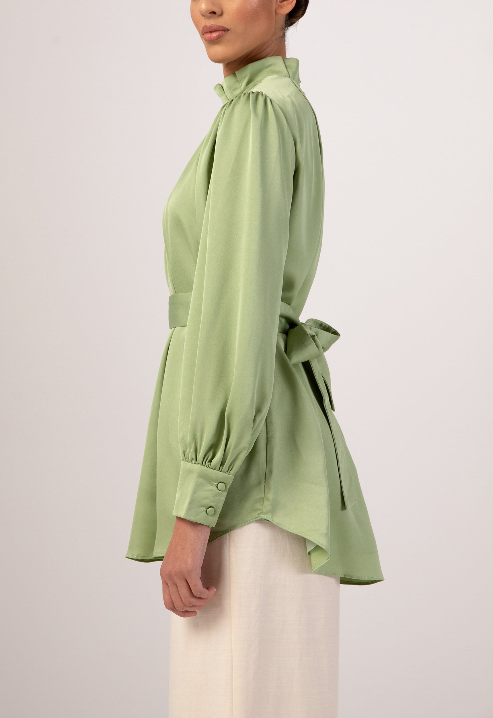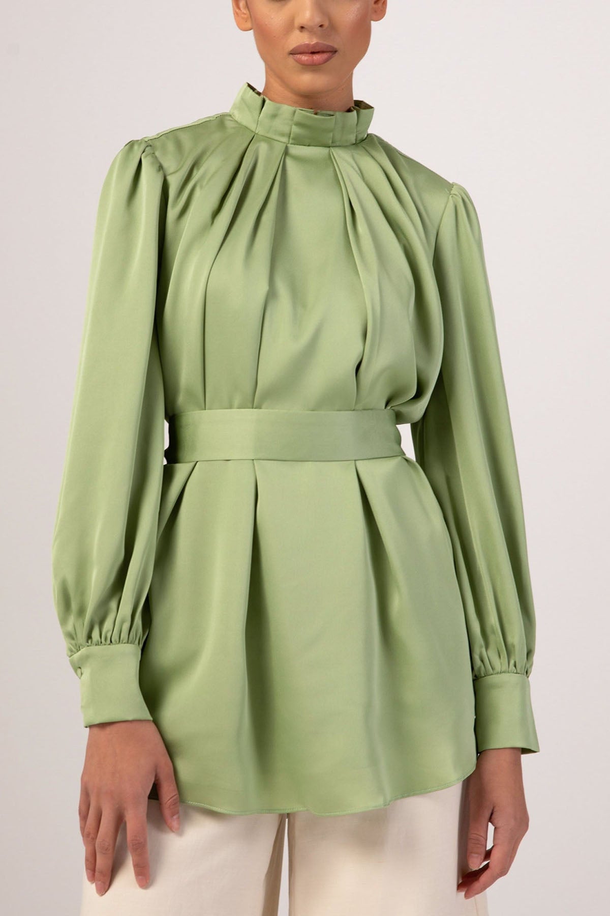 The pleated blouse features a mock neck with pleats, a subtle satin fabric and an adjustable tie waist self fabric belt.