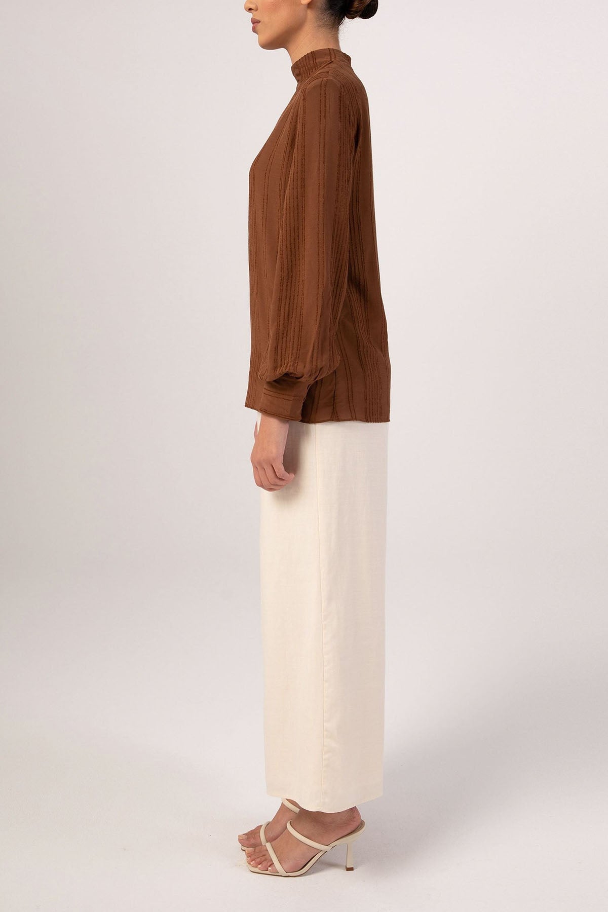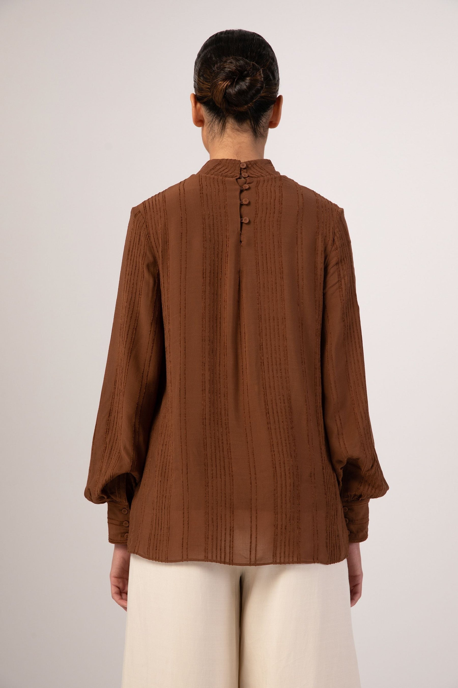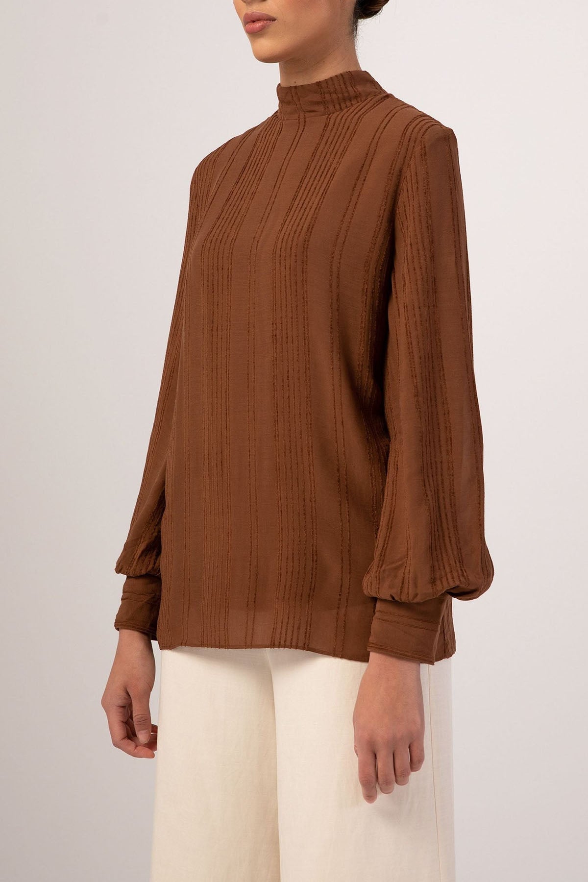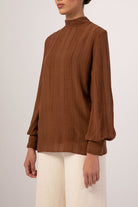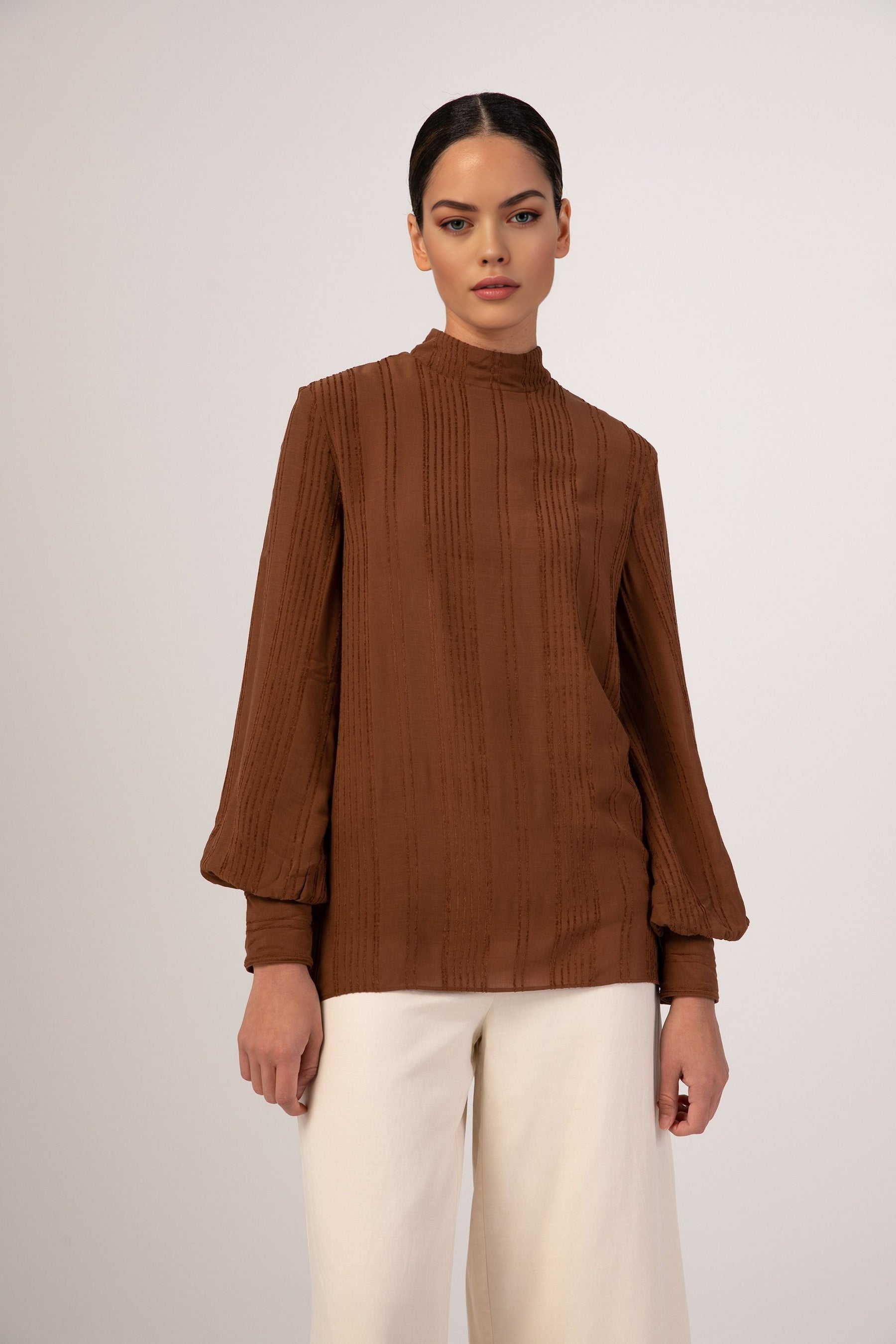 Textured Rayon Balloon Sleeve Blouse - Brown Cocoa