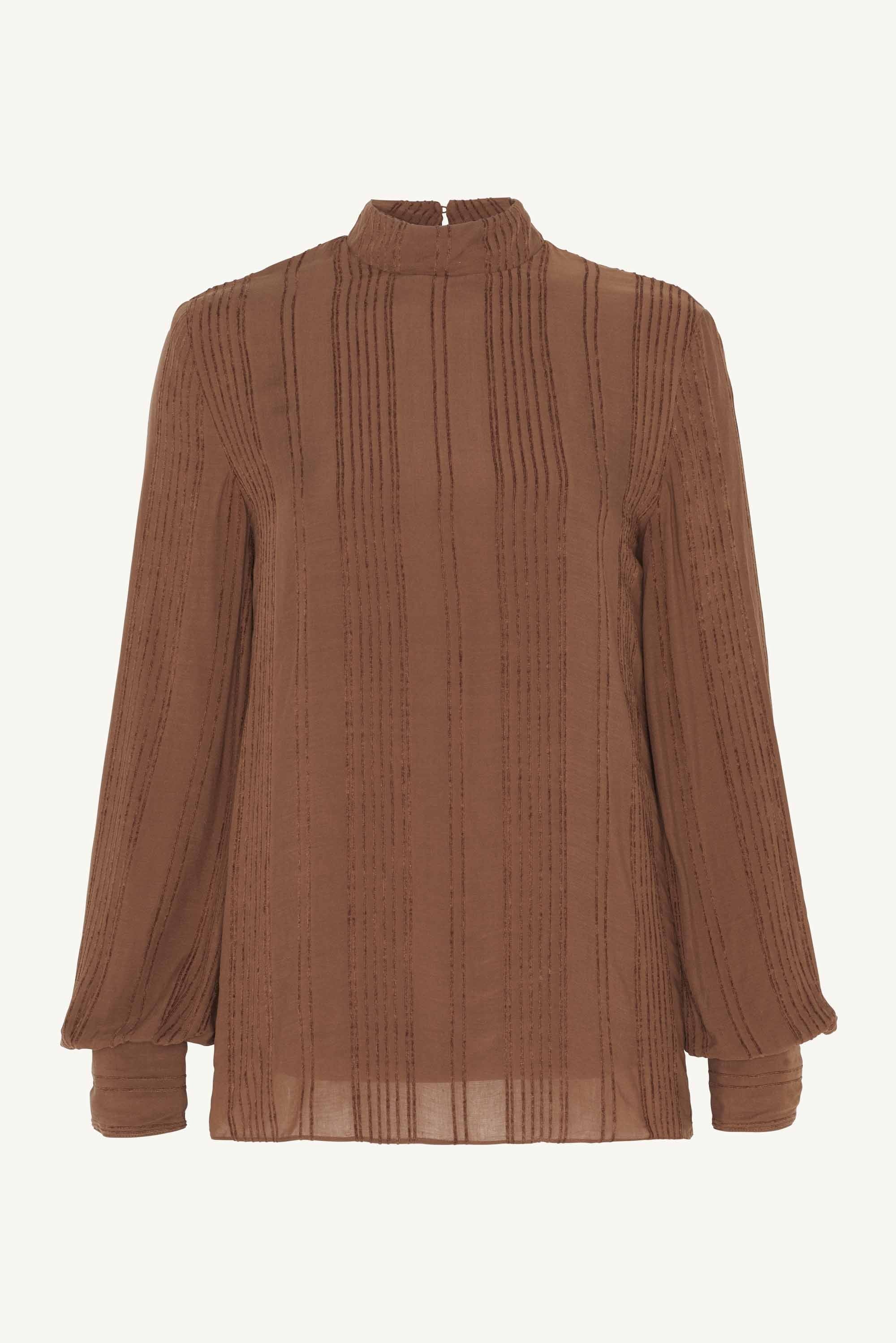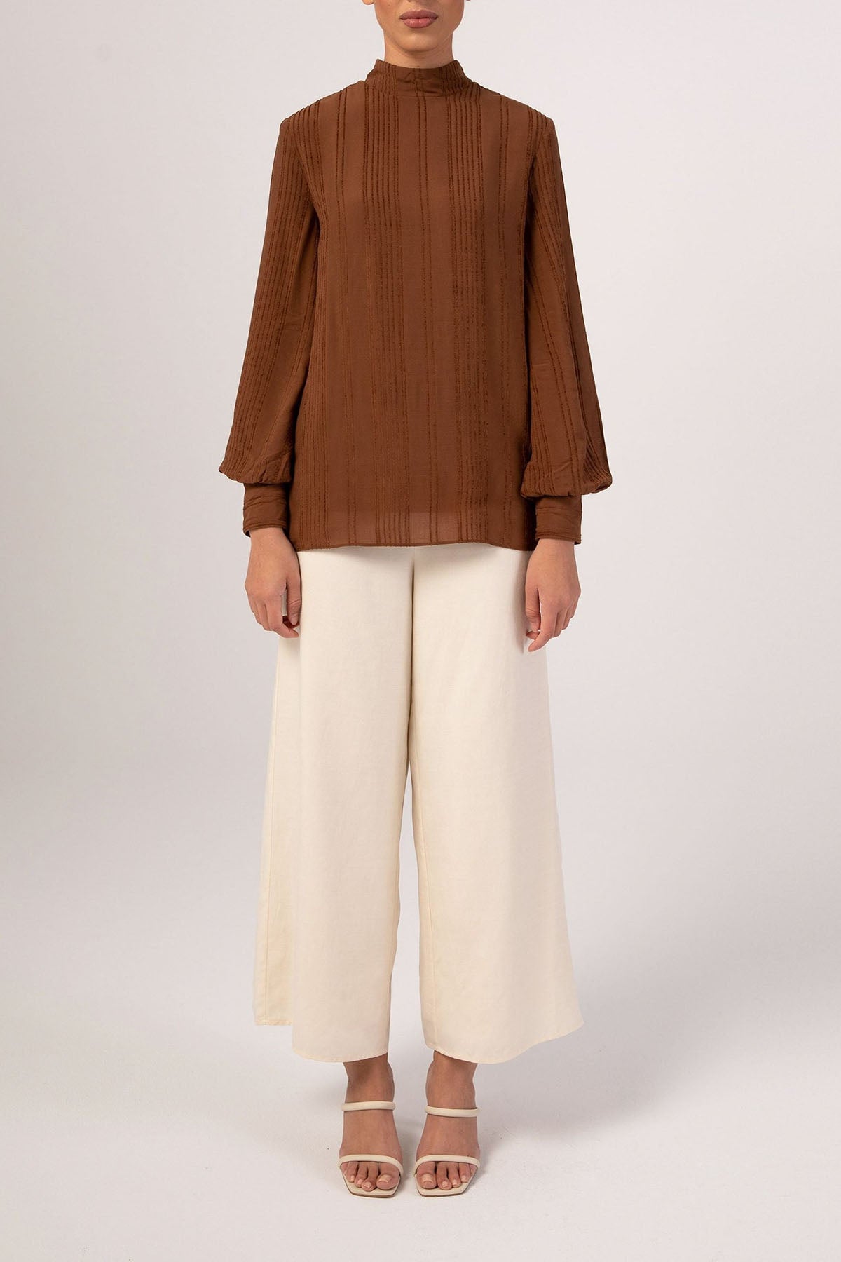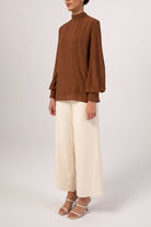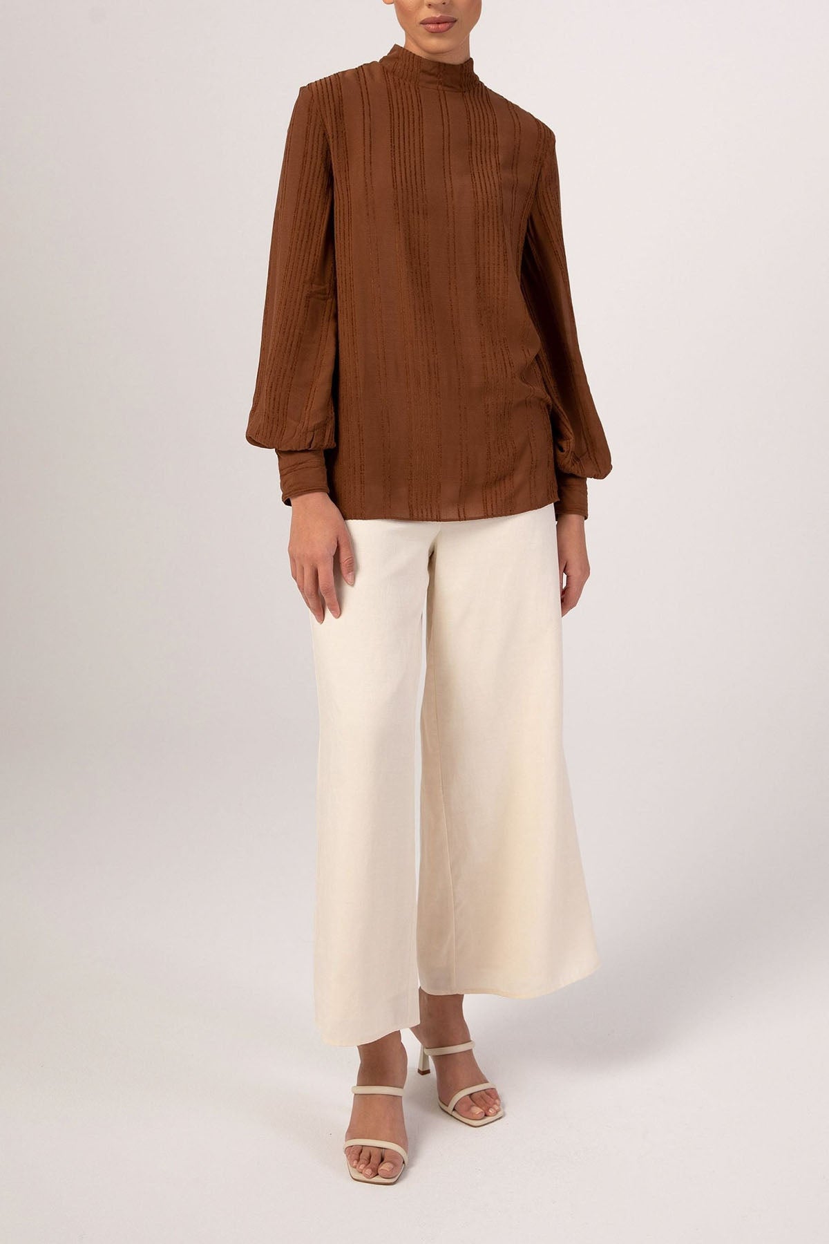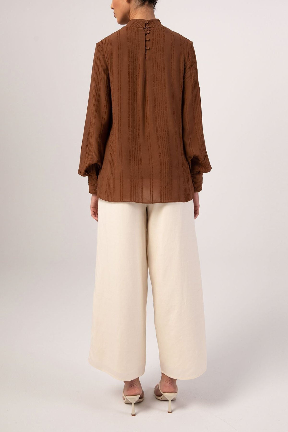 Textured Rayon Balloon Sleeve Blouse - Brown Cocoa