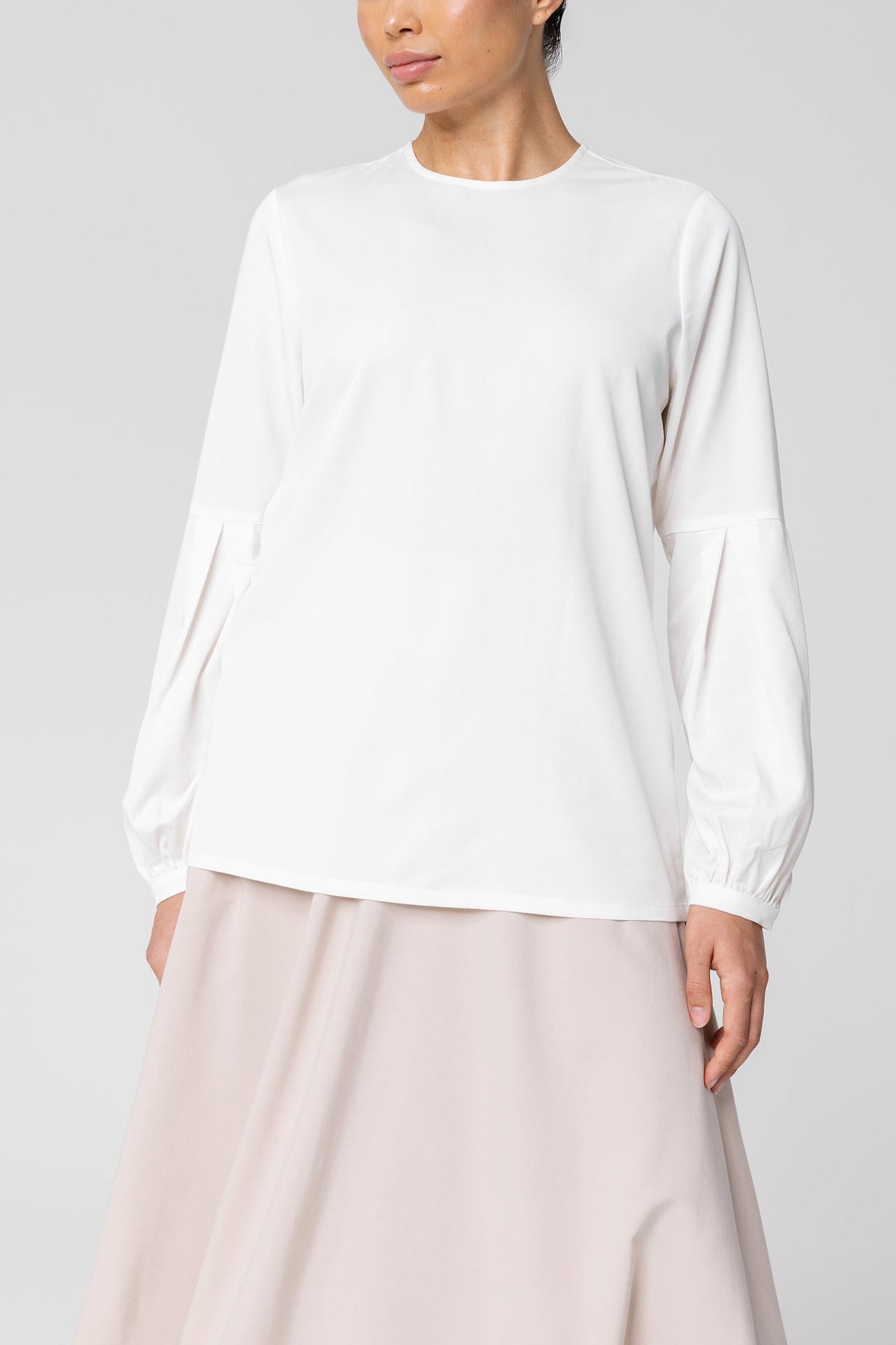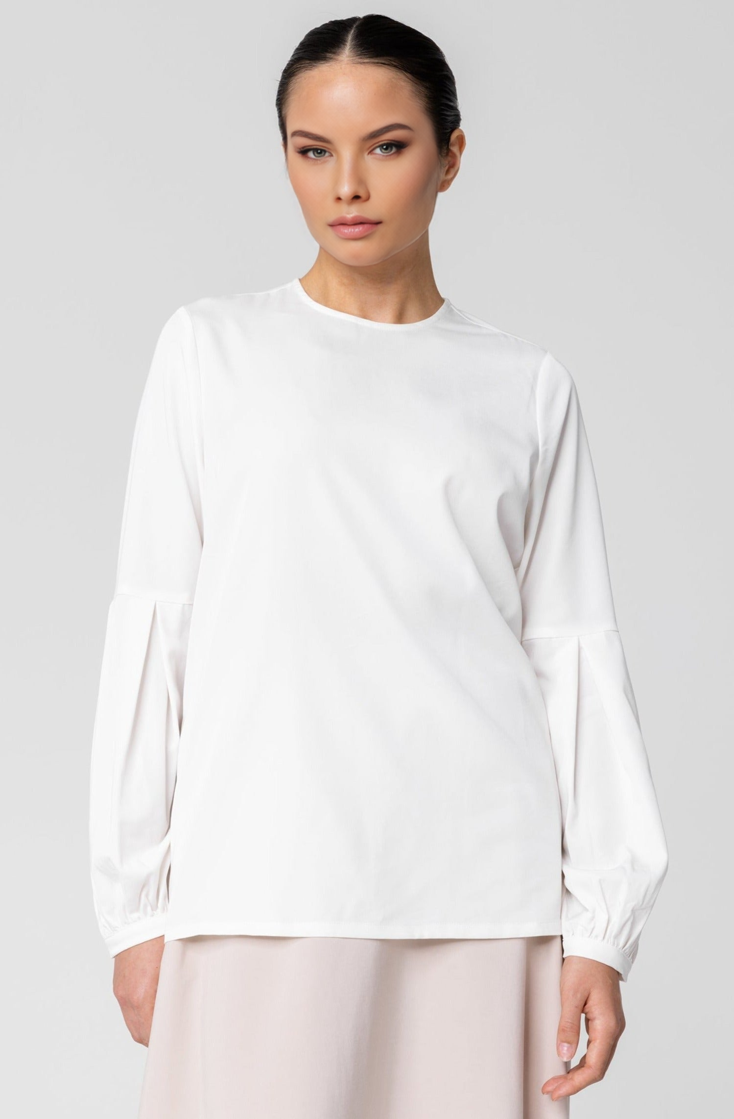 The Valerie top features an ultra soft and breathable cotton blend fabric, feminine balloon sleeves and a modest round neckline.