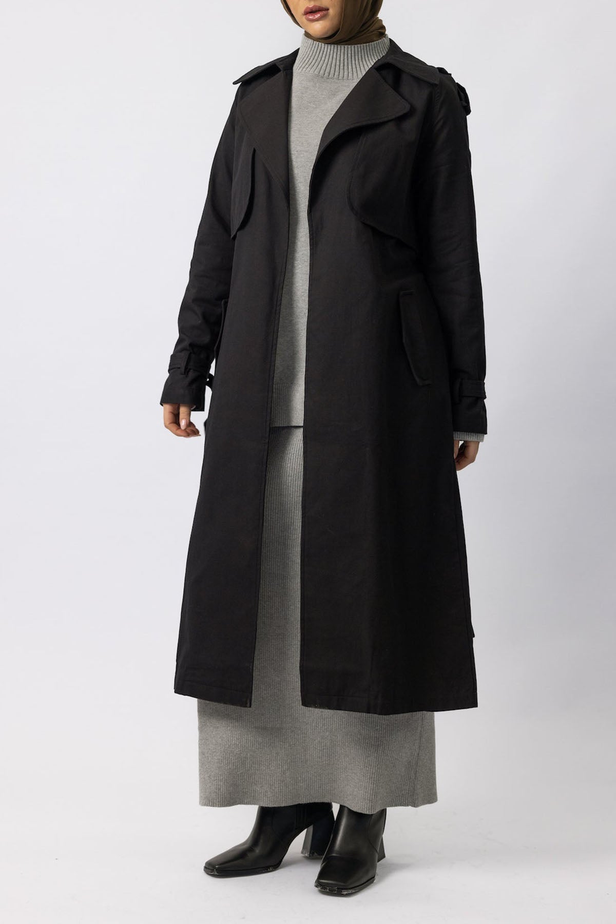 The Harper is the perfect trans-seasonal layering piece. Cut from much-loved cotton, this women's winter coat features a self-tie belt, providing you with the option to wear it loose or to cinch in the waist, side pockets for convenience and ankle-length silhouette for maximum cool weather protection. Make a statement this season with this stunning winter coat. Seen here paired with the 'HIBA' Essential Knit Sweater and 'HIBA' Essential Knit Pants. Perfectly paired here with the from Second Skiin.