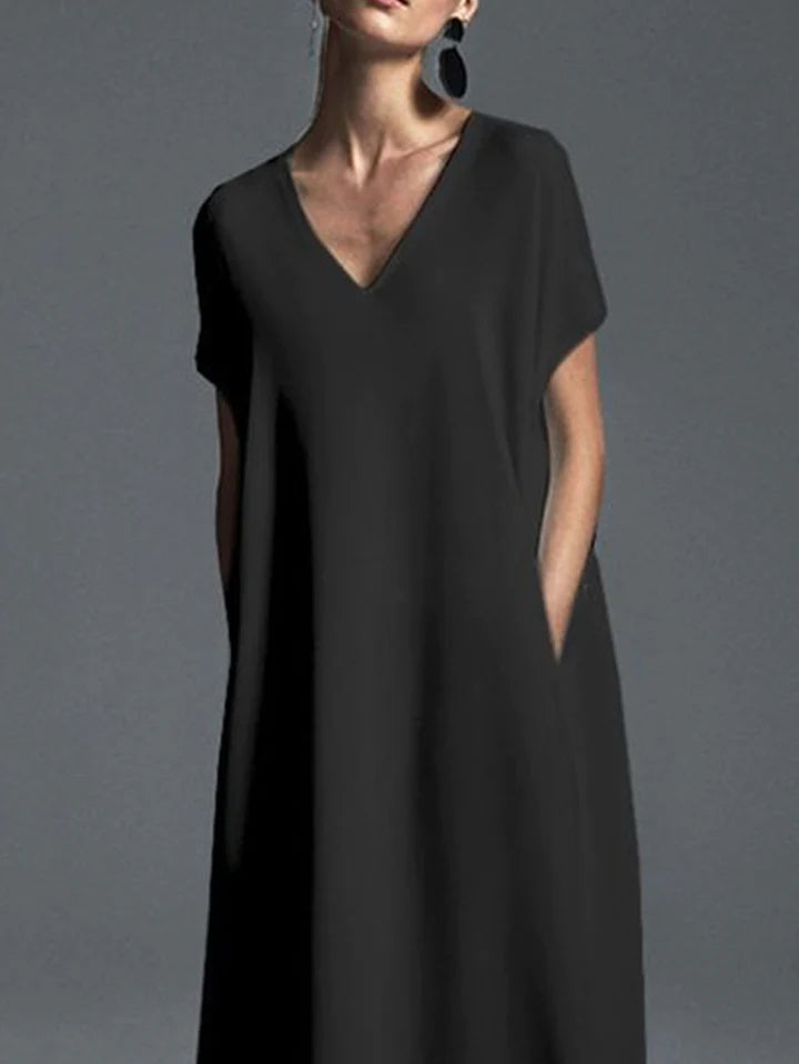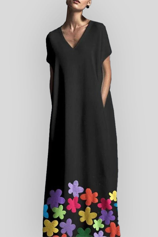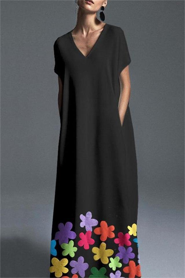 Elegant Plain Floral V Neck Short Sleeve Loose Pocket Maxi Shift Dress