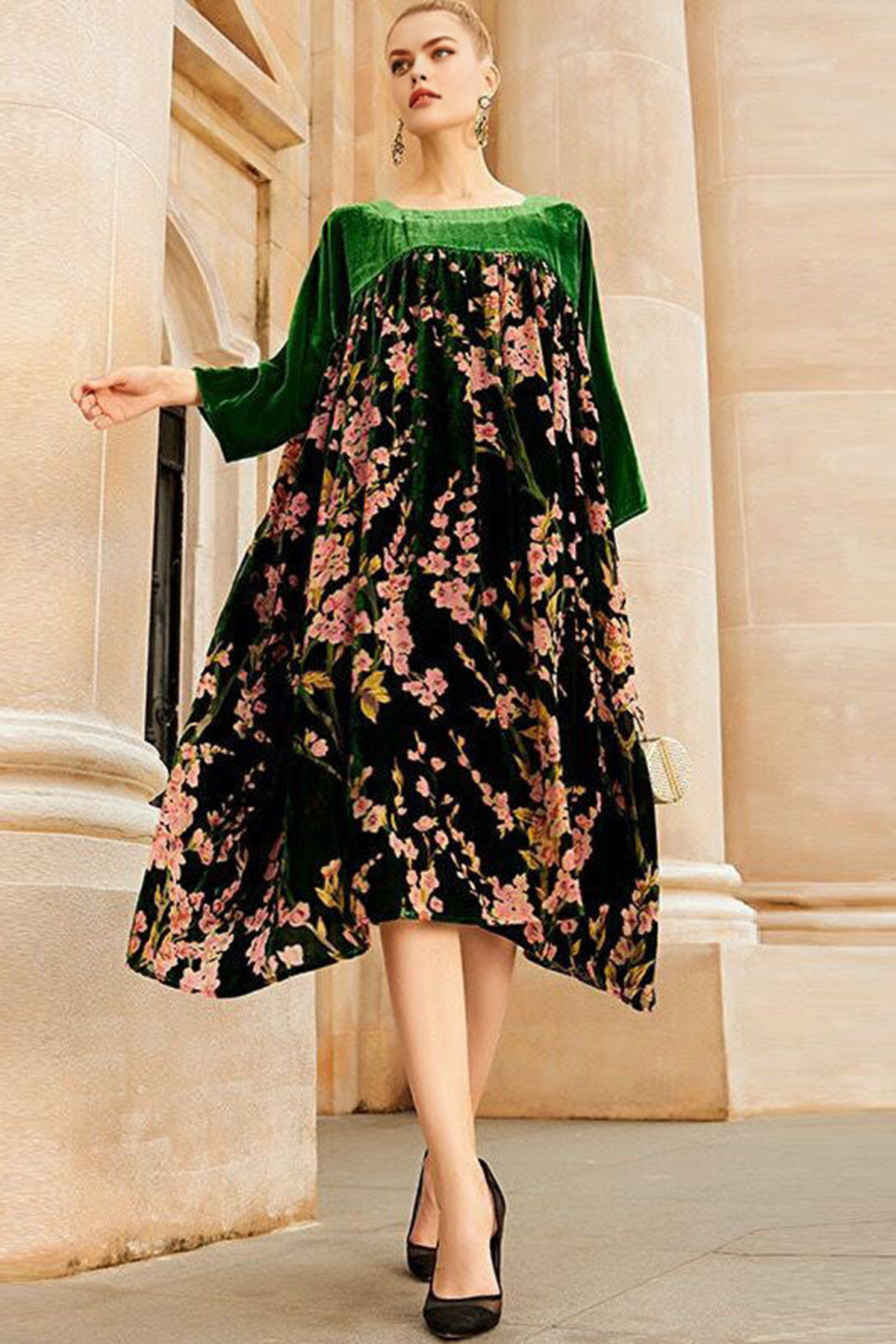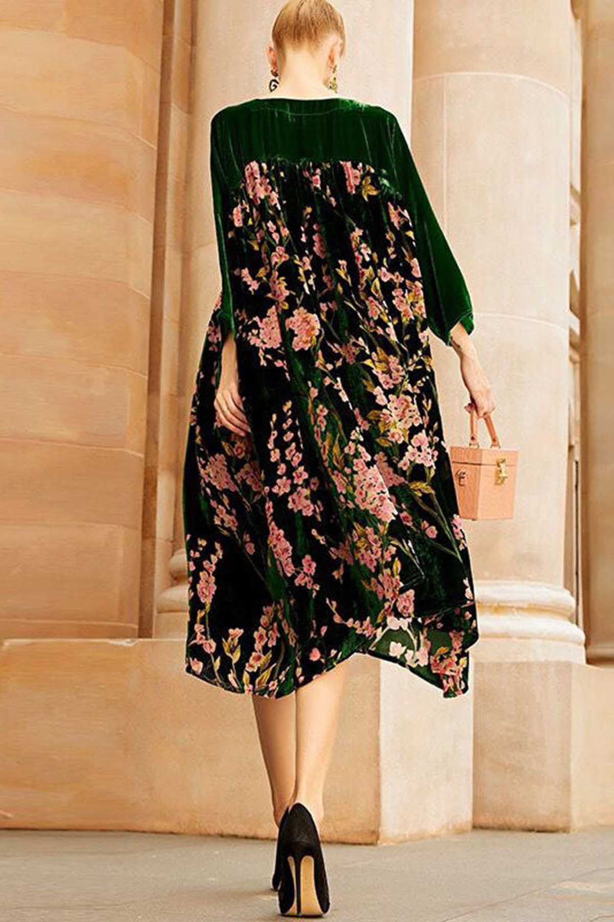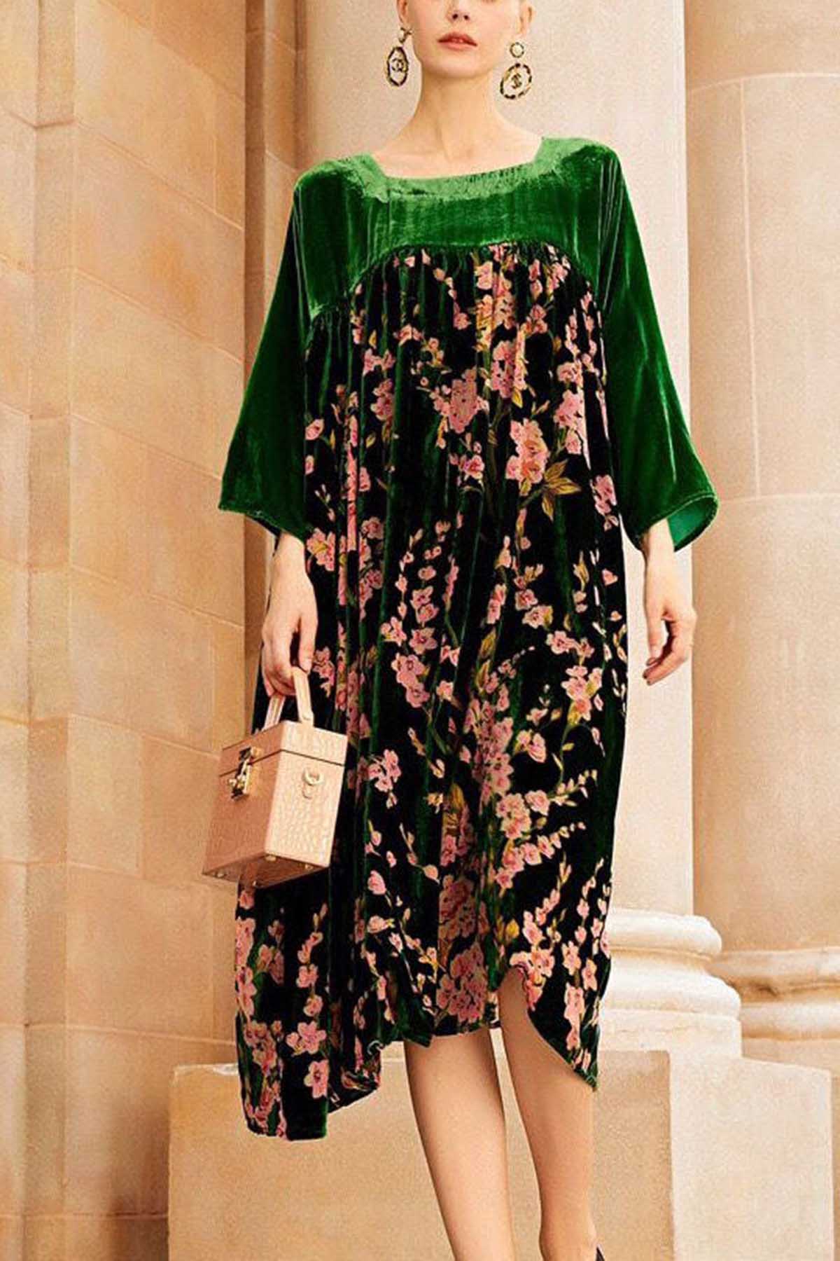 Plus Size Green Patchwork Print Velour Dresses