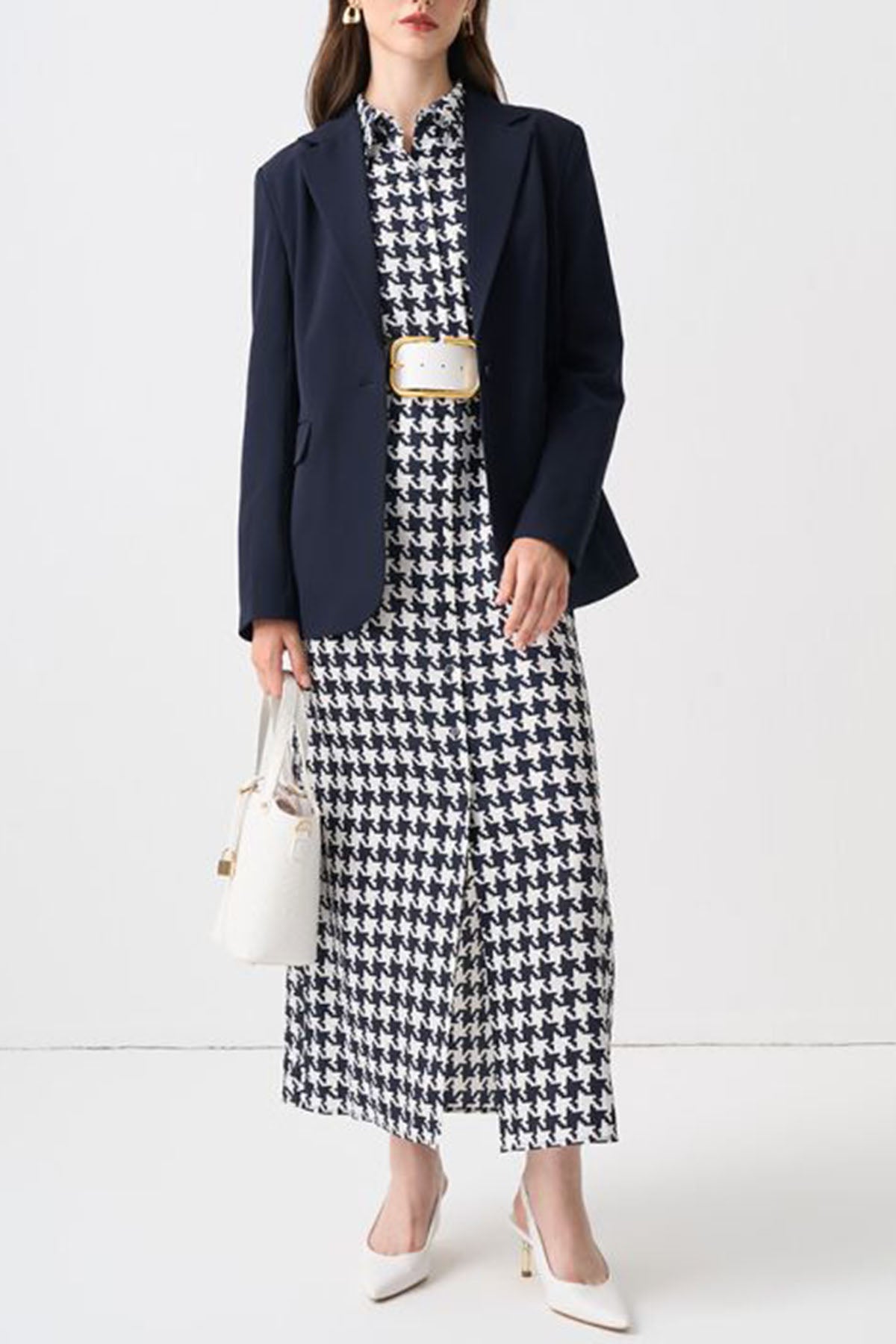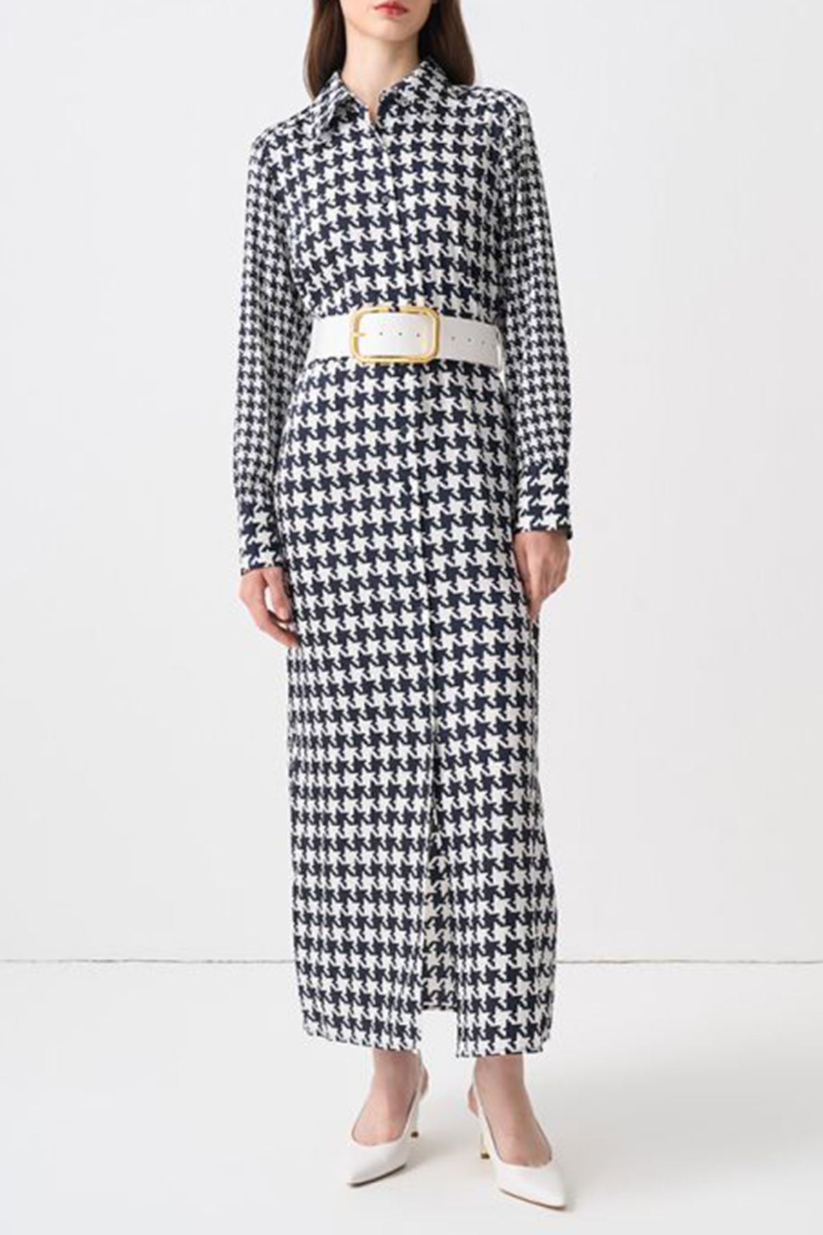 Houndstooth Pattern Belted Maxi Shirt Dress