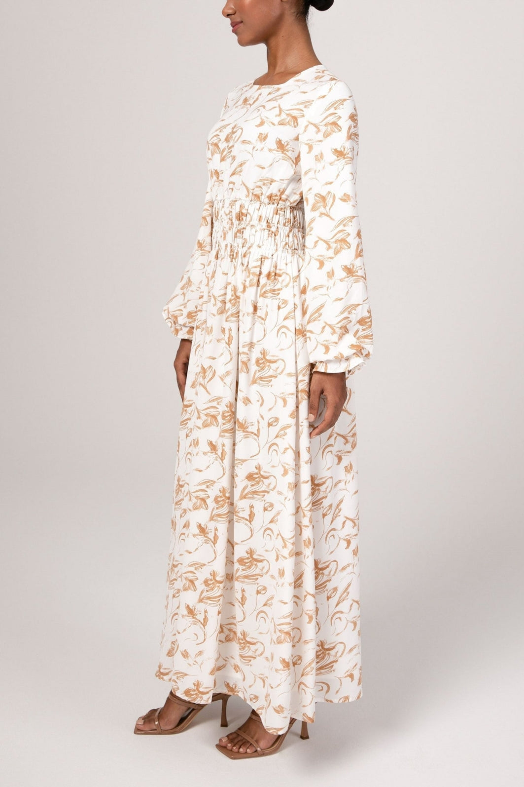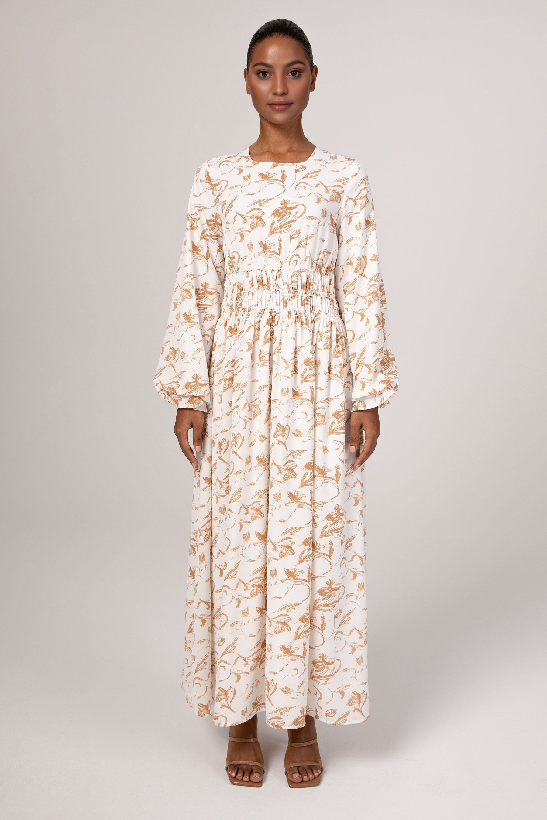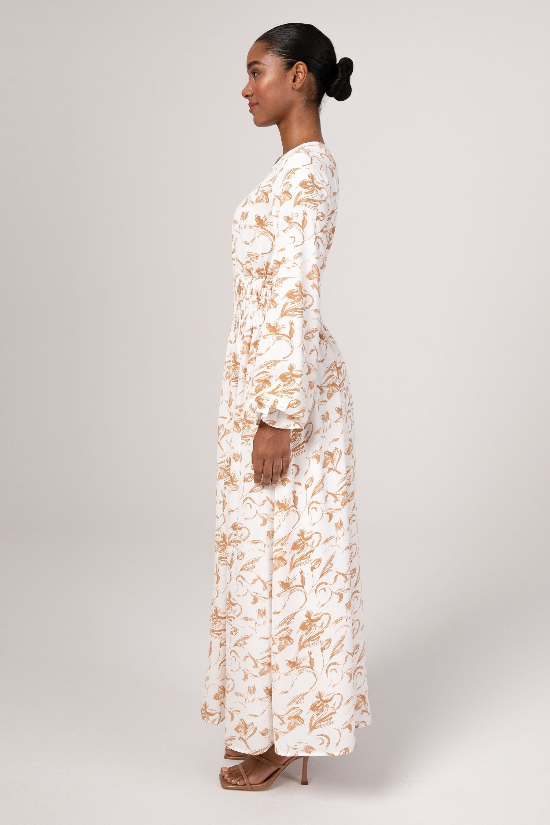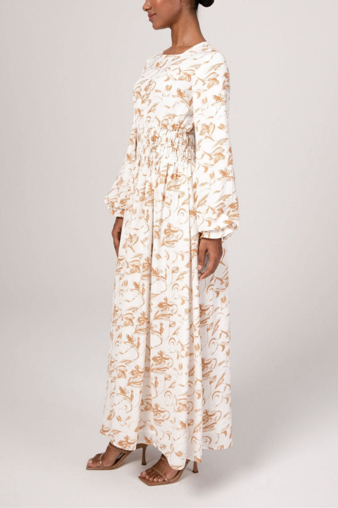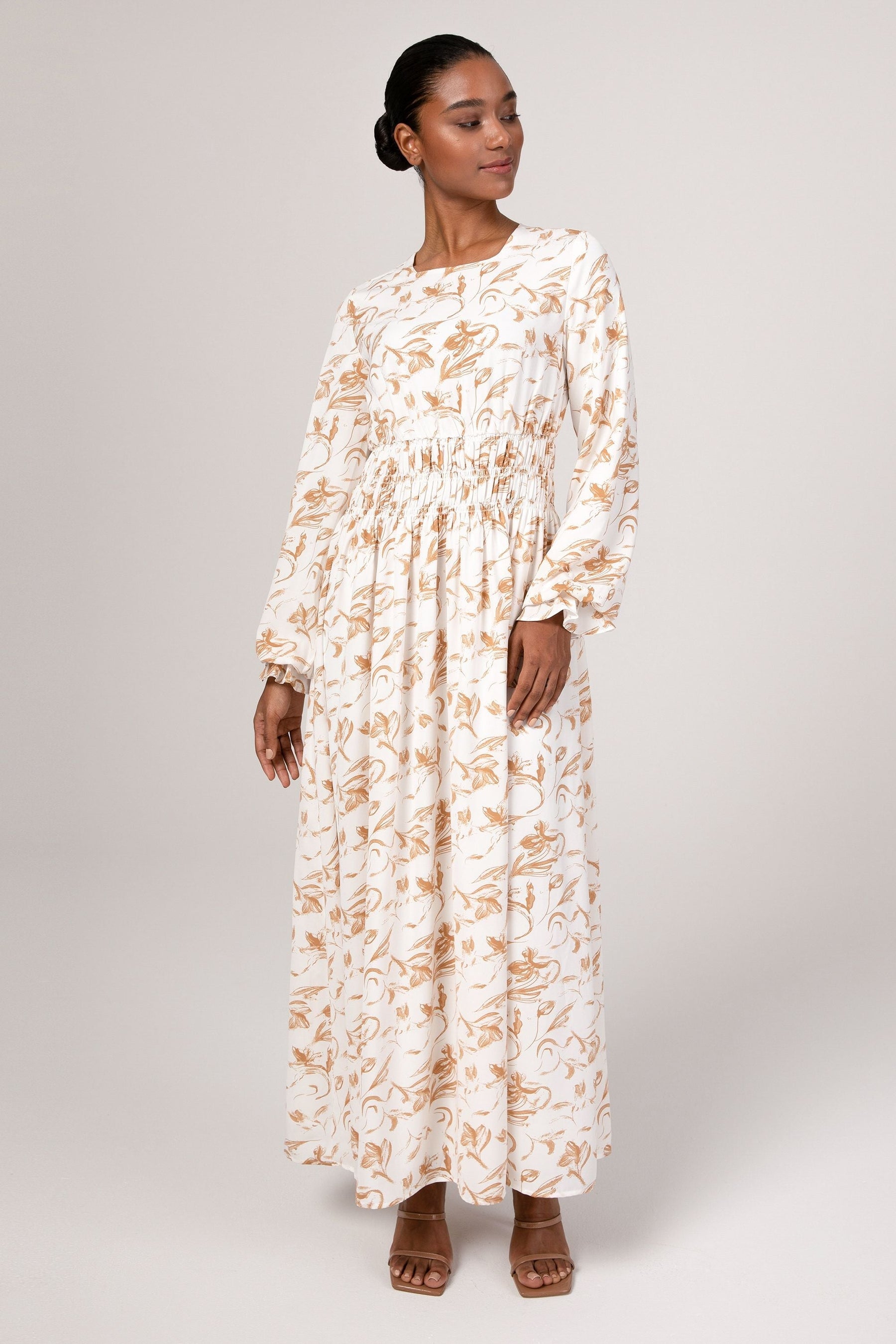 The Ikram maxi dress features a feminine rouched waist, elastic cinched sleeves and a flowy bodice.